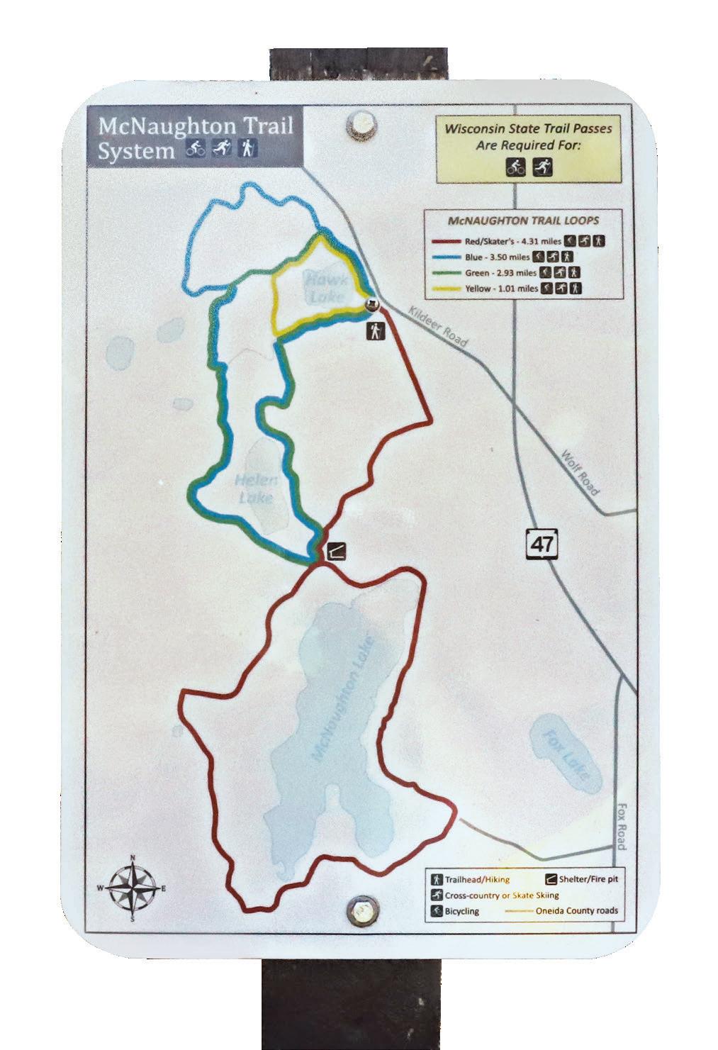 The McNaughton Trail System is great for beginners, as it follows old logging roads. The 10 miles of trail in the Madeline Lake System are wide and generally easy, winding through thick forest and past pretty Madeline Lake. The paths at Lumberjack require a little more effort, as they roll over grass, dirt, rocks and sand while showcasing the Manitowish River, Fishtrap Flowage and White Sand Lake. In winter, two loops are packed for fat tire biking. The 14.5 miles of trail at Raven are for intermediate and advanced riders, and include a skills course with log rides, bridges, teeter-totters and rock areas. ew