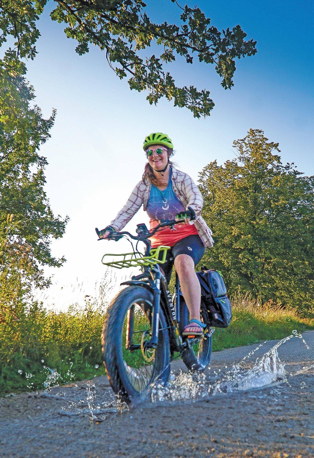 “Fat bikes can go everywhere — singletrack, gravel, muddy terrain, snow and even sand, which is great when you’re in a state on the Great Lakes,” she says. “You just float over everything.”