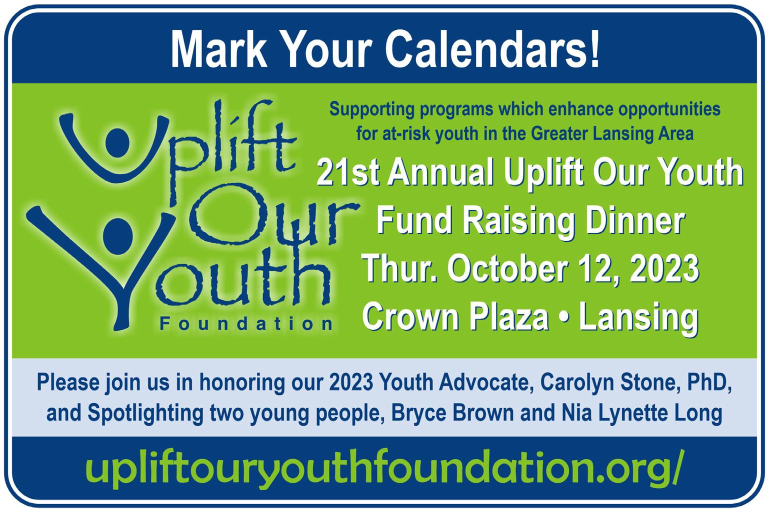 The Uplift Our Youth Foundation Board of Directors has announced its 21st Annual Grant Awards and Fund-Raising Event is scheduled for Thursday, October 12th at the Crowne Plaza Hotel. The dinner will be celebrating the 22nd year of existence where the foundation has awarded over $200,000 in grants to organizations that serve at-risk youth in the arts, career training, and other interdisciplinary activities throughout Eaton, Clinton, and Ingham counties.