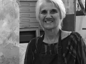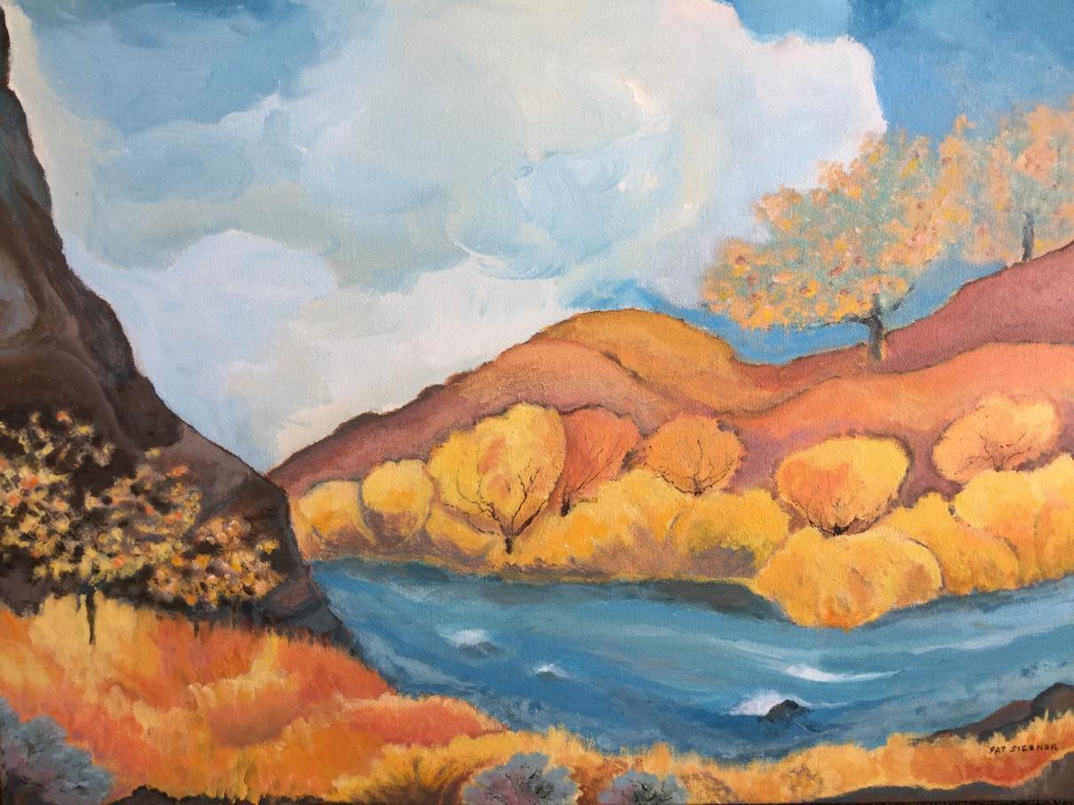 “When I moved to the West, I felt called to a new artistic path in a new place. By painting from my gut instead of my head, with no concern for what the paintings meant or whether they looked like something, I was able to free up an inner person. I began to have a more abstract way of seeing the world. When the work is going well, I am caught up in the doing of my art. I hope that the viewer will n somethin meanin or is moved in some way. If so we have communicated.”