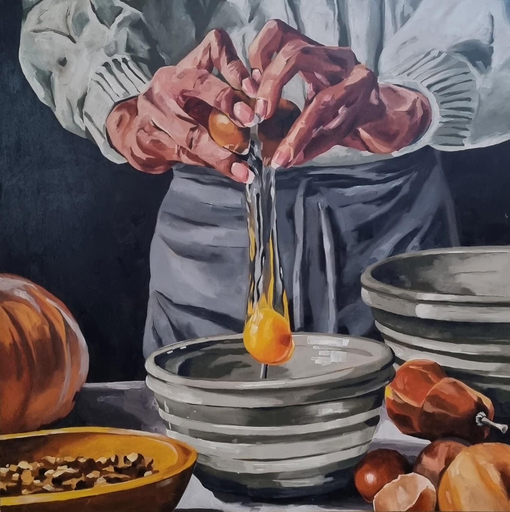 A lone rider beneath twin suns, crossing a stark terrain—Vanessa Wilson’s ‘The Crossing’ is more than a scene; it’s a metaphor. Rooted in her reflections on 1970s gender roles, Wilson’s paintings explore solitude, resilience, and masculinity through a cinematic visual style. Her work carries a sense of movement—of becoming— inviting viewers to reflect on their own journey across landscapes both internal and social.