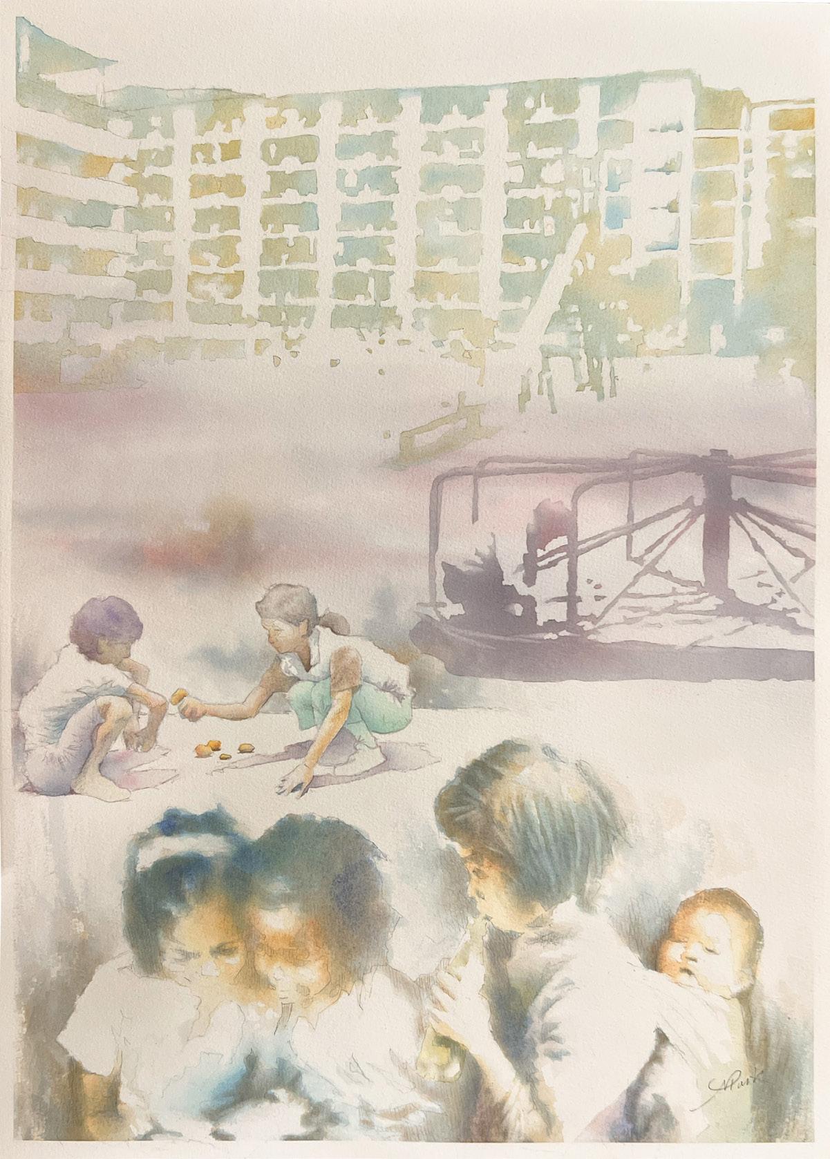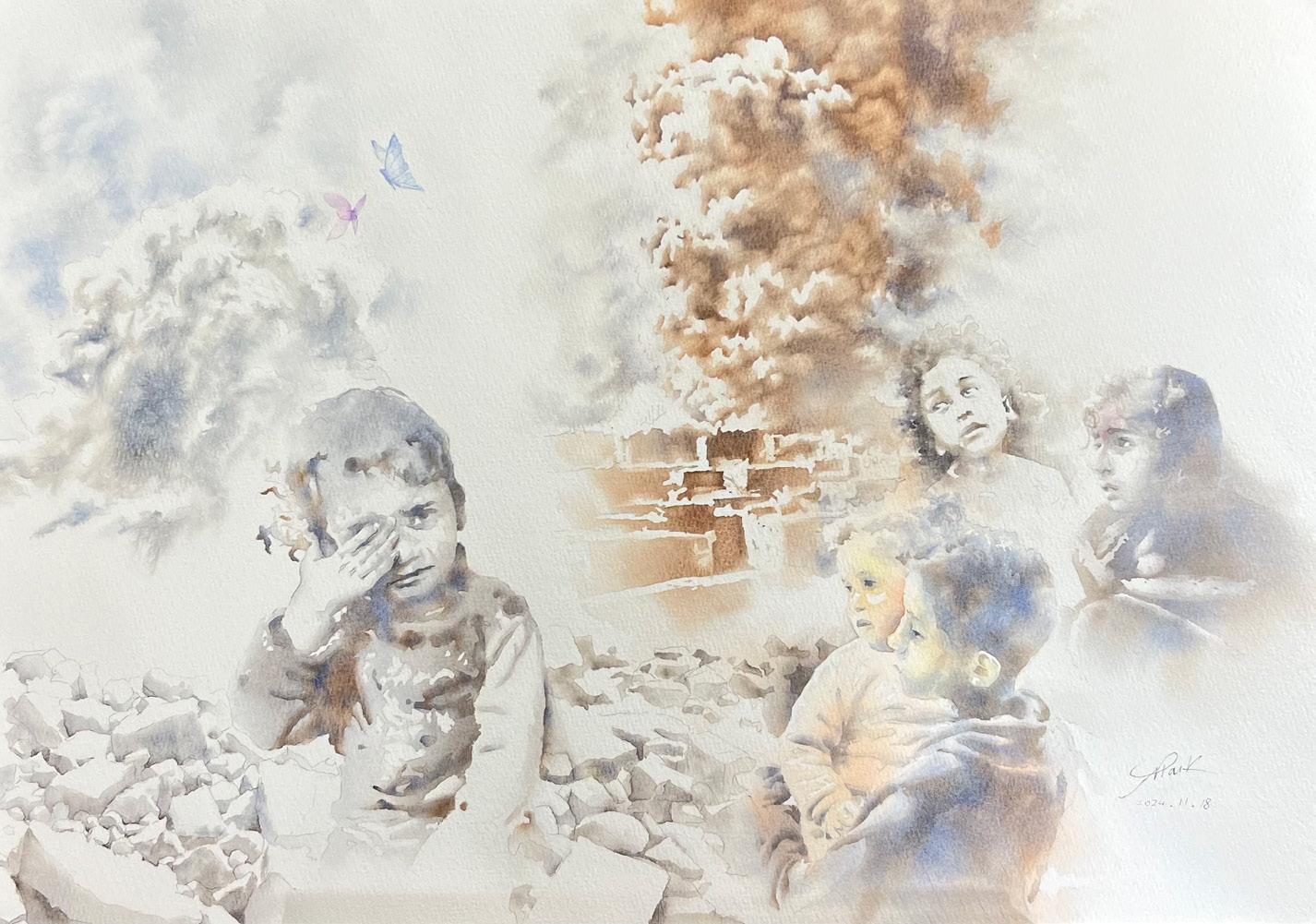 “In the above watercolor, by observing the children’s expressions, you may sense the deeper emotions, including confusion, sadness, helplessness and longing. Through the eyes of the children, you can easily find where the hope is.