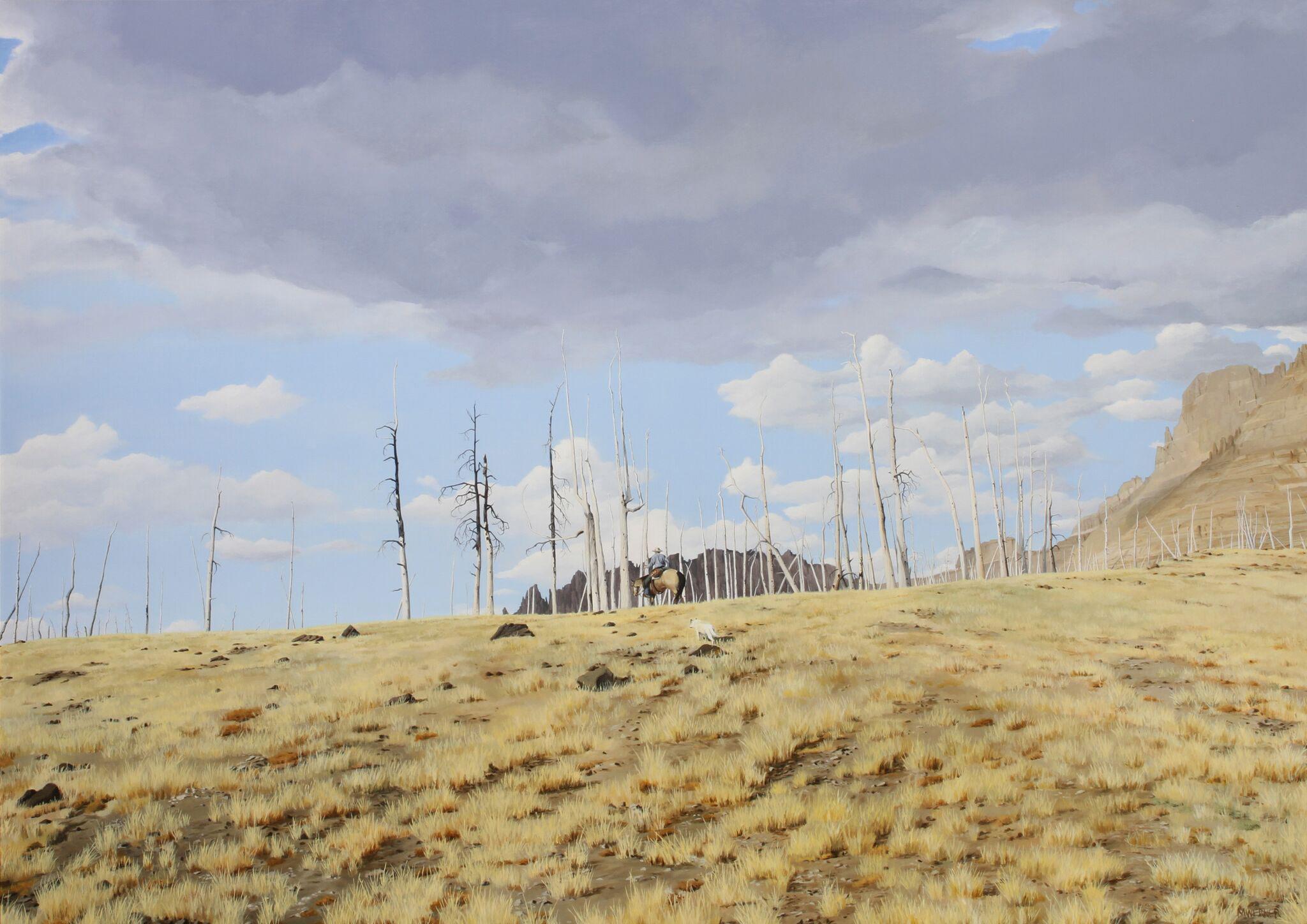 Max Werner’s Entering the Ghost Forest captures a profound sense of solitude and resilience. A lone rider traverses a vast, quiet landscape, dwarfed by skeletal trees and an expansive sky. The delicate interplay of soft light, muted tones, and precise detail enhances the scene’s meditative quality. Werner’s restrained composition evokes both the grandeur and fragility of nature, inviting contemplation.