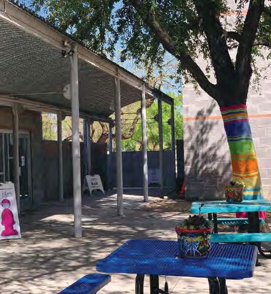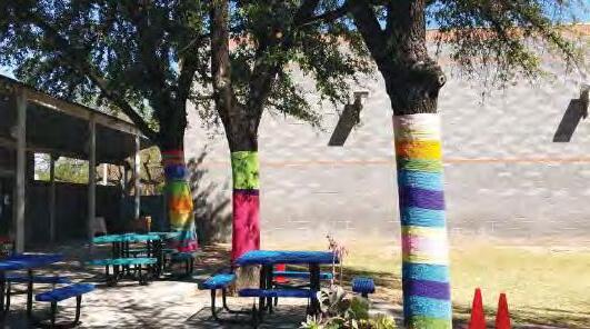 TABLES/CHAIRS YARN WRAPS AROUND TREES POTS AND LANDSCAPE IN TREE WELLS WATER FEATURE POT ROCK LINED PATH