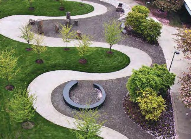 To separate the space between the texture trails area and the employee courtyard and utility space, we propose an LID stormwater capture technique. This will channel the existing downspout into a raised curb planter. The planter will contain a vegetated barrier with controlled opening between the spaces. Within the texture trails space further design options will be developed: One, a smaller break out patio leading to a “forest“ path, and another with a central patio space with denser and more diverse planting materials surrounding it.