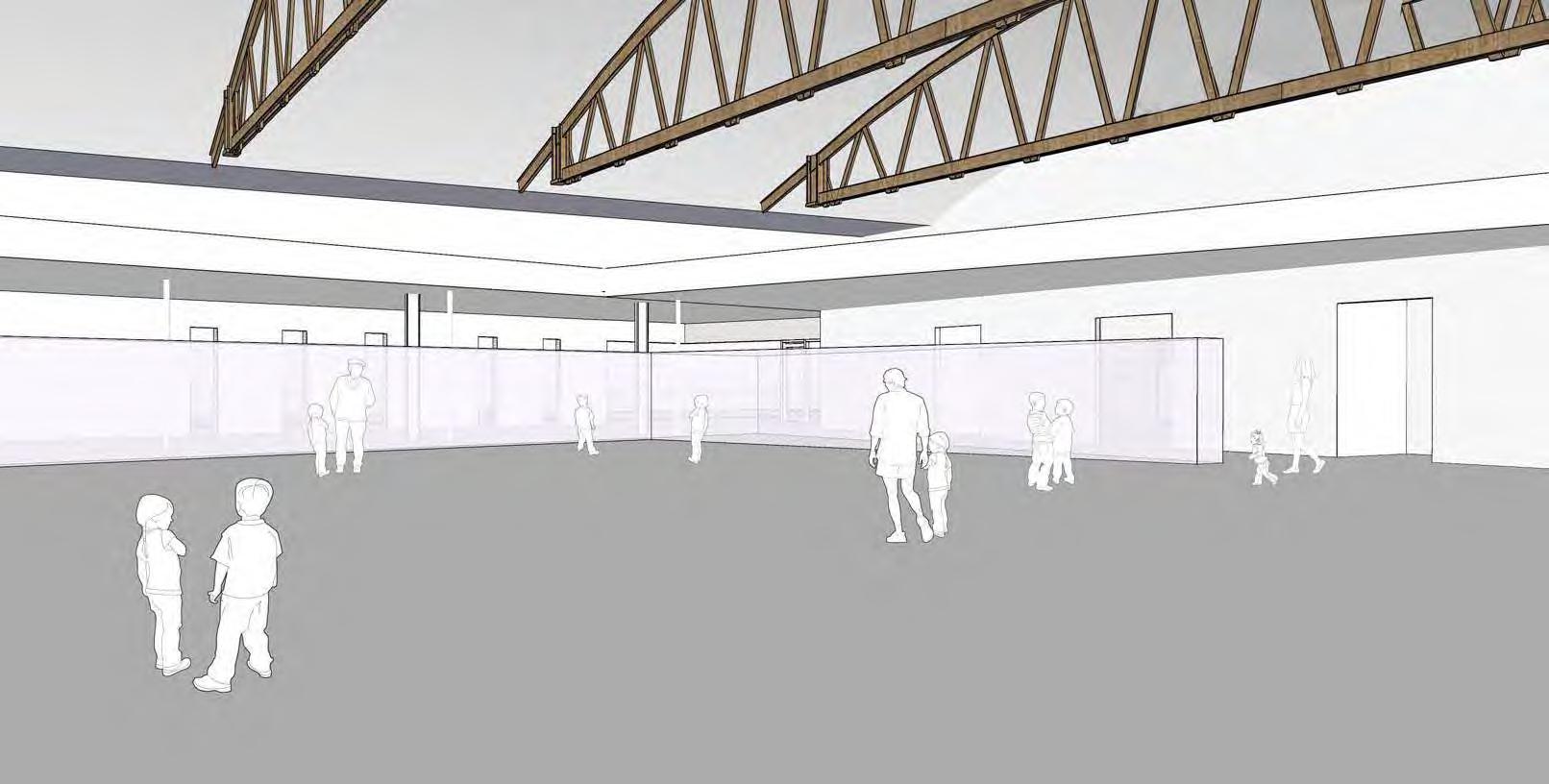 • Existing air handler unit that serves current Exhibit area can remain. Scope to demo finished ceiling and exposed wood truss girders + purlins will cause some level of redesign existing duct locations + routing and should be included as scope for pricing exercise.