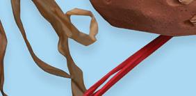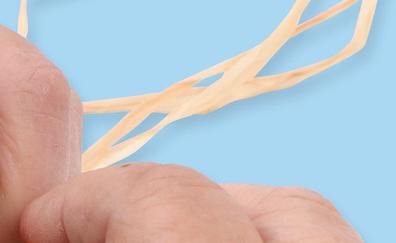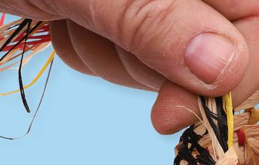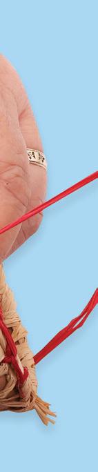 7. Take one strand of your next choice of coloured ra a. We have used red. Tie one end to the core strands. Thread the other end of the ra a onto a needle, then under the core and the woven ra a of the row below.