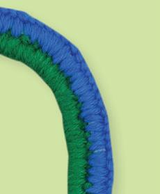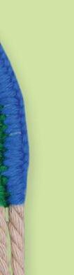 6. Align the 30cm and 32cm pieces of macramé cord, with the green wrapped cord below the blue. From the back, push the needle and blue yarn through the top of the first stitch of the green yarn, creating a loop of blue yarn at the very top