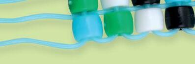 4. Create a pattern using rows of four beads. Thread the first four beads onto the string on the right. Push them up so they sit close to the clip. You can use the same colour pattern as shown or create your own.