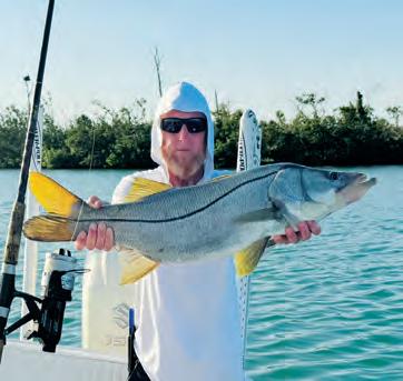 Outgoing tides are my favorite. ey concentrate bait and predators alike into smaller, target-rich areas. Look for drains, bayou mouths, bends, and reef cuts. Even island points can funnel current and stack sh. Once you’ve found the spots, presentation is everything. Reds o en respond to a steady retrieve, trout like a twitch-twitch pause, and ounder react best to a lure darting along the bottom, stirring up a little commotion. Of course, no sh reads the manual — sometimes the “wrong” retrieve produces the right bite. Which brings me to one of the best lessons I’ve learned: sometimes you’ve got to break your own rules. On a recent quarter-moon tide, I worked a shallow grass at with two rods rigged identically except for lure color. One was white with a limetreuse tail, the other pumpkinseed with green glitter. Early on, the reds were all over the pumpkinseed, inhaling it on a fast, steady retrieve just under the surface. But when I noticed trout feeding nearby, I switched things up. Instead of swimming the bait, I bounced it hard o the bottom, fast twitches with short pauses. Suddenly, the trout lit up, and they showed a clear preference for the white limetreuse. at day drove home an important point: don’t get stuck on what’s working. Change the speed, change the color, change the action — sometimes even when the bite is good, it can get better. Covering the same water with di erent retrieves or presentations lets you unlock what di erent species want, even when they’re feeding in the same spot.