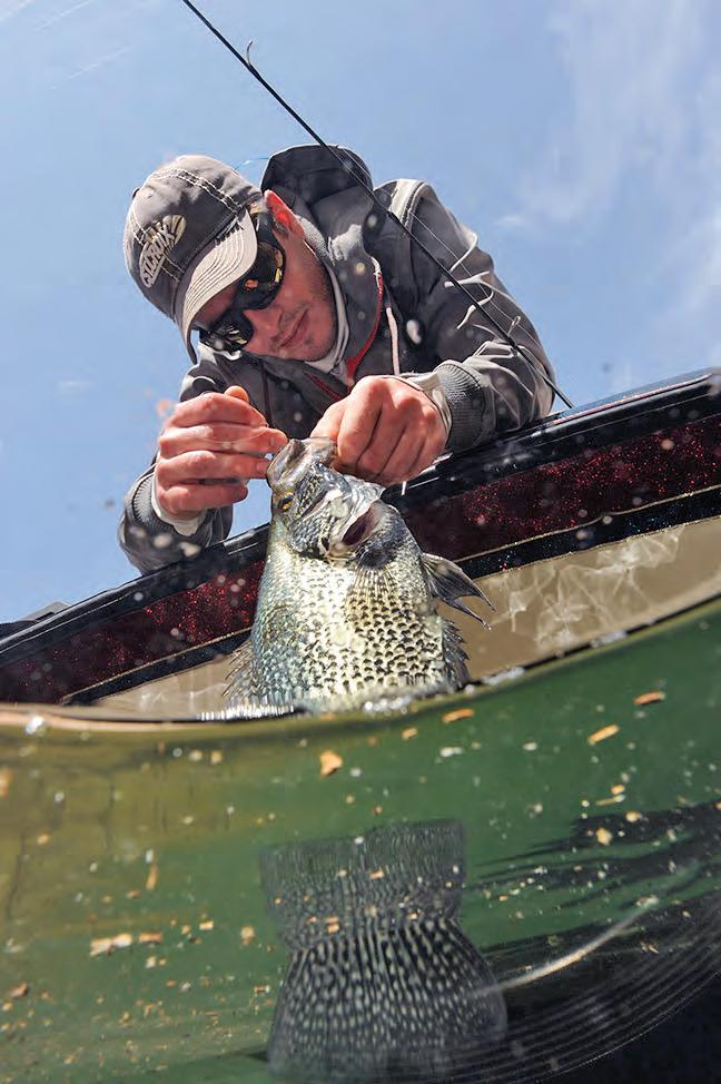 Weather plays a major role, too. On cold, blustery fall days, pan!sh o en slide deeper, becoming more predictable and easier to !nd with electronics. Deep basin areas in 20 to 25 feet of water can light up with schools of crappies—and sometimes bluegills—suspended and ready to bite. ese deeper !sh are o en aggressive, making for a rewarding but ethically sensitive bite. When !shing at those depths, barotrauma becomes a real issue. Released !sh o en don’t survive, even if they swim o , so it’s important to harvest what you catch, regardless of size.