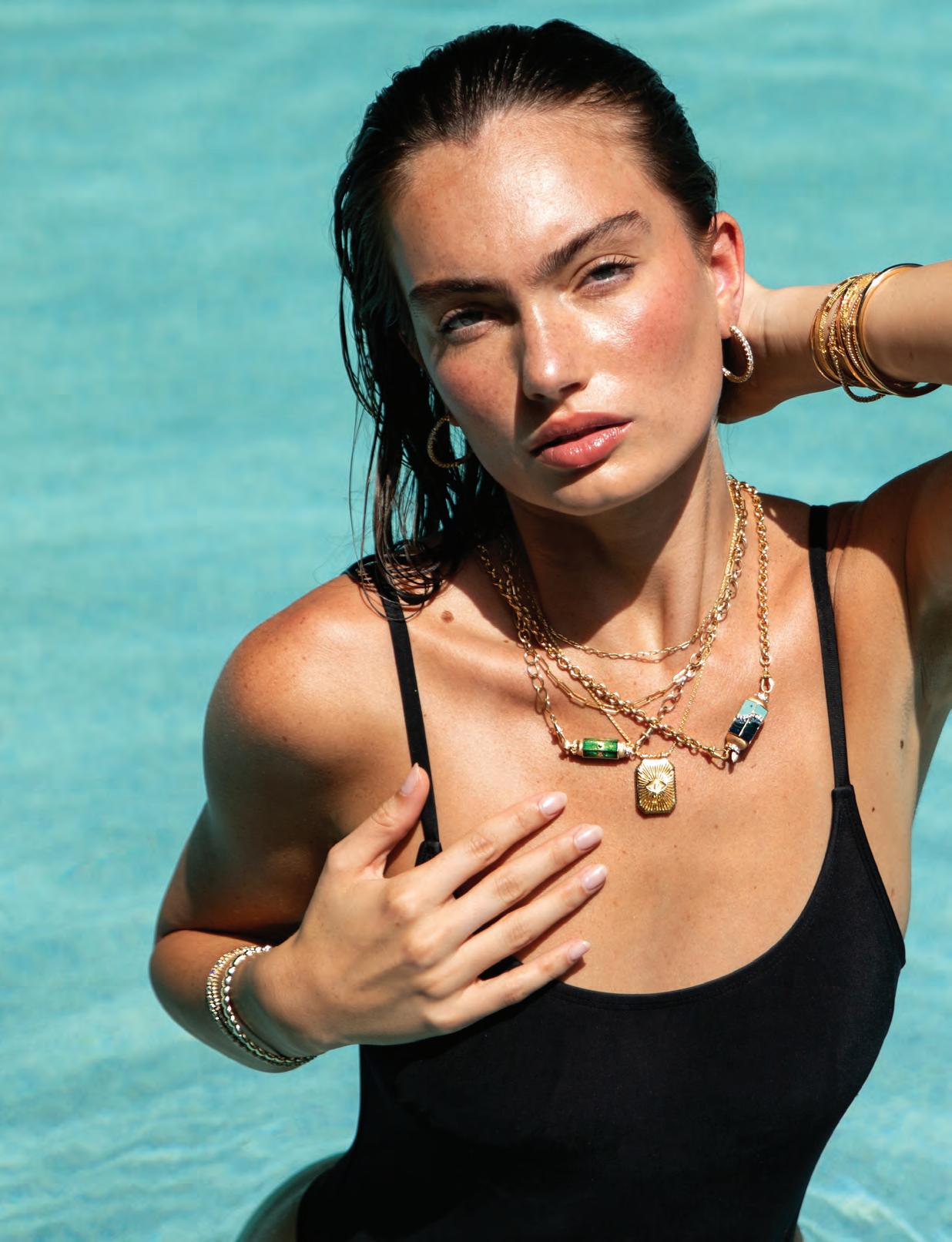 Sun-kissed skin, glimmering gold, and the cool kiss of water—our Summer Collection is made for moments like this. Whether you’re poolside or seaside, make waves in bold, radiant pieces that capture the light and the season