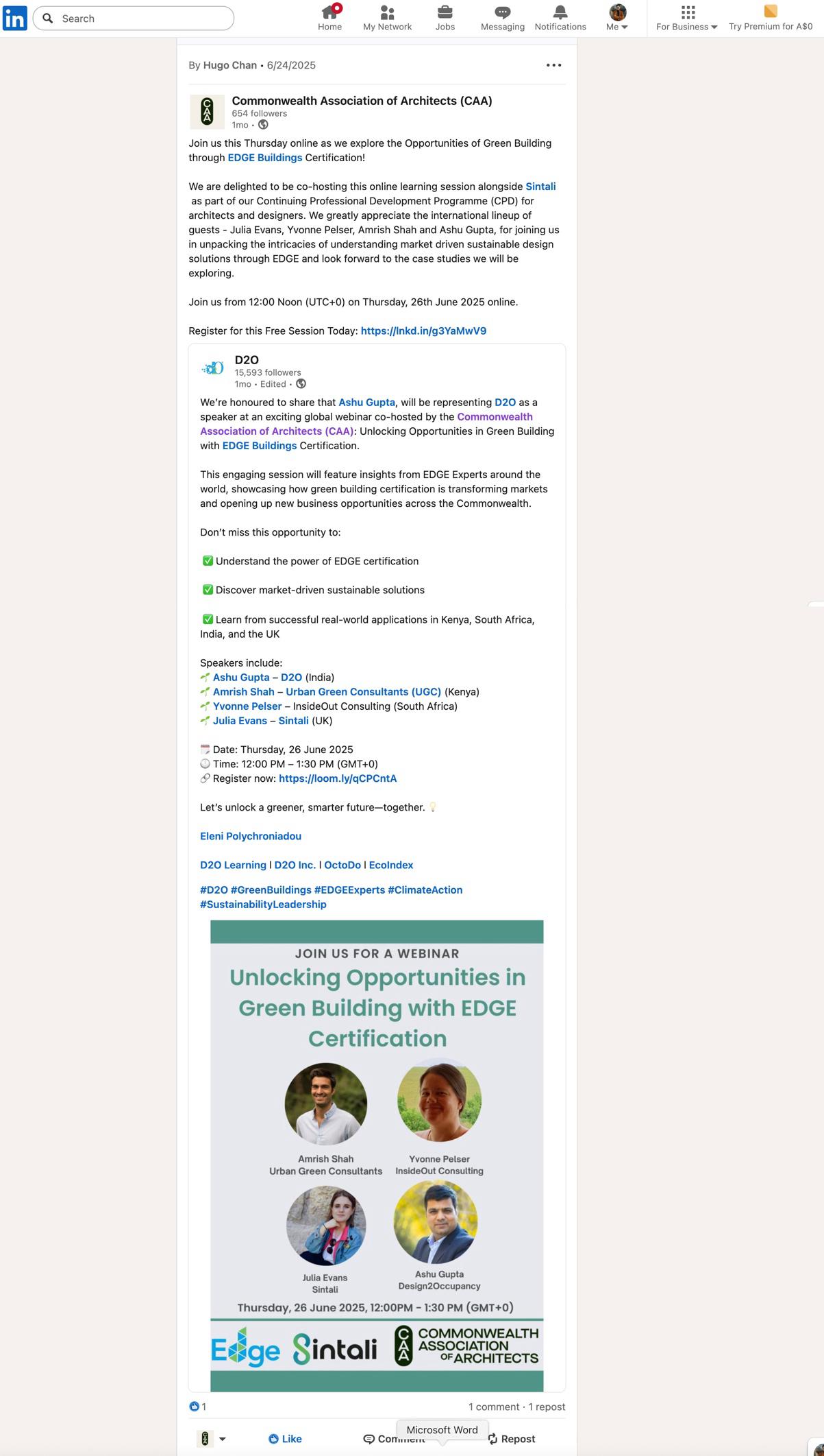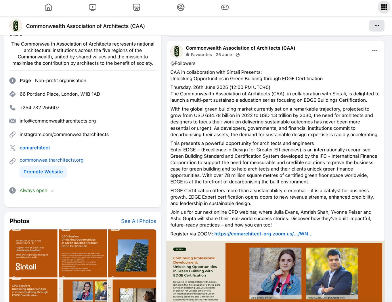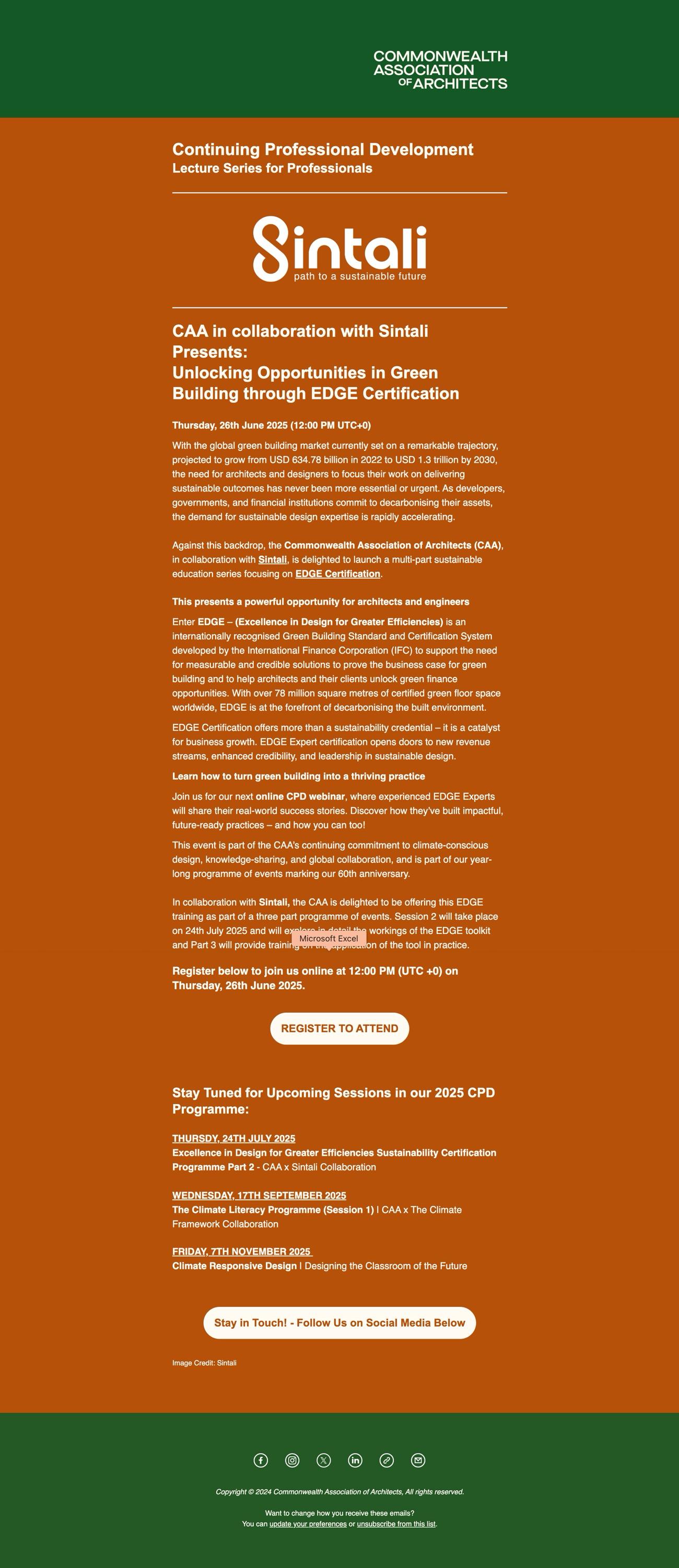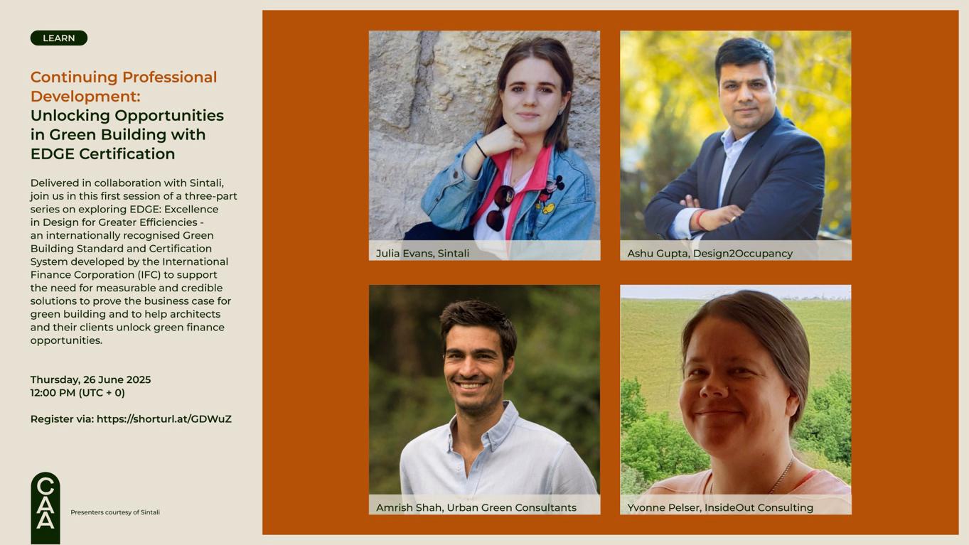 The following document has been prepared for CAA Council to report on the attendance, feedback and promotion strategies for the second session of the 2024-2026 season of the Continuing Professional Development (CPD) programme. This particular session is part of a collaboration between the CAA and Sintali focusing in particular on the opportunities associated with Excellence in Design for Greater Efficiencies (EDGE) Certification and is the first session as part of a three-part collaborative series with Sintali. Session 2, focusing on the use and function of the EDGE Certification software will be held in July 2025 and session 3, focusing on EDGE Expert training will be held directly by Sintali through a paid, on-demand service to participants. This event was held online on Thursday, 25th June 2025.