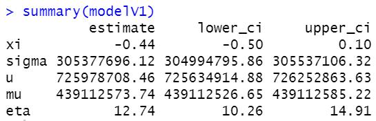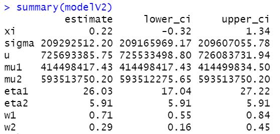 O primeiro ajuste nos dados, identificado como modelV1, foi feito pela função fggpd, que é baseada no modelo de Behrens (2004) e modela a “não cauda” pela distribuição Gama e a cauda pela distribuição GPD.