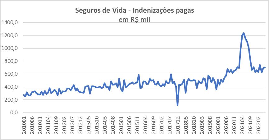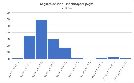 As observações mostram que o valor médio de indenização do seguro de Vida pago mensalmen te foi de R$ 470,7 milhões, o valor mínimo foi de R$ 117,1 milhões e máximo de R$ 1,2 bilhão.