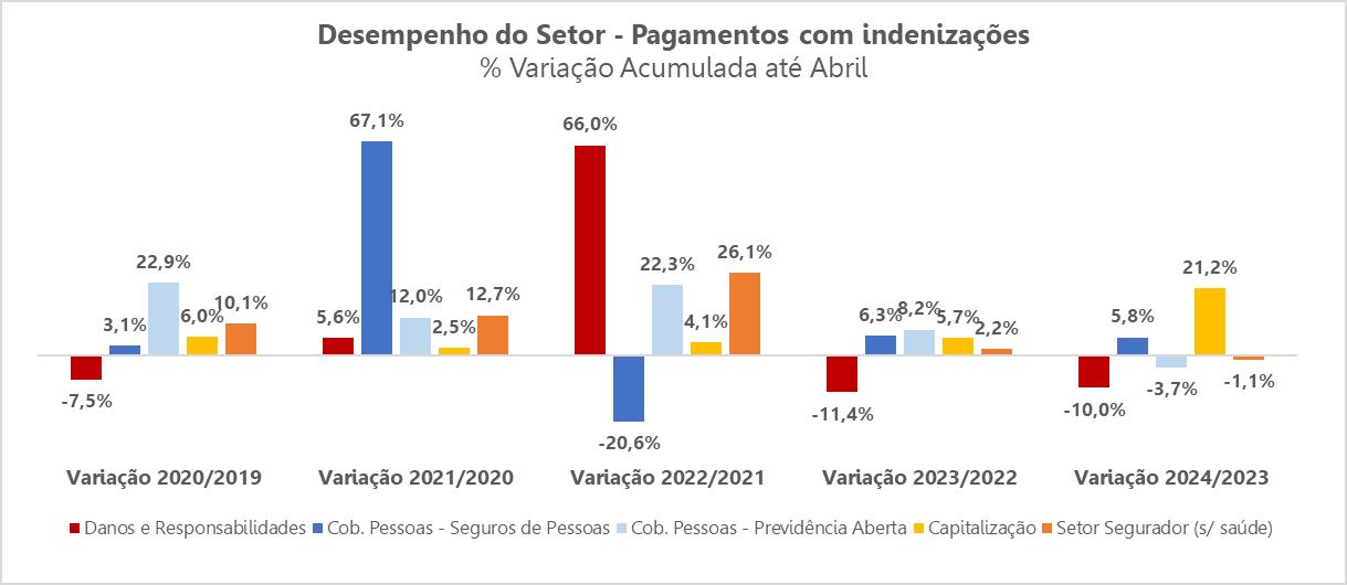Na visão em doze meses móveis, o setor de seguros (sem Saúde Suplementar) pagou, até abril, R$ 225,8 bilhões em indenizações, benefícios, resgates e sorteios, alta de 1,4% sobre o mesmo período do ano anterior. Na mesma comparação, o segmento dos seguros de Danos e Responsabilidades recuou 4,0%, com tendência de forte desaceleração pelo