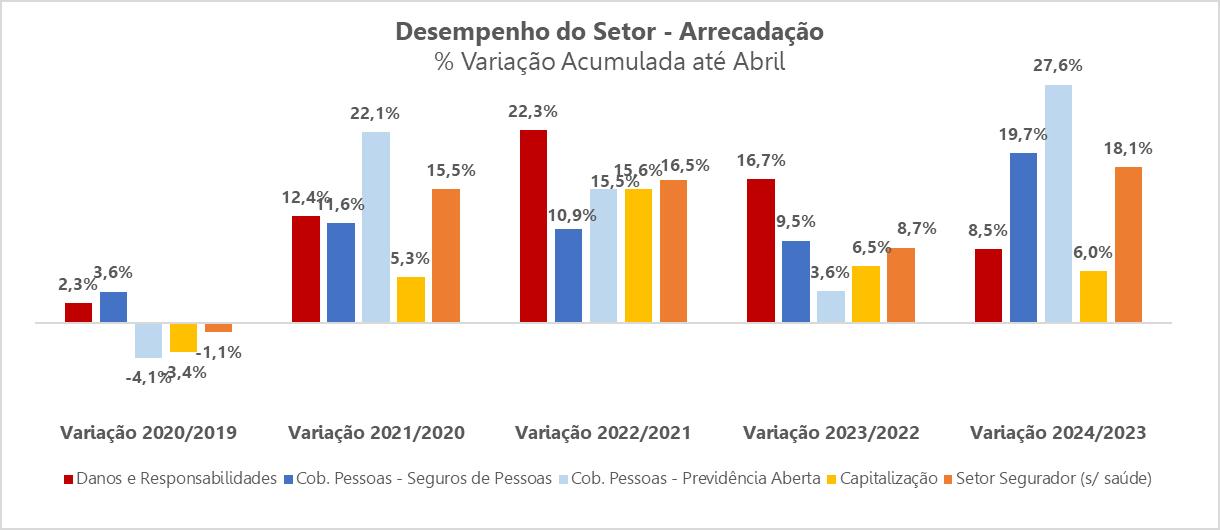 do setor de seguros movimentou R$ 138,8 bilhões em prêmios de seguros, contribuições em previdência aberta e faturamento de capitalização (sem Saúde), expansão de 18,1% sobre o primeiro quadrimestre de 2023. As contribuições de Previdência Aberta, que fazem parte do segmento Cobertura de Pessoas, seguem como protagonistas do aumento da arrecadação do setor em 2024, sendo responsáveis por 64% do crescimento observado. Nos quatro primeiros meses de 2024, os planos da Família VGBL e PGBL arrecadaram R$ 63,1 bilhões, um avanço expressivo de 27,6%. Os Seguros de Pessoas movimentaram R$ 23,0 bilhões em prêmios no mesmo período, com crescimento também na casa de dois dígitos (+19,7%).