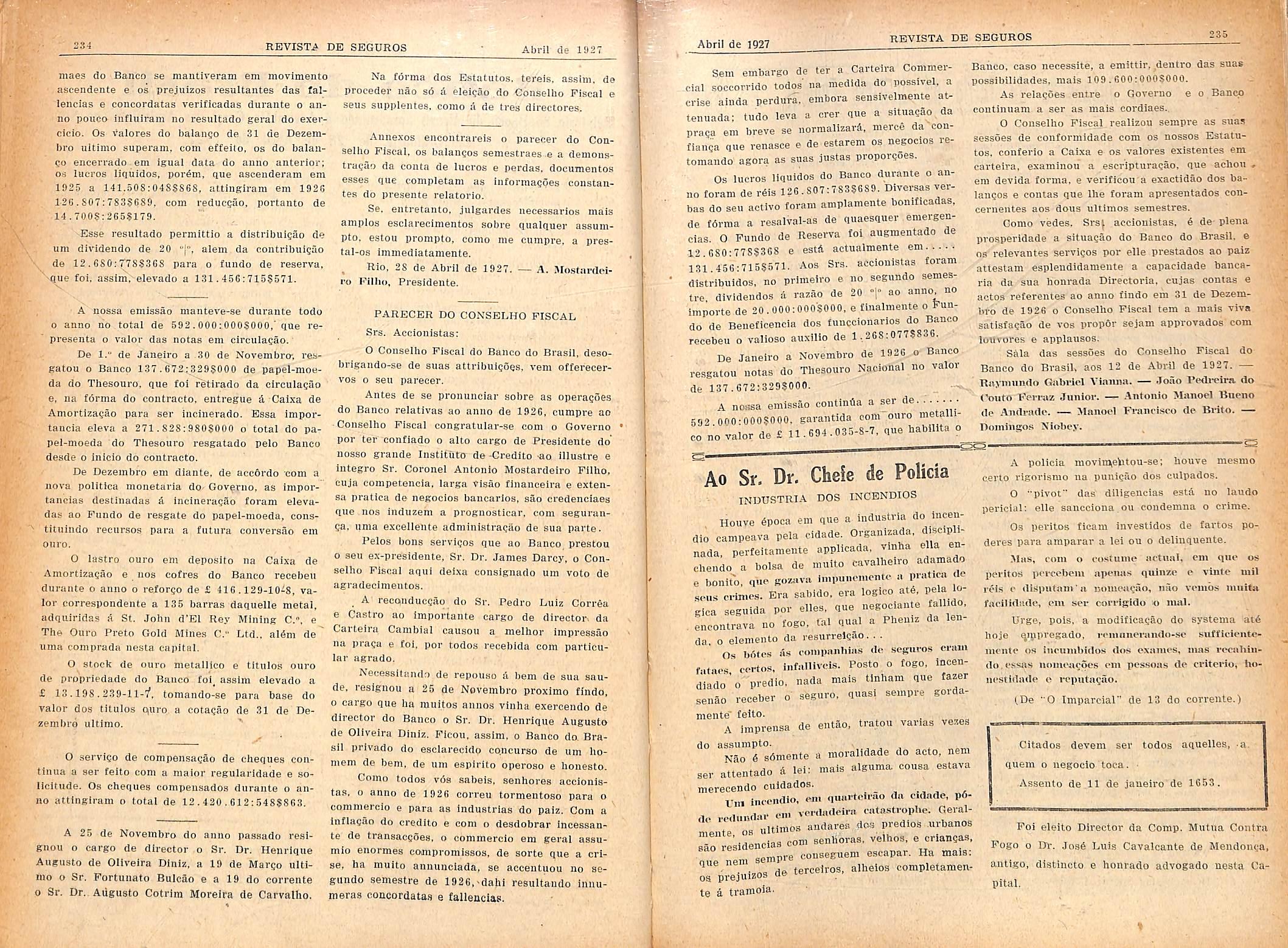Sala das sessoes do Conselho Fiscal do Banco do Brasil, aos 12 de Abril de 1927. Rajnmmlo Gabriel Viaima. — .Toao Pedi-elra Qo Coufo Feri-az Junior. — -Antonio >Ianocl Bucno de Aiulrade. — JIanoel Francisco de Bi-ito. Dojningos Niobey.
