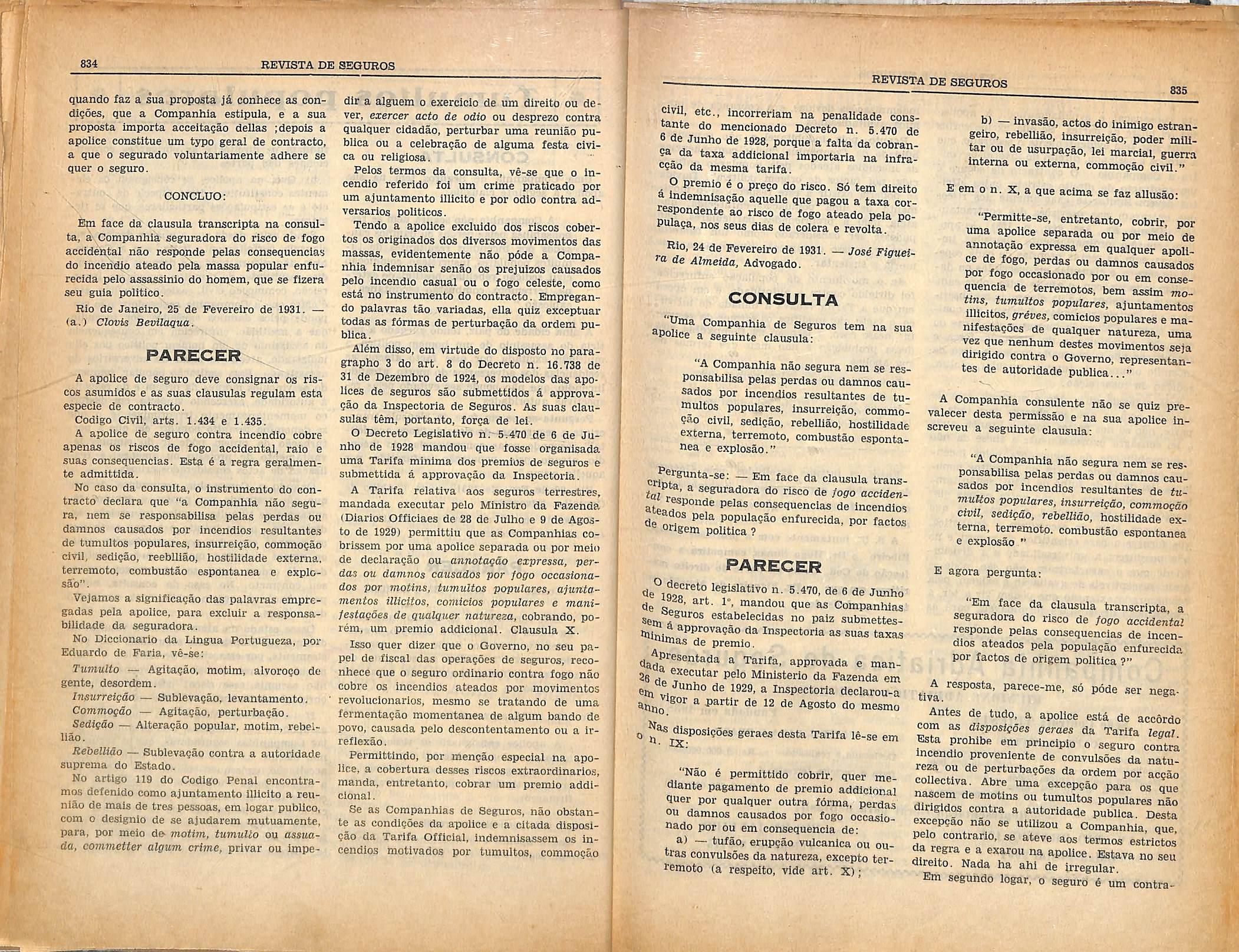Quando a Companhia seguradora declara que nao responde por perdas e damnos re sultantes de tumulto popular, insurreigao, sedicao, etc., o seu intuito e tomar certo que os damnos causados por perturbagoes, mais ou menos violentas, mais ou menos profundas, de ordem social, se acham excluidos dc seu contracto. No caso da consulta, houv'e perturbaoao da ordem publica, pela exaltagao dos animos.