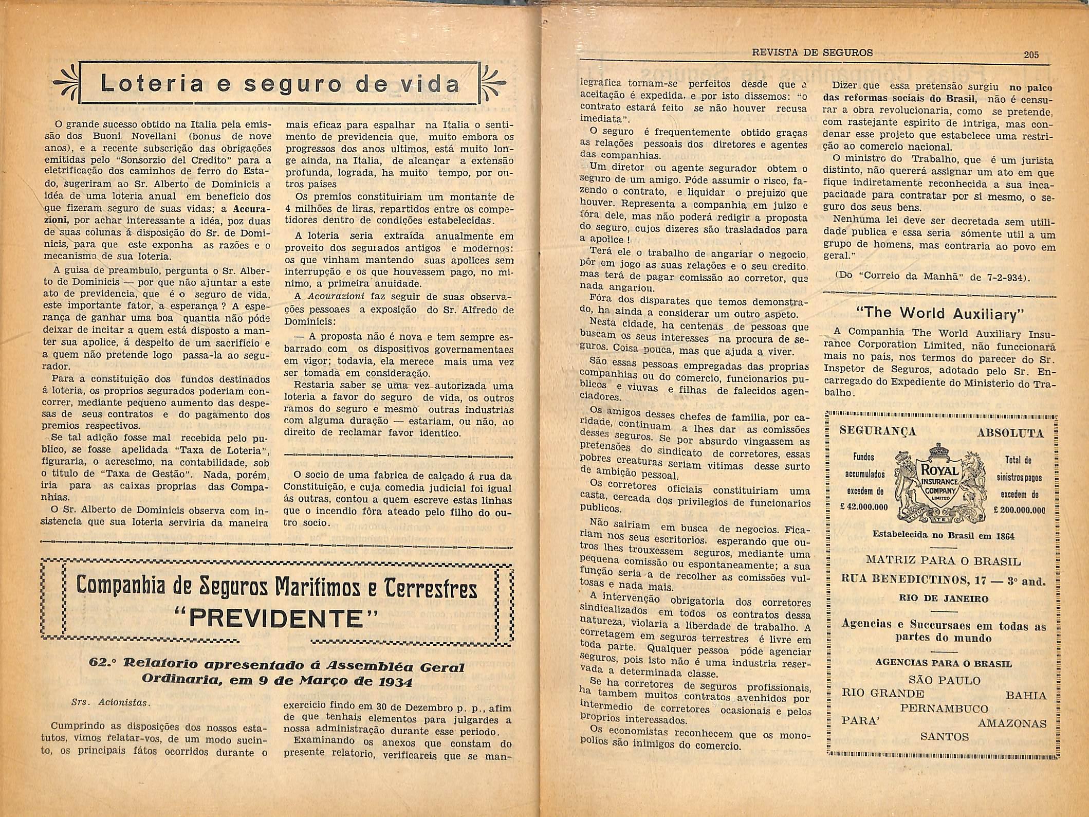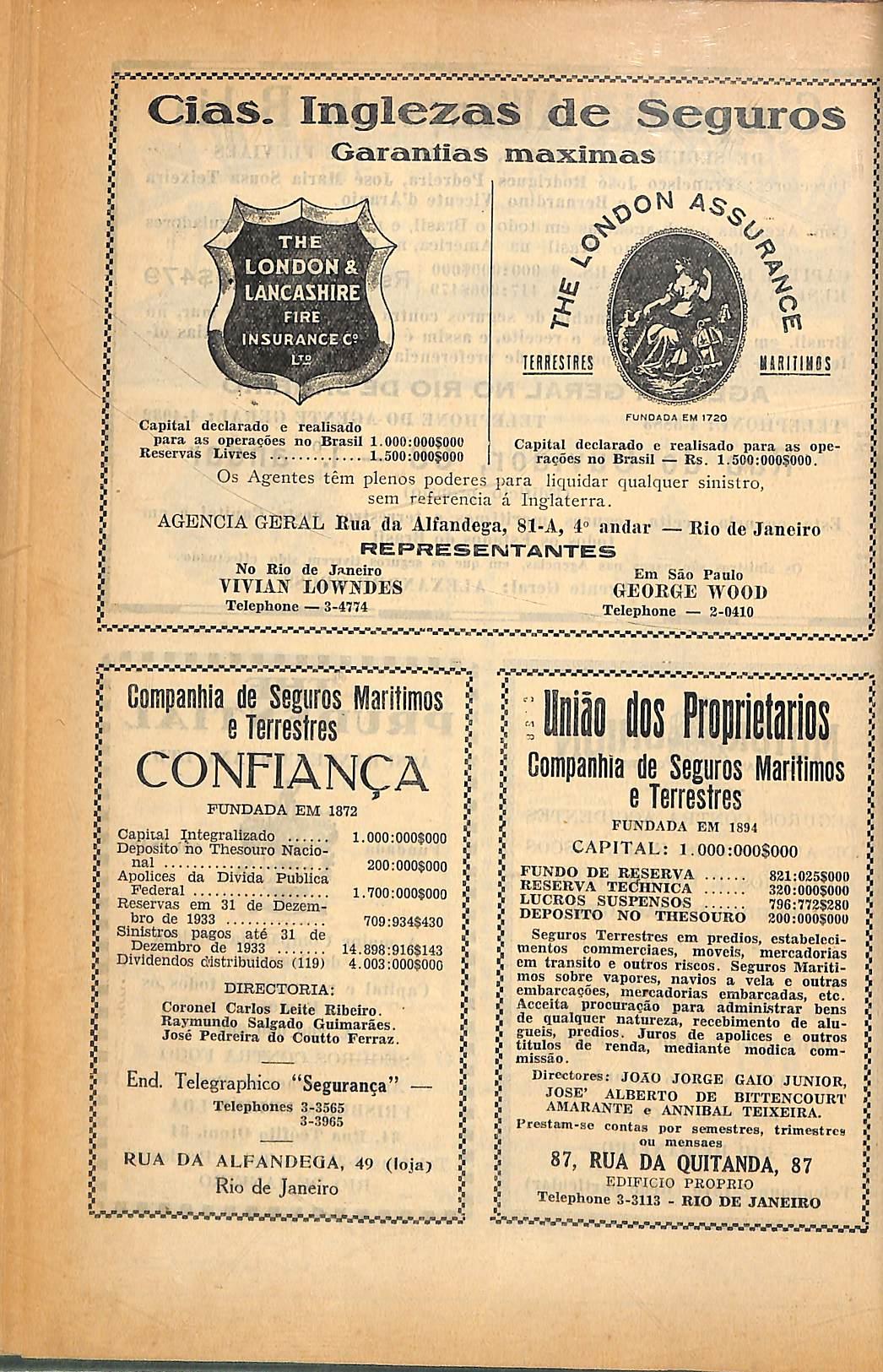 Garantias maximas Capital declarado e reatlsado para as opcra^oes no Brasil 1.000:000$00() • Livres 1.500:000$000 Reseiras fERIIESIRES ■/yyr r FUNOAOA EM 1720 HIRIIIHOS Capital dcclarado c realisado para as opcra^ocs no Brasil — Rs. I.s00:000$000. Os Agentes tem plenos poderes para liquidar qualquer sinislro, sem referencia a Inglaterra. AGENCIA GERAL Eua da Alfandega, Sl-A, 4° aiidar — Rio dc Janeiro REPRESENTANTES de Janeiro Em Sao Paulo VIVIAN LOWNEES GEORGE 4V00U Telephone — 3-4774 Telephone — 2-0410 Companliia de Seguros Marltimos e Terrestres CONFIANCA FUNDADA EM 1872 Capital :^tegrailzado 1.000;000$000 Deposlto no Thesouro Nacional 200:000$000 Apolices da DIvida Publica Federal 1,700:000$000 Reservas em 31 de Dezembro de 1933 709;934$430 Sinistros pagos atd 31 de Dezembro de 1933 14.898-916$143 Dividendos dlstribuldos (119) 4,003;000$000 DIRECTORIA: