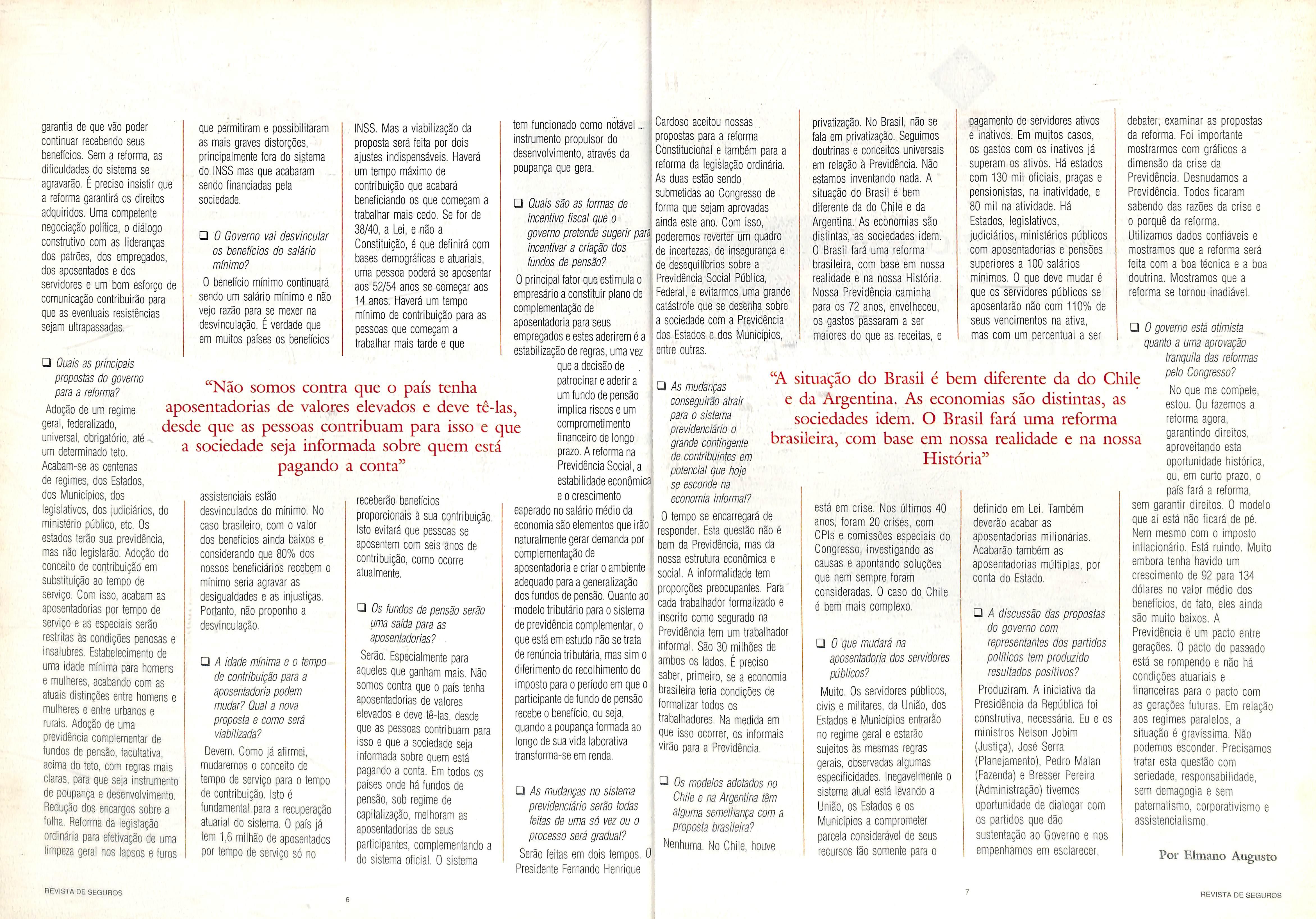 Entre um compromisso e outro, ainda dando os uitimos retoques no conjunto de reformas do sistema previdenci^io, que encaminharia dias depois ao Congresso Nacional, o Ministro da Previdencia Social, Reinhoid Stephanes, concedeu entrevista exclusiva a Revista de Seguros, da Fenaseg, no dia 20 de fevereiro. Falou sobre a importancia das mudangas para contribuintes e segurados, os beneficios que elas trarao a economia do Pais e o papel que pode vir a ser cumprido na nova conjuntura pelo capital privado, atraves dos fundos de pensao.