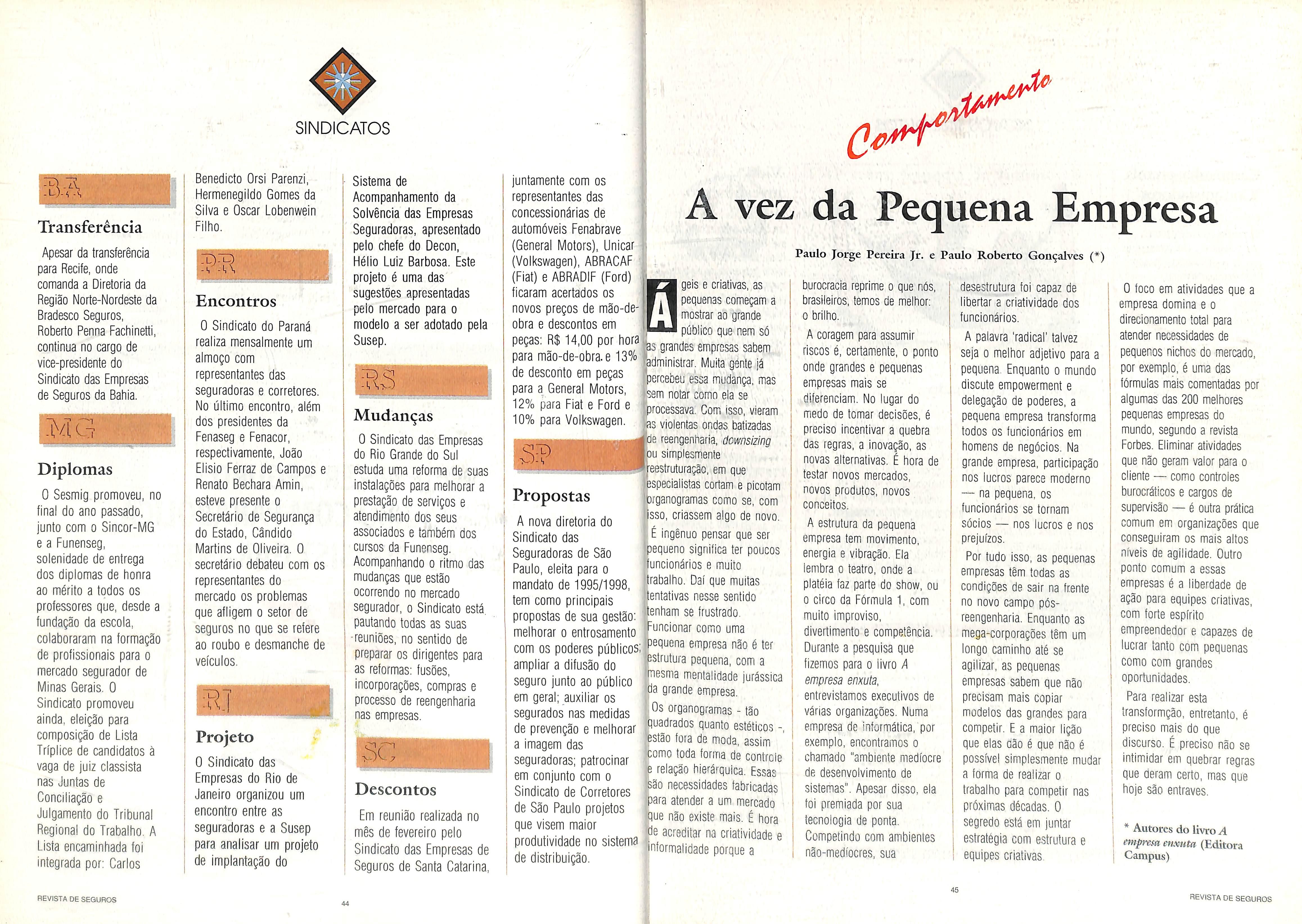 PUBLICAt^AO INTEGRANTS DO CONVENIO DE IMPRENSA DO MERCOSUL-COPREME. Em conjunto com SIDEMA (Servigo Informalivo do Mercado Segurador da Republica Argentina), EL PRODUCTOR (Publicagao da Associagao de Agen- tes e Produtores de Seguro da Republica Oriental' do Urugual) e Jornal dos Seguros {Publicagao do Sindicato dos Corretores de Seguros e de Capitalizagao do Estado de Sao Paulo).