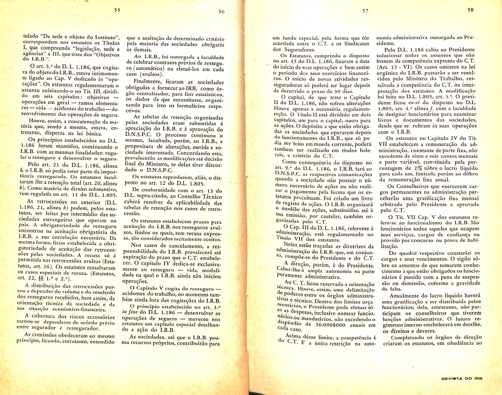 A jirmeza, a serenidade e a energia, que sdo a caracteristica de V. Ex. quando luta pelos superiores objetivos da naqdo, mais uma vez se evidenciavam quando, vencendo todos os obices, assinou, em 3 de abril de 1939, o decreto-lei n. 1.186, jundando o orgao que deveria, a partir desta data, regular os resseguros no pass e desenvolver as operaqoes de seguros em geral.