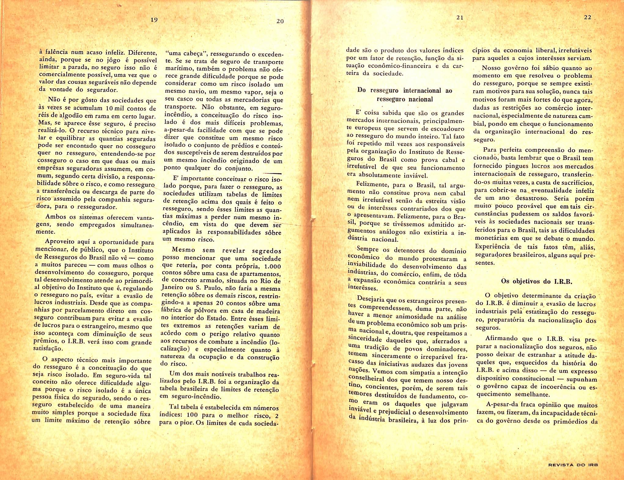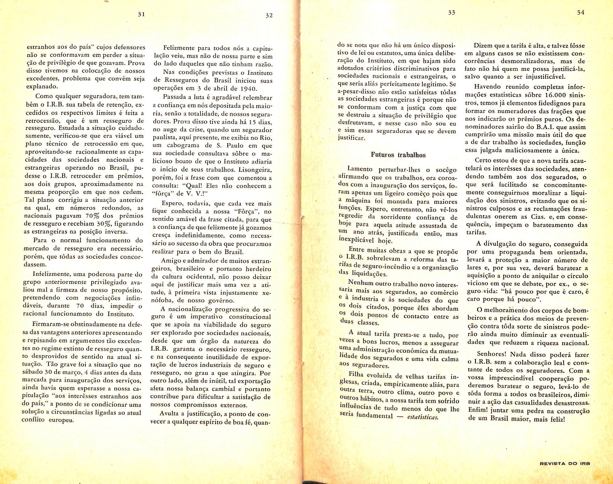 soleneexpressividade,ou,pormelhor dizermos,emqueelasseajutarammais aologareàocasião.E,defato,asua afirmativadepretenderoInstitutoape• nasresguardar,comasnossaseconomias,eatravésdosanguedavidada nacionalidade,osmaisaltosinterêsses dopaís,porémnuncaatentarcontraa basedeconfiançaindispensávelaoafluxodoscapitaisdequenecessitaonosso progresso,ouperseguiraêssesmesmos capitais,sendovaliosaemqualquermomentooucircunstância,valiosíssima setornaquandoseinaugura,sobtão altosauspícios,oInstitutodeRessegurasdoBrasil,quevaifuncionarcomo umórgãodeproteçãoaodinheirodos nossospatrícios,eelementodeumafiscalizaçãotantomaisnecessáriadoscapitaisestrangeirosquantoécertoque porêssesistema,medianteasquotas deretenção,nadamaissefaz,emúltima análise,quefixarumcritériode-justiça.• edistribuiçãodeque,lealmente,todos sehãodebeneficiar."(De 110 Globo" de 4.4.40).