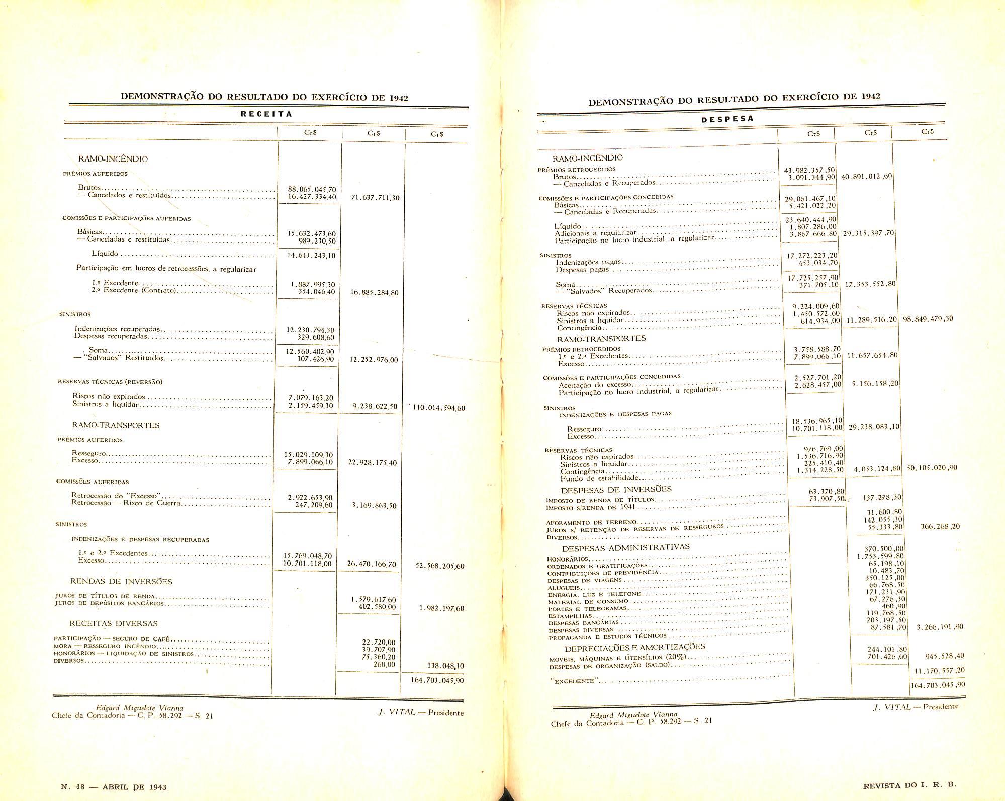 R E C E I T A Cr$ CrS 1 CrS RAMO-lNCeNDlO PREMtOS AUFERIDOS Brtitos 88,065,045 70 16,427.334,40 — Cancelados e rcstiLuldos. 71,637,711,30 COMISSOES E PARtiCIPAgOES AUPERtDAS Bisicas ~ Canccladas c rcstkuidas. 15.632,473,60 989,230,50 Ltquido 14,643.243,10 Particlpajao em lucros de recrocessoes, a regularizar 1.® Excedcntc ' 2.® Exccdcnte (Contraco) 1,887.995,30 354,046,40 16,885.284,80 SINISTROS tndeniM^ocs rccupcradas 12,230.794 3D 329,608,60 EJespesas rccupcradas. SoiTia — "Salvados" Rcstiiuidos 12,560,402,90 307,426,'>0 12,252,976,00 -RESERVAS T/iCNiCAS(RBVERSAO) Riscos nao cxpirados 7,079,163,20 Sinistros a llquidar 2.159,459,30 9,238,622,50 • lU.Ui4.5H4.bU RAMO-TRANSPORTFiS PR^IOS ACFERfDOS RcsscgurO txcesso 15,029,109,30 7,899,066,10 22-928.175,40 COMISSOES AUFERJDAS RctrocessSo do "Excesso" Retroccssao — Risco dc Gucrra. 2,922,653,90 247,209,60 3,169,863,50 8INISTR05 JNOENIZAC^ES E DESPESAS RECUPBRADAS F.o c 2.® Excedcntcs Exccsso 15,769,048,70 10,701,118,00 20,470,166,70 52-568.205,60 RENDAS DE INVERSQES JOROS DE ihuiLOS DE RENDA jtmos OE DEPdsiros bancArios 1.579,617,60 402.580,00 1,982,197,60 RECFITAS DIVERSAS PABTICIPaOaO—seCUBO OE CafS 22,720,00 MORA—RESSECURO INt?NDIO HONORARIOS—lIQUID.*CAO DE SINISTROS DIVBRSOS 1 >u./u/,vu 75,360,20 260,00 138.048,10 164,703,045,90 Edgard Miguelole Vianna CKcfc da Concadoria — C. P. 58,292 •— S. 21 J. VITAL — Prcsidcnte