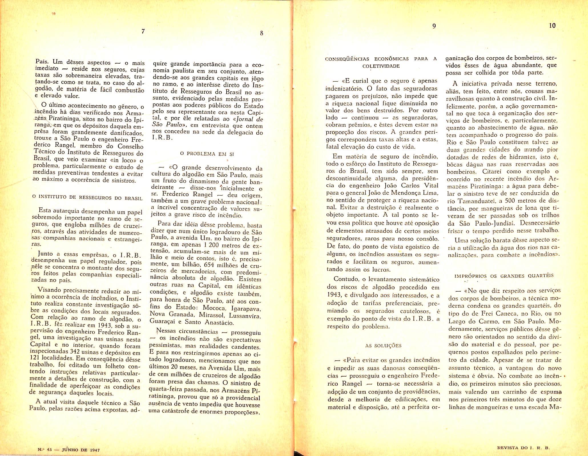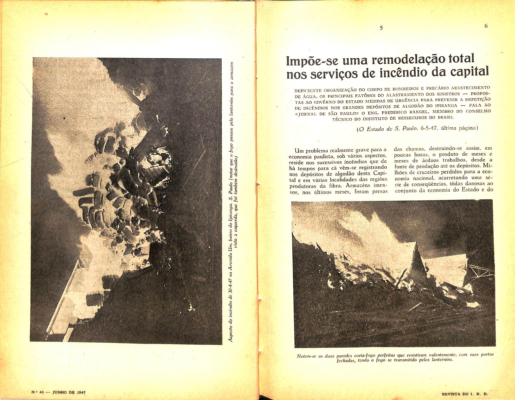 DEFir:l£N-Tl£ ORGANiZAgAO DO CORPO DE BOMBEIROS E PRECARIO AEASTECIMENTO DE AGUA. OS PRINCIPAIS FATORES DO AI.ASTRAMENTO DOS SINISTROS — PROPO_S' TAS AO GOVERNO DO ESTADO MEDiDAS DE URGENCfA PARA PREVENIR A REPETigAO DE INCiiNDlOS NOS GRANDES DEPOSITOS DE ALGODAO DO IPIRANGA — FALA AO «TORNAI- DE SAO PAULO» O ENG. FREDERiCO RANGEL. MEMBRO DO CONSELHO TECNICO DO INSTITUTO DE RESSEGUROS DO URASiL (O Estado dc S. Paulo. 6-5-47, ultima patina)