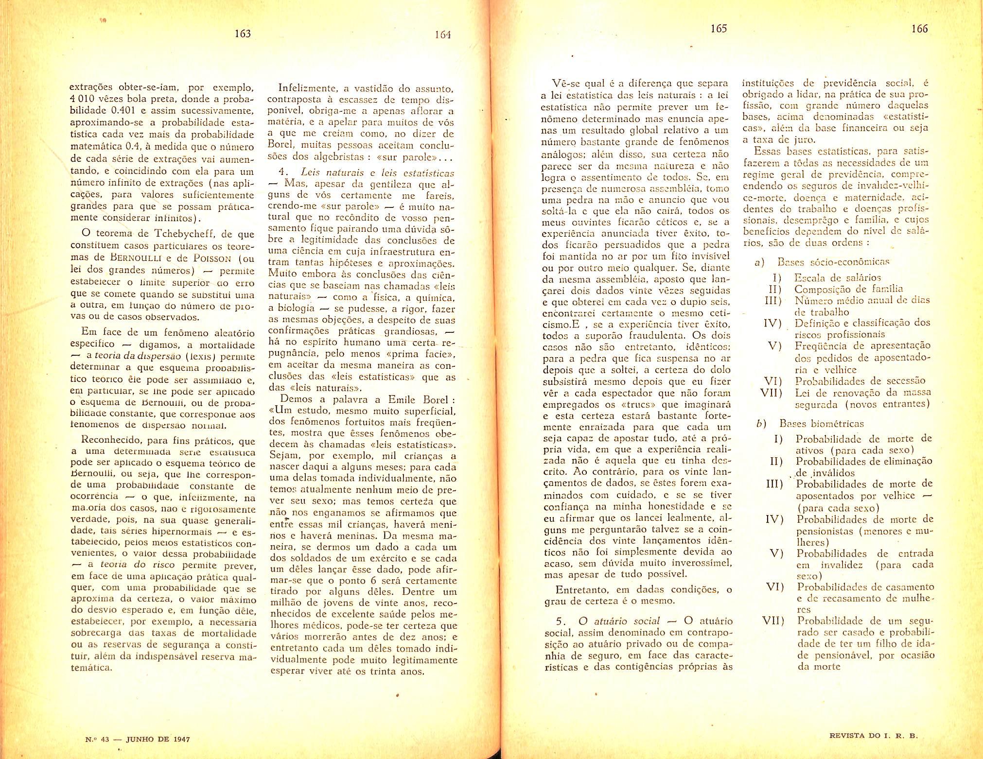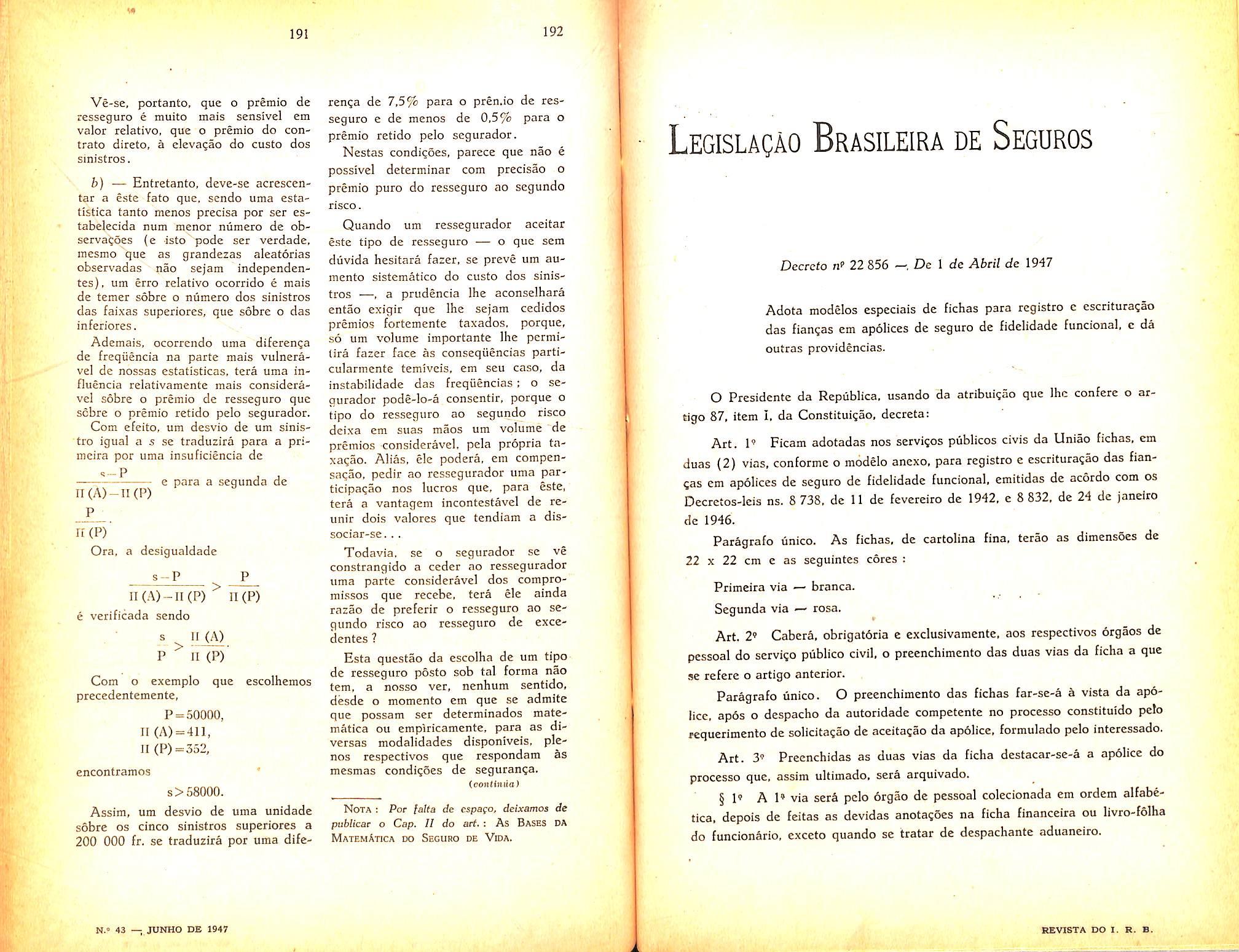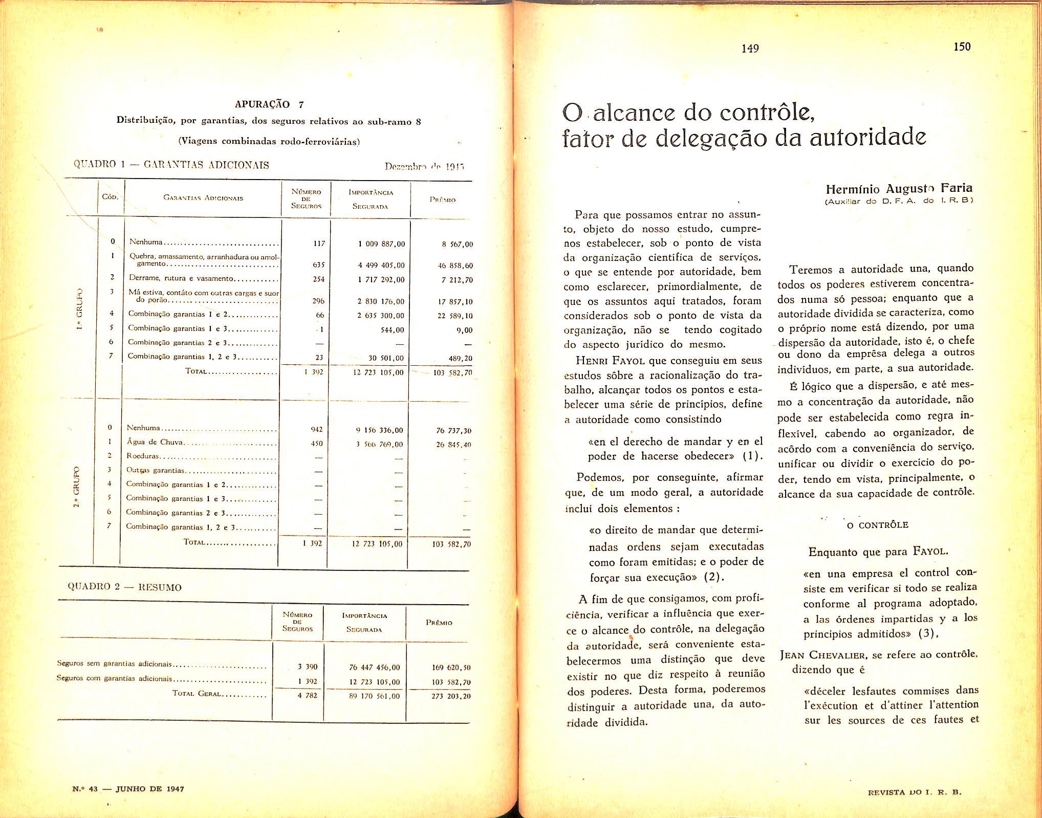 — Estudo sobre o ramo Vida; Weber Jose Ferreira, col. 49 — Das obriga^oes do seguradoE ; Sua responsabiiidade adstrita ao risco: David Campista Filho, col. 57 — Desenvolvimento do seguro nos paises das Americas; Eng. liodrigo de Andrade Medicis, col. 63 •— A melhoria de embalagens como preven^ao do risco de roubo; A. O. Zander, col. 79 — Dados Estatisticos, col, 83 •— O alcance do controle, fatoE de delega^ao da autoridade; Herminio Augusta Faria, col. H9 •— Aspectos atuariais da previdencia so cial; Gastao Quartfn Pinto de Moura, col." 155 — Tradu^oes e Transcri^oes, col. 179 — Legisla?ao Brasileira de Seguros: Decreto n." 22.556 de 1-4-47, col. 193 — Parecercs e Decisoes, col. 199 — Bibliografia, 233 — Noticiario, col. 239.