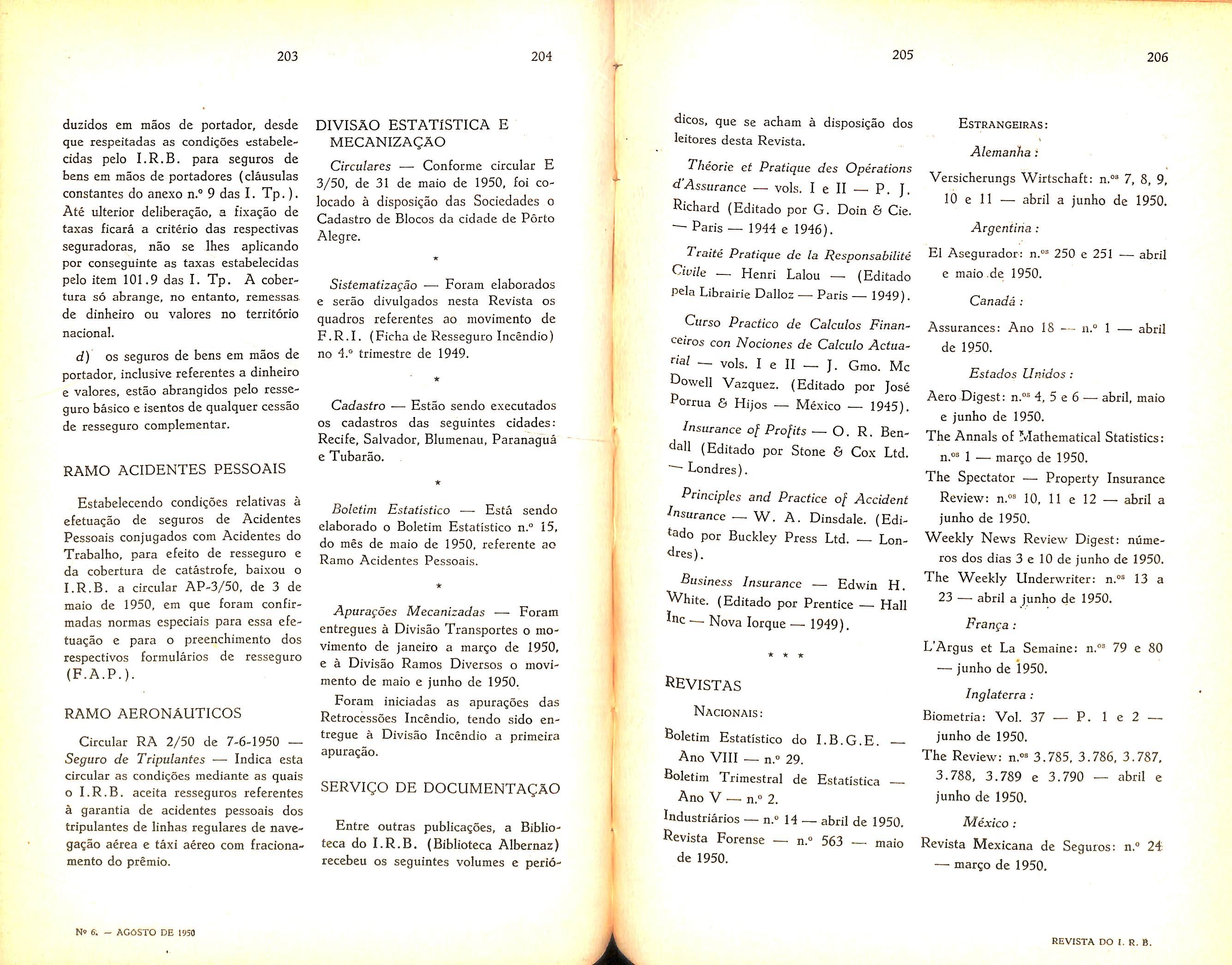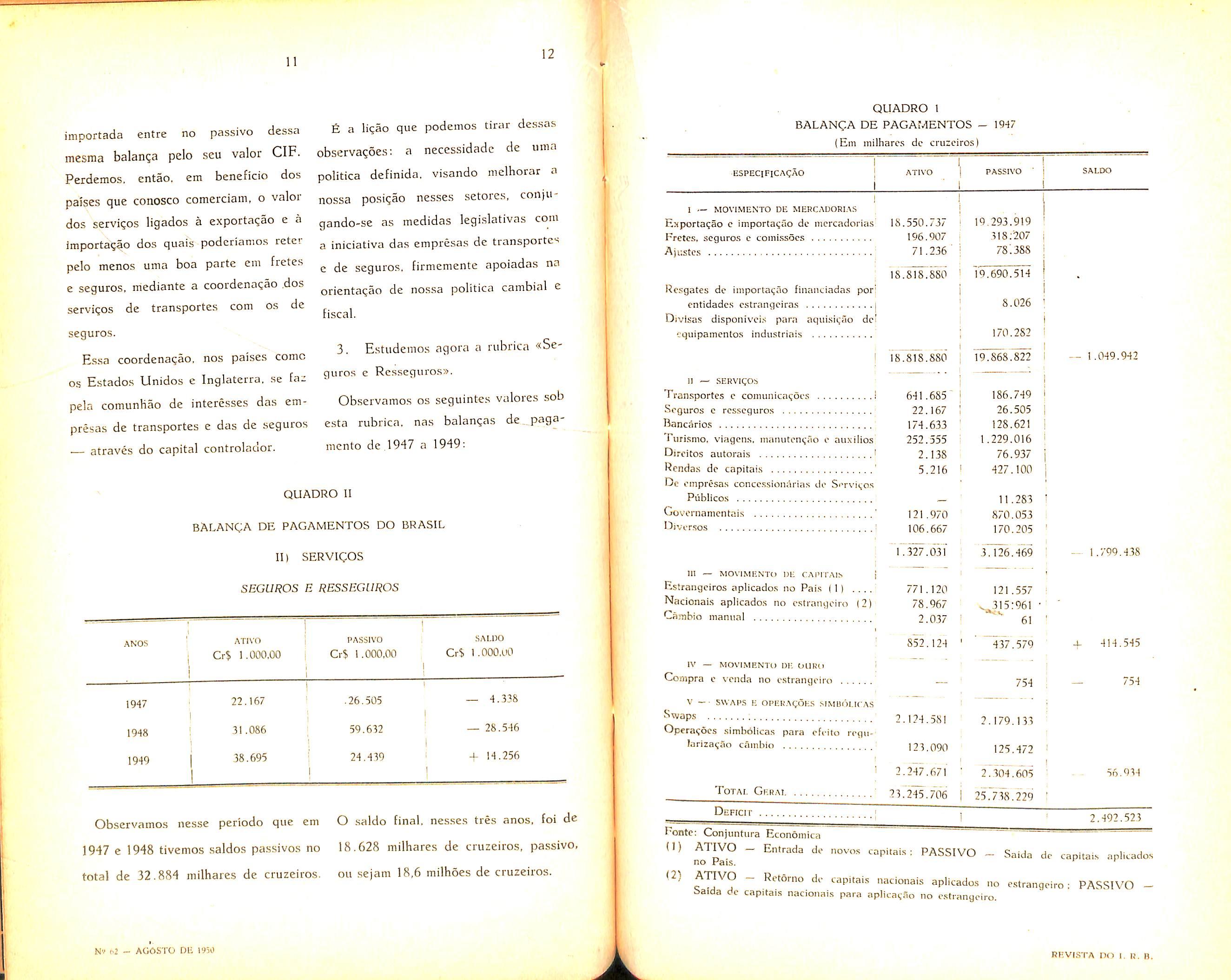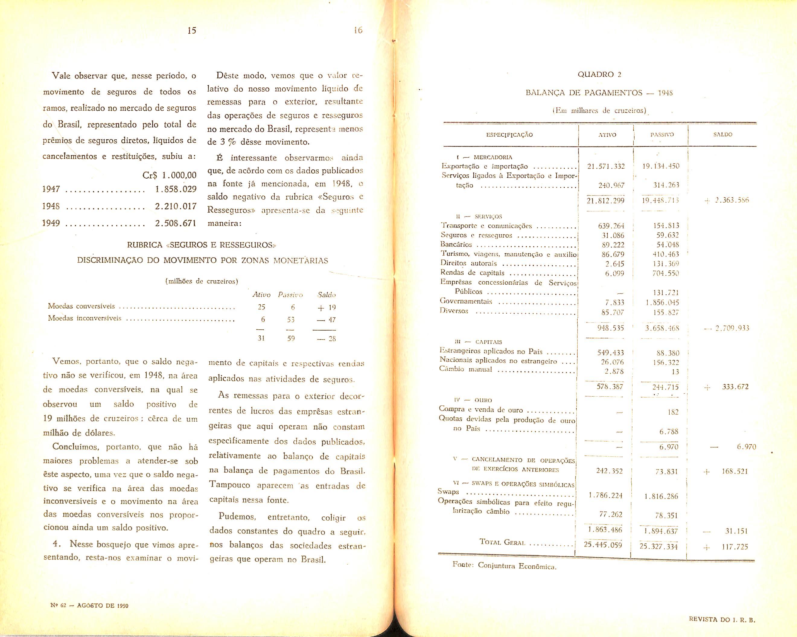 B. I.}.1 . Com a apuragao, pelo Banco do Brasil, da Balanga de Pagamentos do nosso Pais. o que vem sendo feito regularmentc desde 1947, torna-se pos•"^ivel apreciarmos, se bem que ainda bastante incompletamente, a influencia da orientagao da politica economica brasiieira, em materia de seguros e resseguros. sobre as nossas contas cambiais.