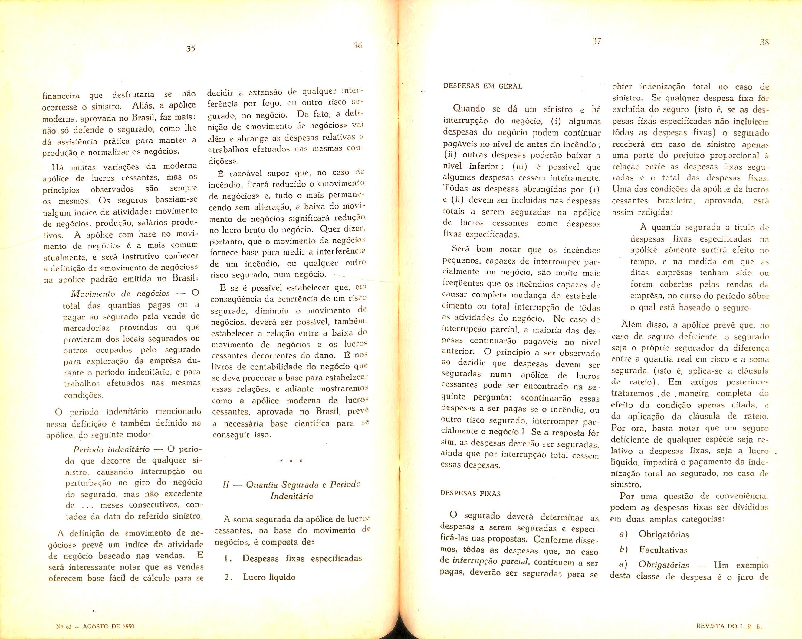 Como o seguro de «uso e ocupagao» forma de seguro de lucros cessantes popular nos Estados Unidos nao se desenvolveu no Brasil. sobre ele faremos pequena referenda. O seguro de «uso e ocupagao» e o resultado de Uma das mais aiitigas apolices de lucros cessantes ja referidas. Por exemplo, Um tipo de seguro de «uso e ocupagao» preve o pagamento de indenizagao de lucros cessantes, mas limita-se a 1/52 da importancia do seguro relative a