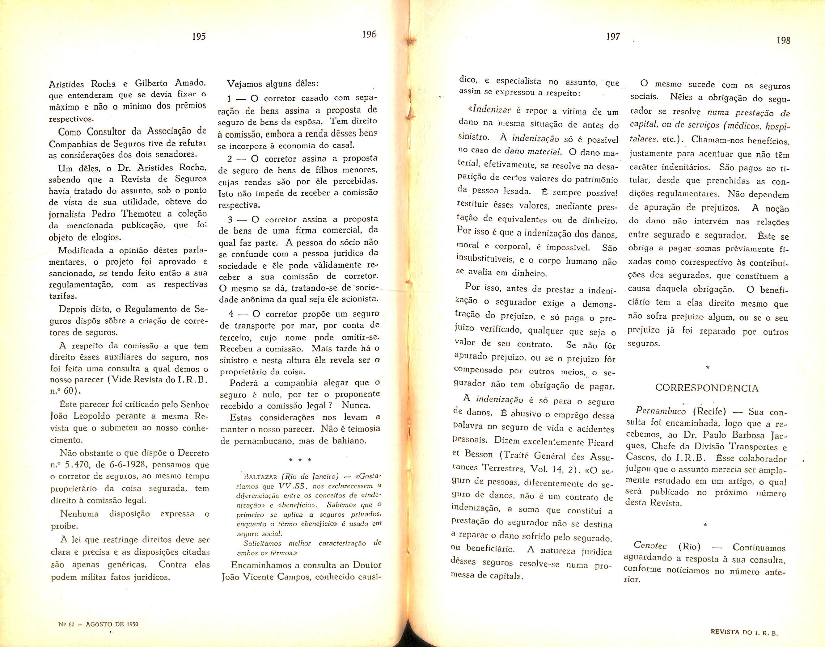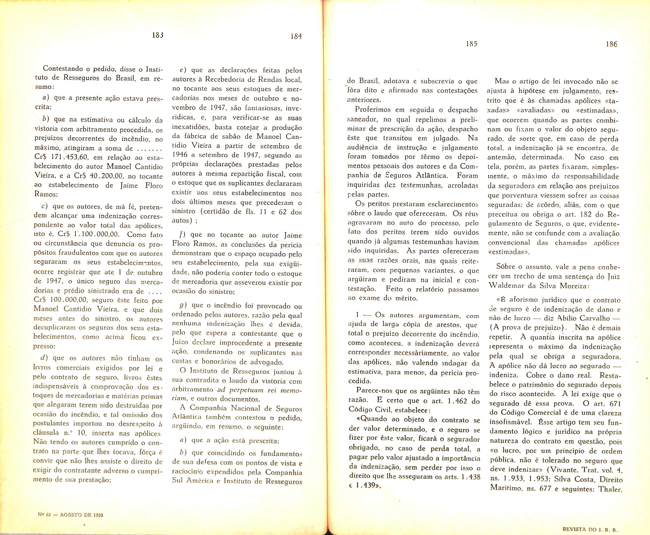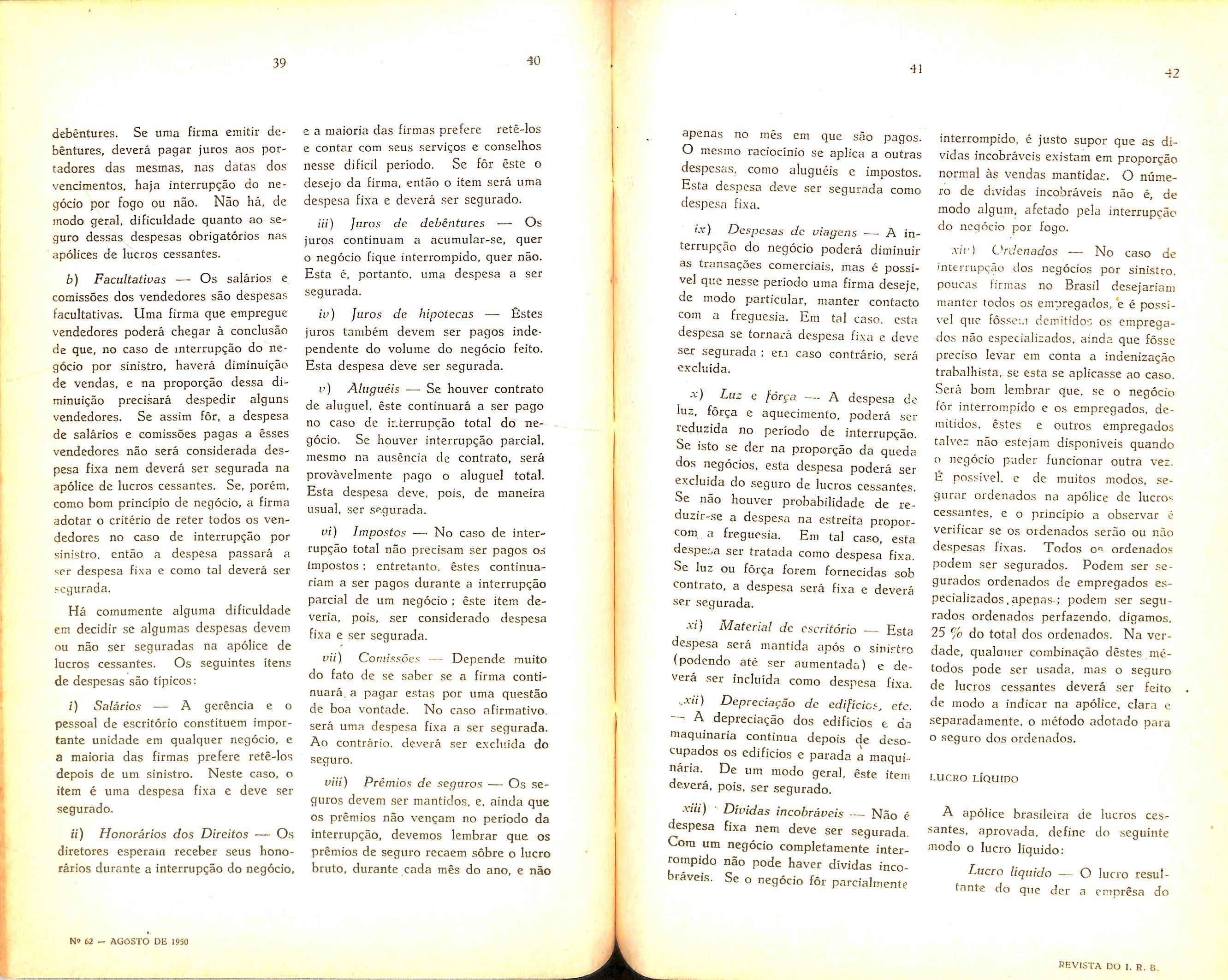 O seguco e o resseguro na balan^a de pagamentos do Brasil; Mario Trin" dade, col. 5 Majoragao das aposcn^ tadorias e pensoes a cargo das insti' tuigSes dc previdencia social; Joao Lyra Madeira, col. 23 — O seguro dc lucros ccssantes; H. Clayton Cham' bers, col. 33 — O vicio intrinscco no seguro maritimo das mercadorias; Joao Vicente Campos, col. 53 — O resse guro de excesso dc danos; /. /. de Souza Mendes, col. 63 — Principios Juridicos aplic&veis em materia de seguros; Jose SoUero Filho, col. 75 — Notas sobrc leis franccsas dc seguros privados; Alfredo Carlos Pestana Junior, col. 93 — Analise das series hist6ricas; Joao Lyra Madeira, col. 101