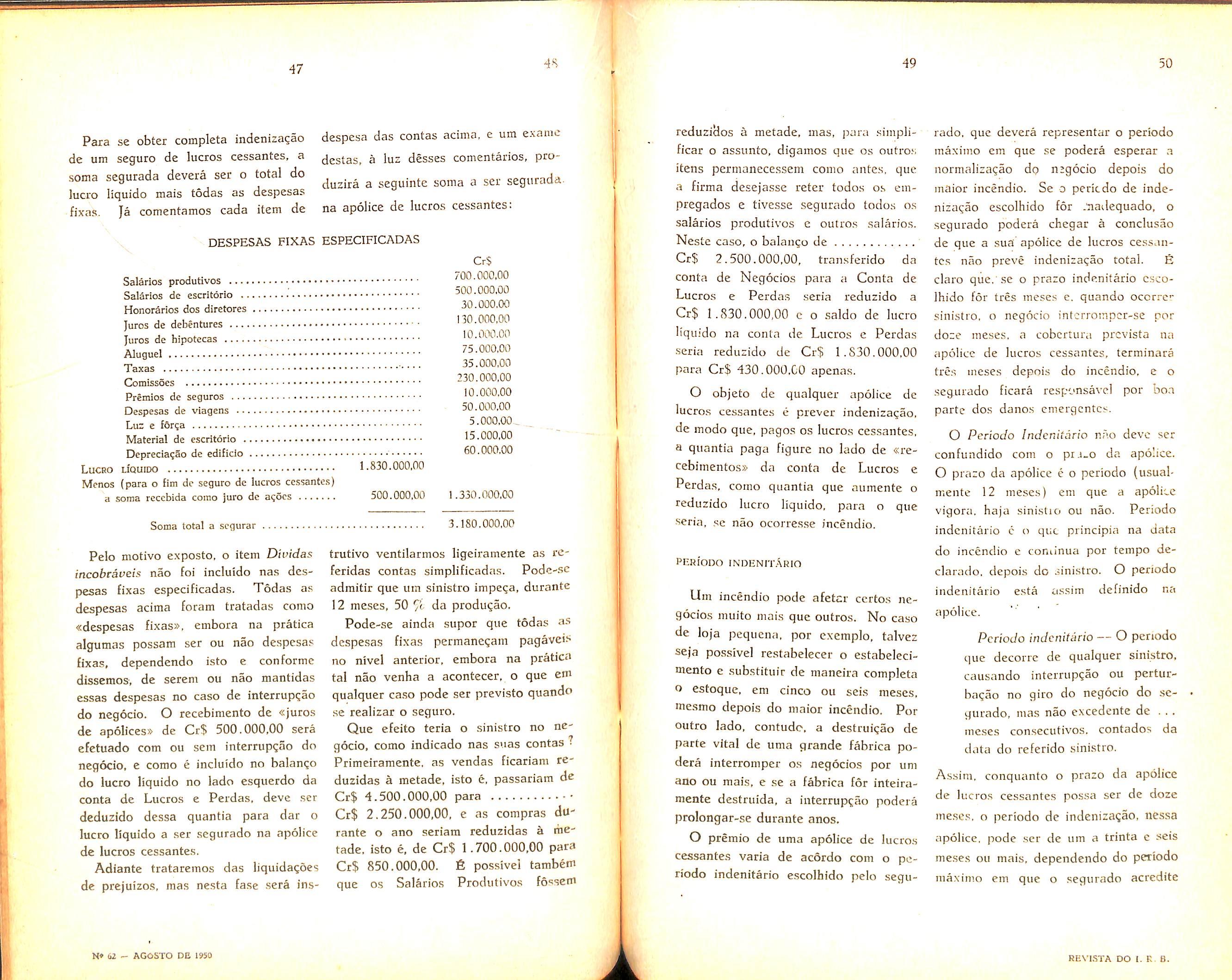 Pelo motivo exposto, o item Dividas incobraueis nao foi incluido na.s despesas fixas especificadas. Todas as despesas acima foram tratadas como «despesas fixas», embora na prMica algumas possam ser ou nao despcsa.'^ fixas, dependendo isto c conforme dissemos, de serem ou nao mantidas essas despesas no caso de interrupqao do negocio. O recebiniento de «juros de ap6lices» de Cr$ 500.000,00 sera efetuado com ou sem interrupgao do negocio, e como e incluido no balanqo de lucre liquido no lado esquerdo da conta de Lucros e Perdas, deve ser deduzido dessa quantia para dar o lucro liquido a ser segurado na apolice dc lucros cessantes.