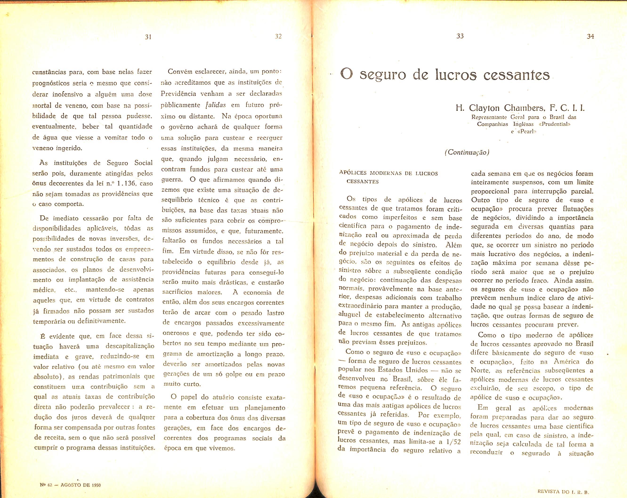 O seguro dc lucres ccssantcsH. Clayton Chambers, F. C. 1. I. Rcprcscntante Gcral para o Brasil das Corapanhias Iriglesas «Prudcntial» c «Pcarl'^ APOLICES MODERNAS DE LUCROS CESSANTES