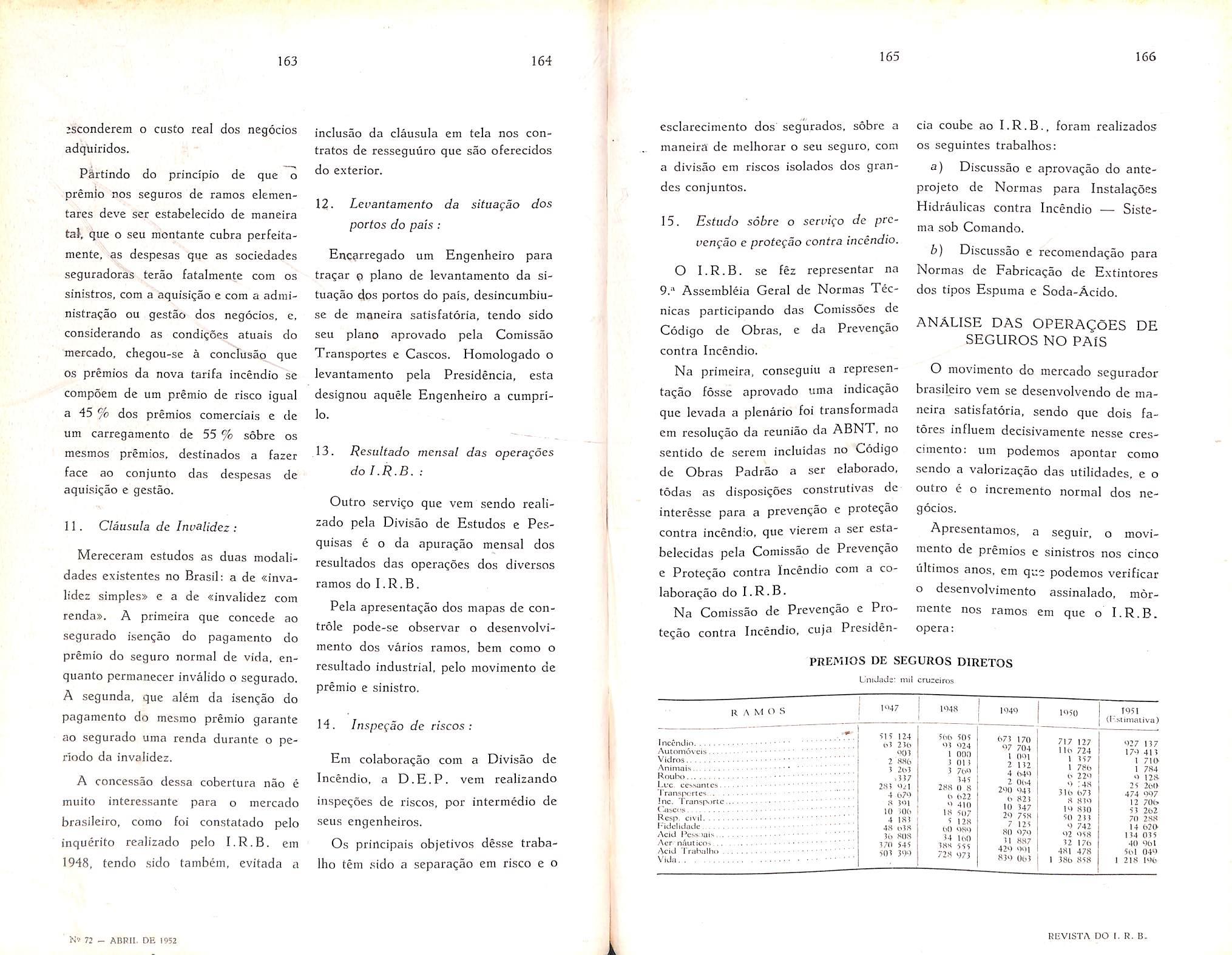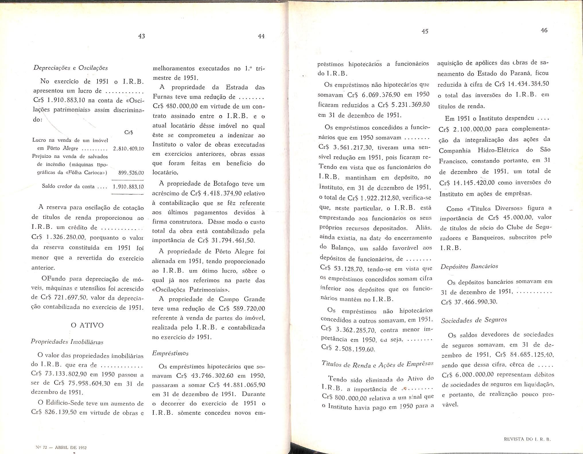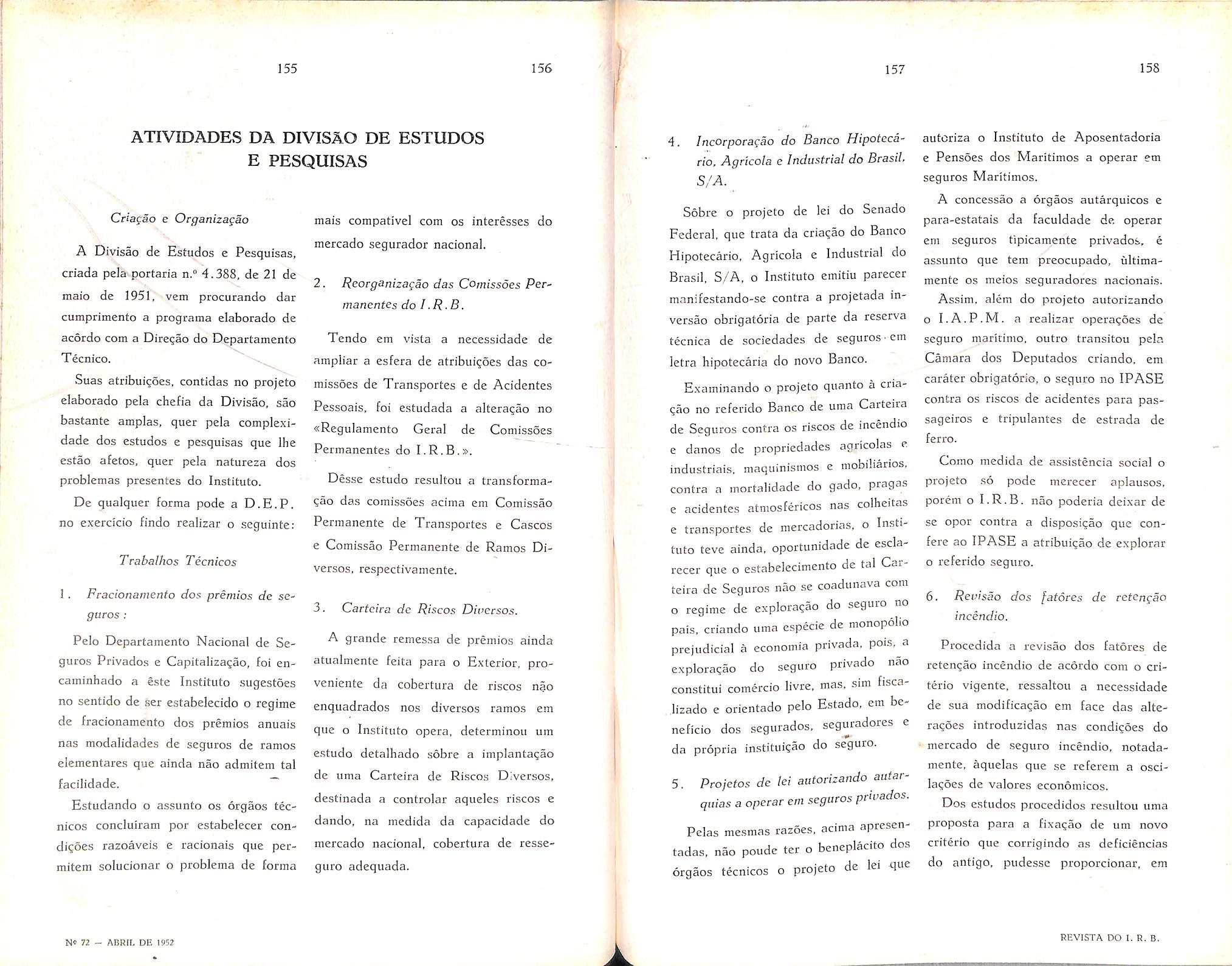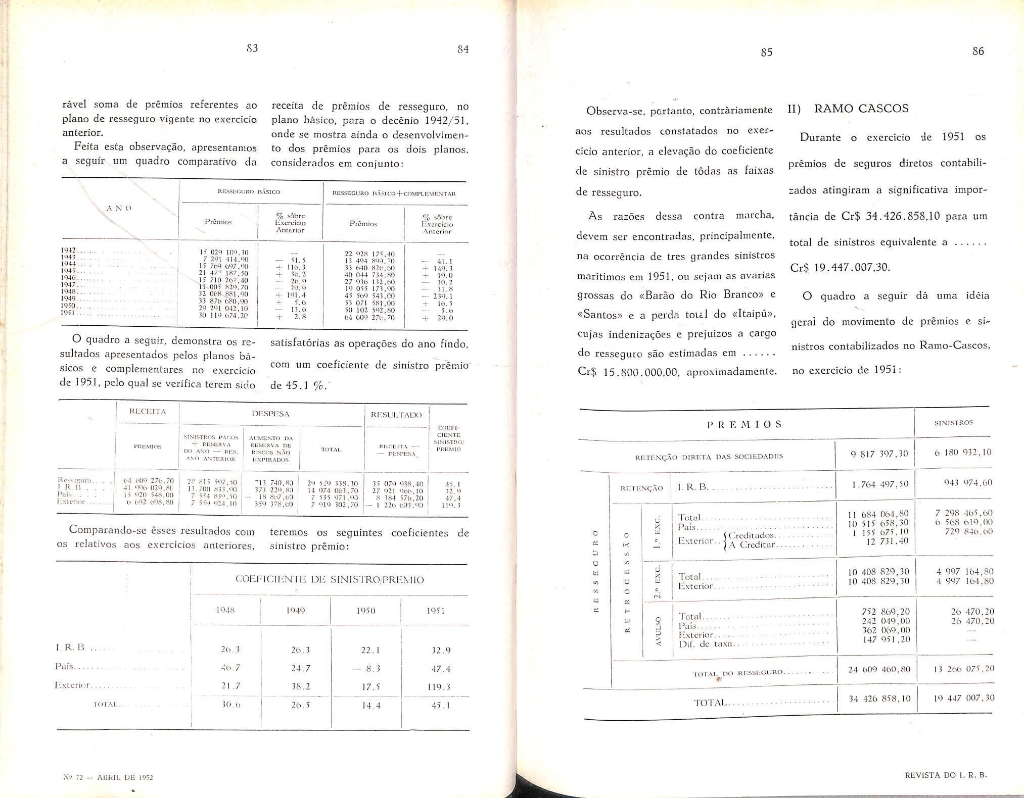 Balance Geral do exercicio de 1951, coluna 3 — Atividades do I.R.B. em 1951. coluna 21 — O novo decreto do Brasil restringindo a rC' messa de lucros: Mario da Camara, coluna 177 — Os riscos de credito: David Campista Filho. coluna 183