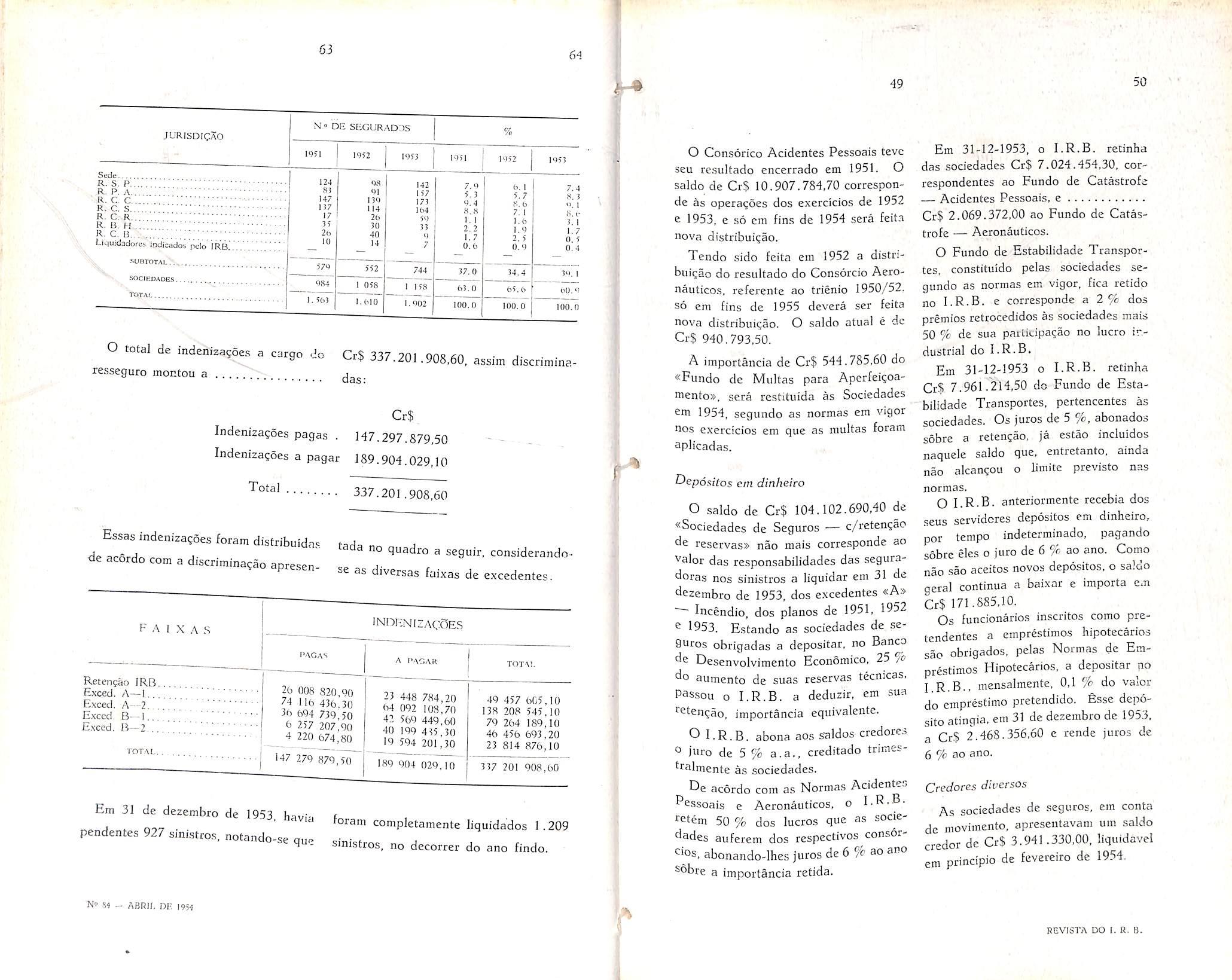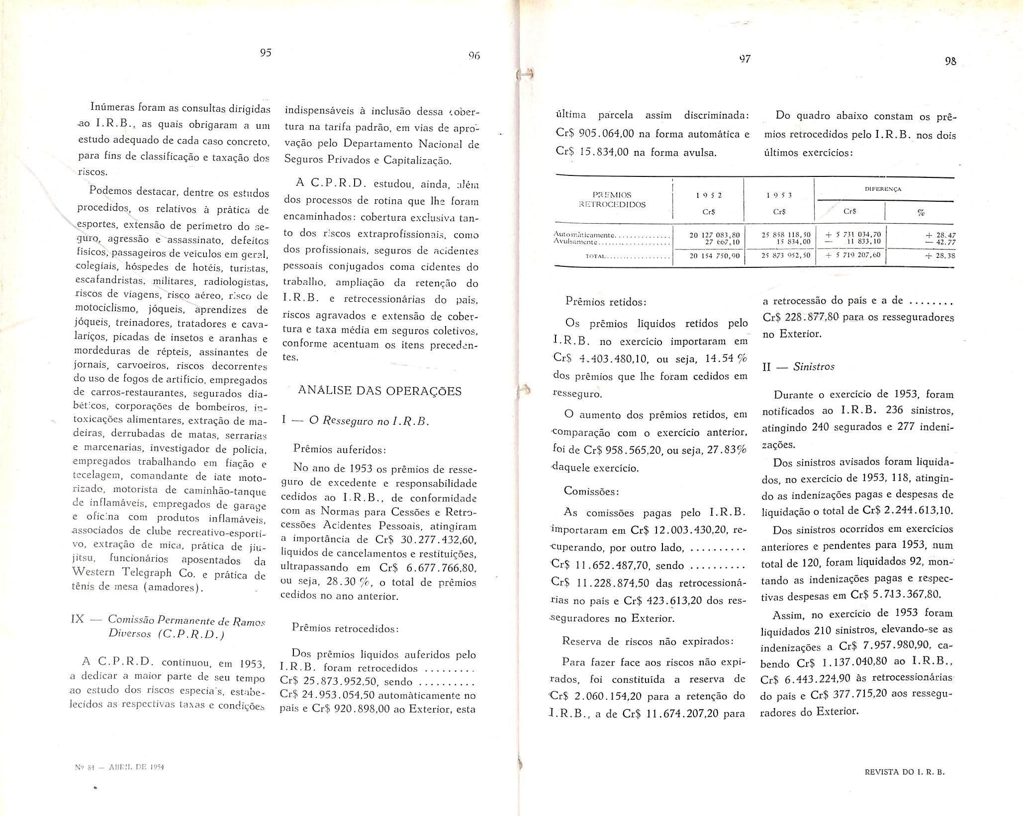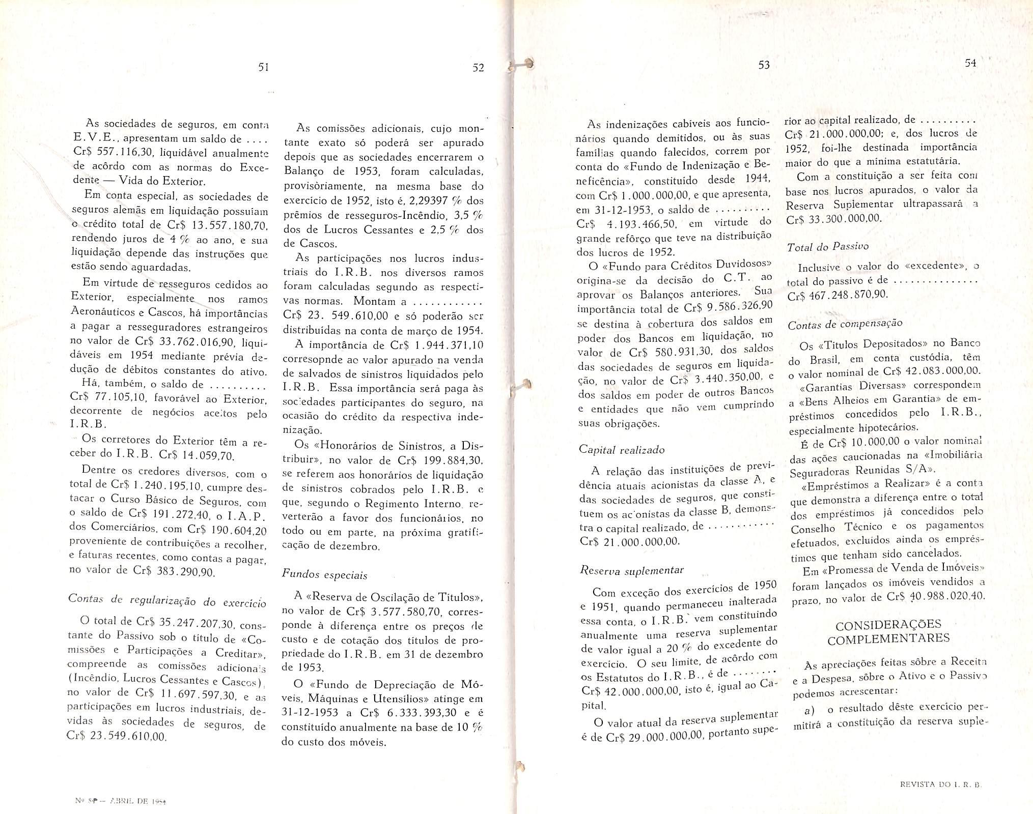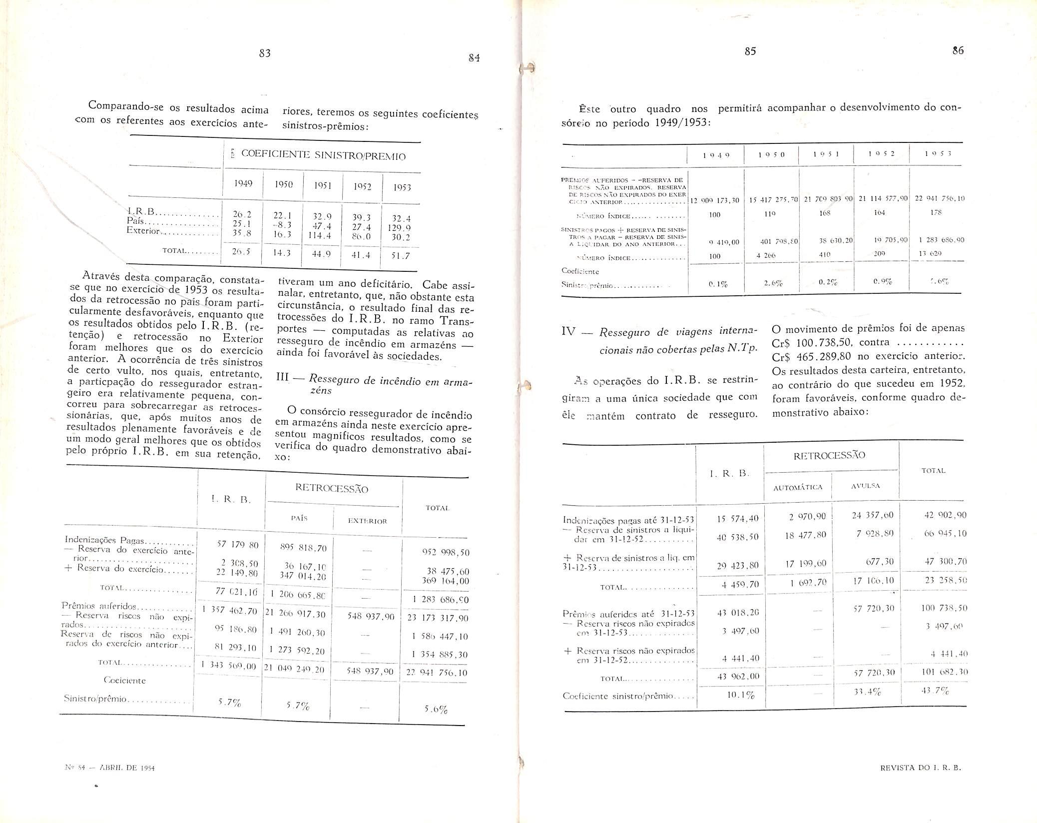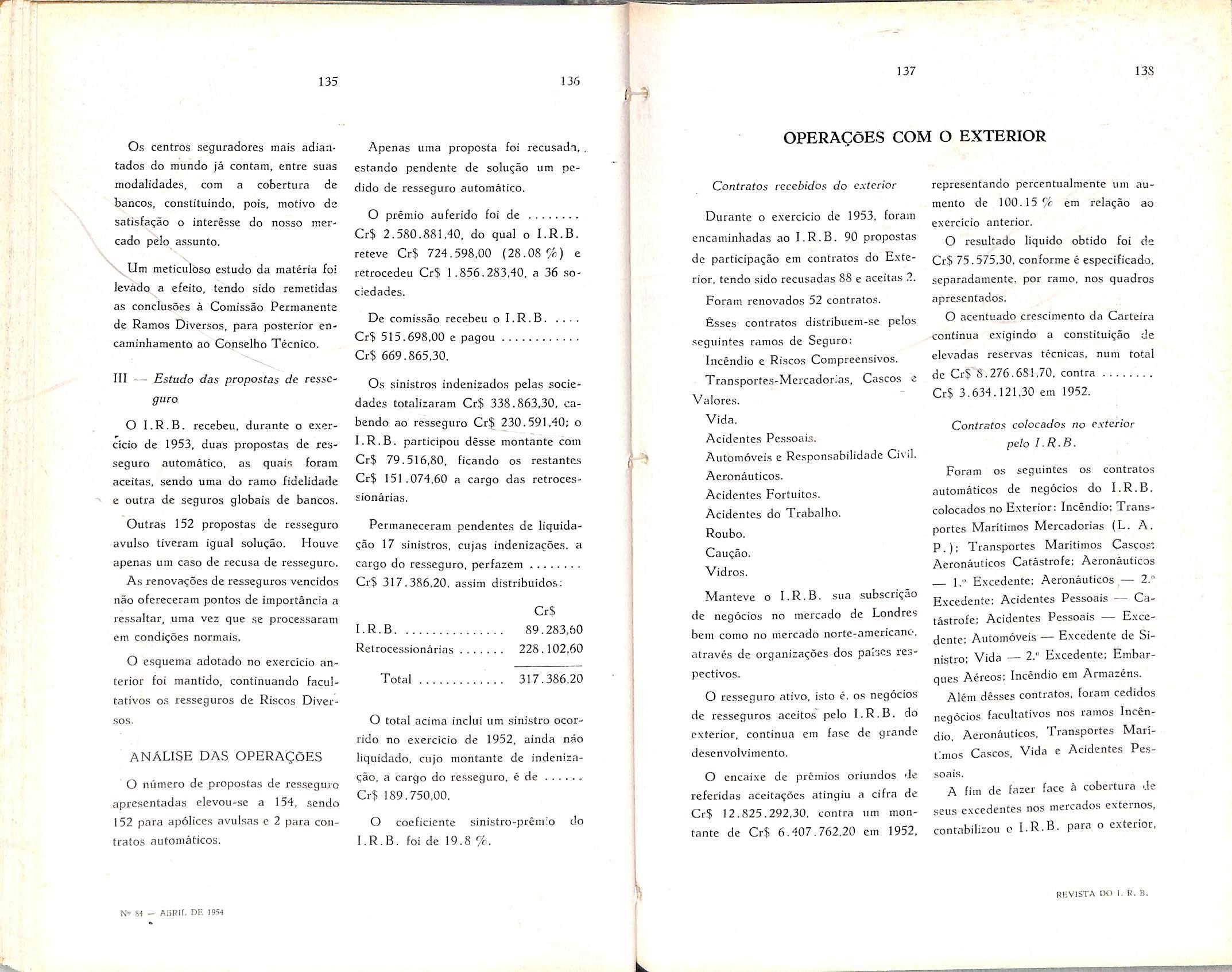 Balanço Geral do I.R.B. em 1953, coluna 3 - Ativid;idcs do I.R.B. em 1953, coluna 25 -O resseguro de lucros cessantes: Hélio C. Teixeira,, coluna 147 - Inci;ndios a bordo de navios: Thorolf Wlkborg, coluna 159