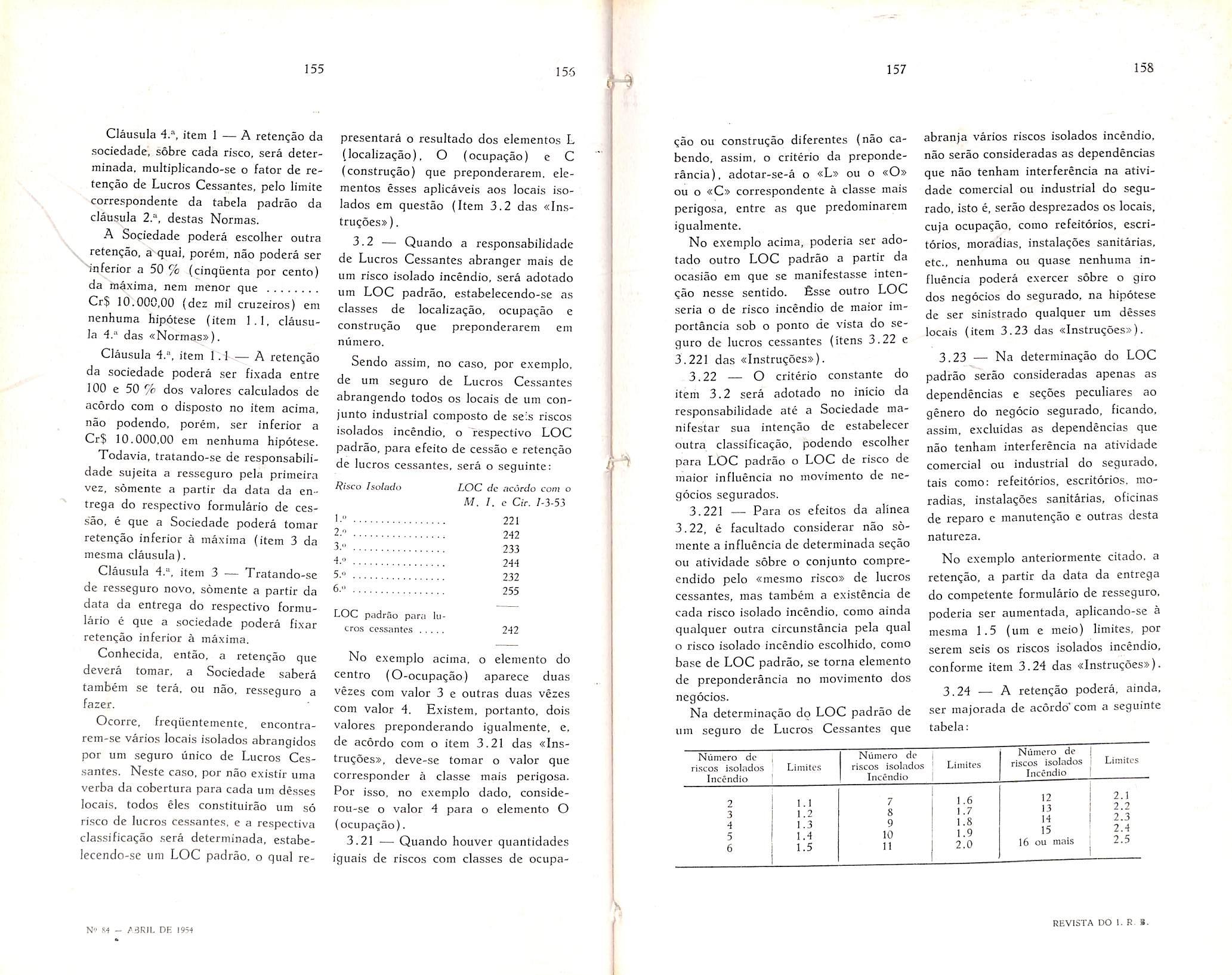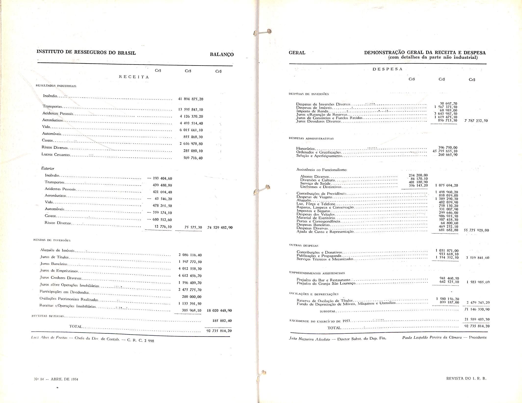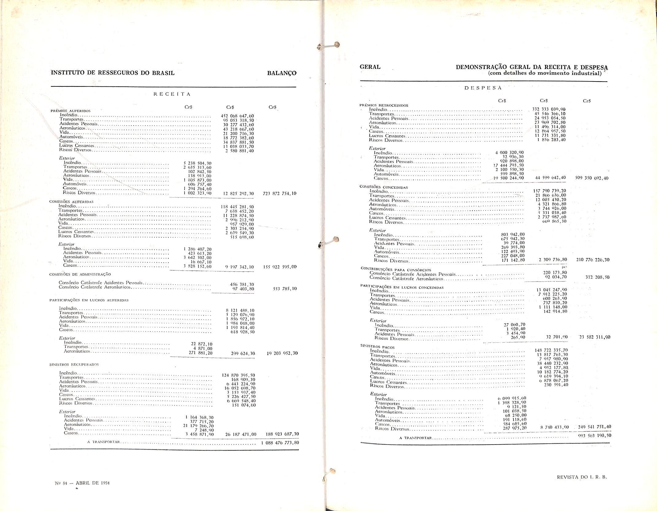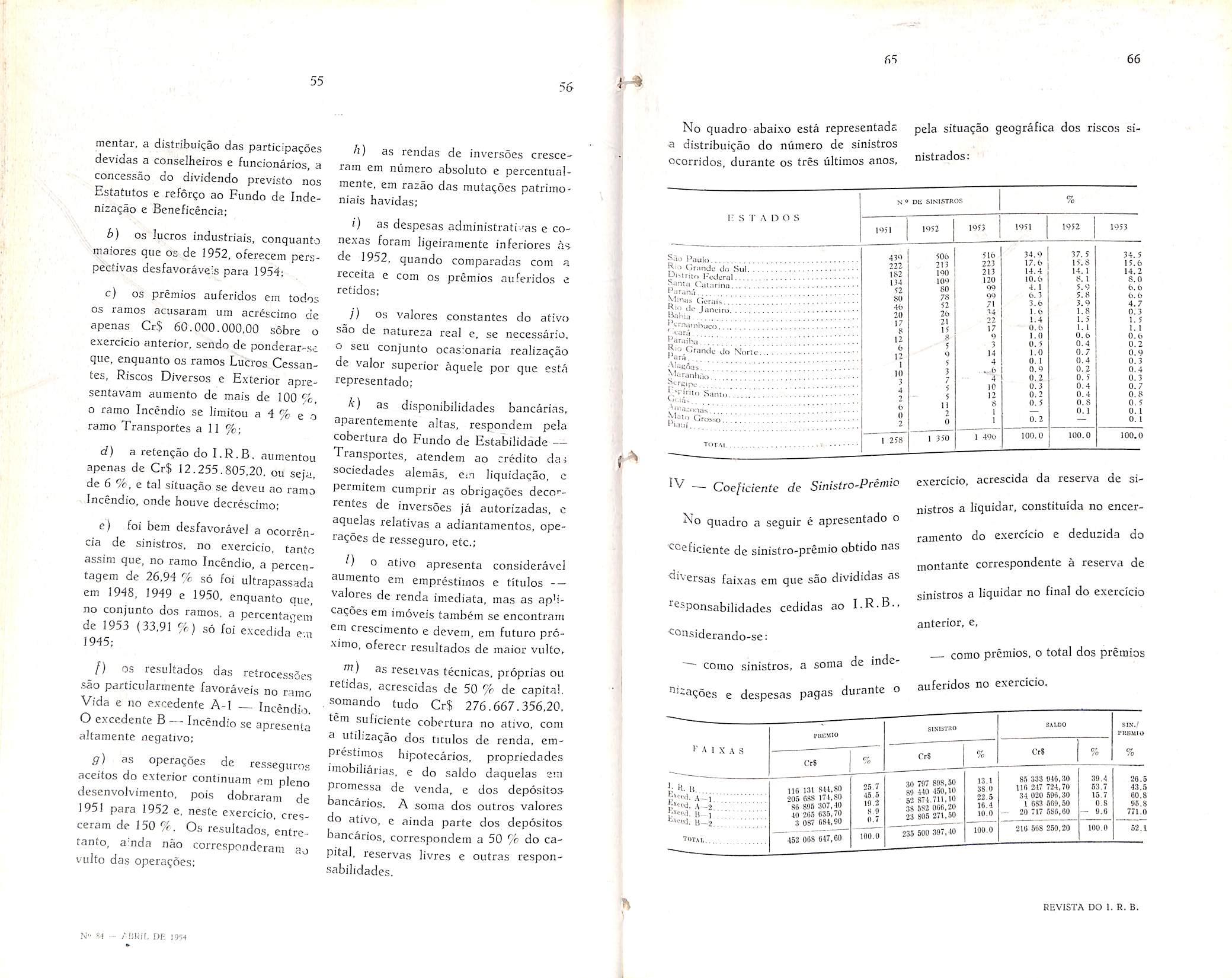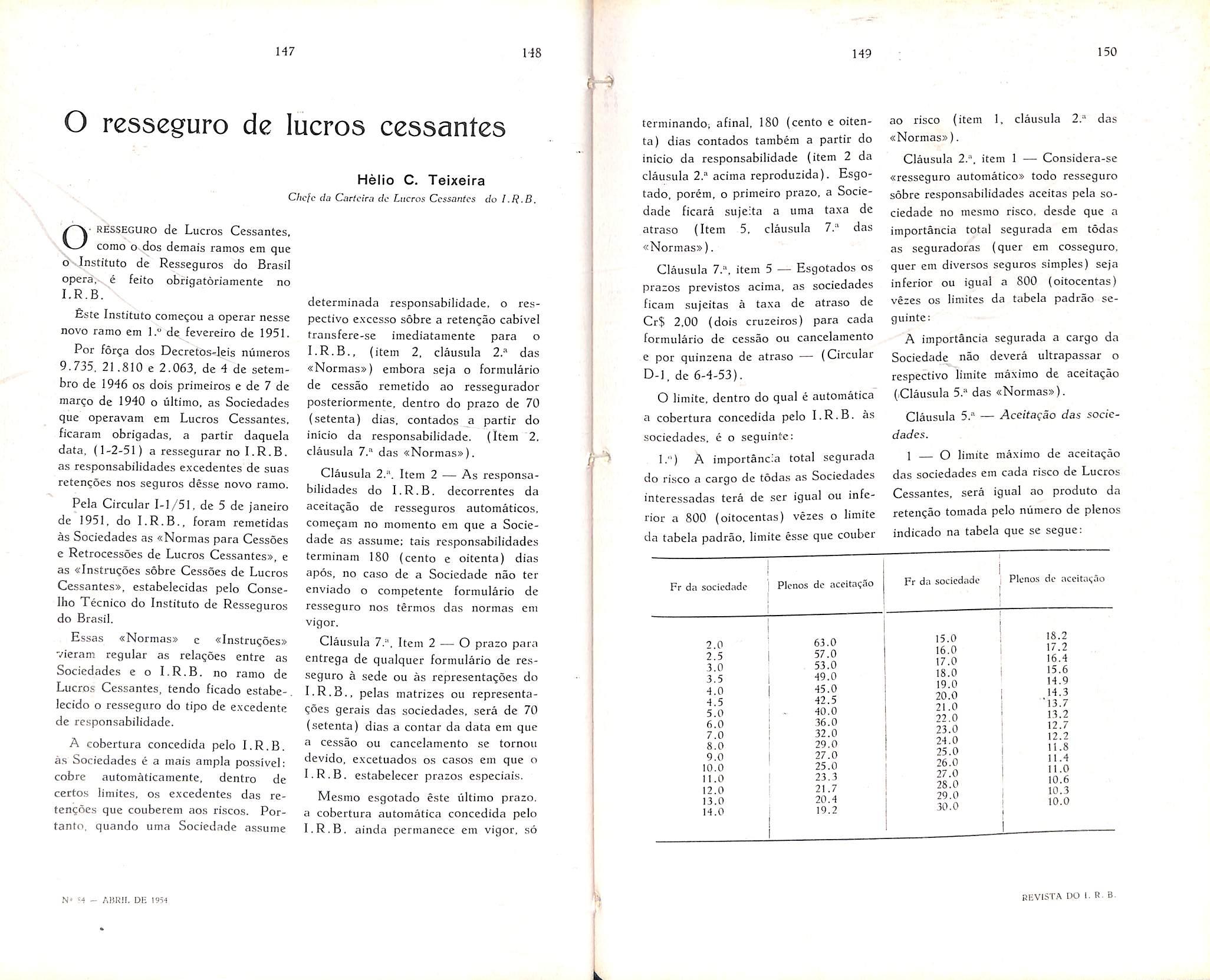 Balanço Geral do I.R.B. em 1953, coluna 3 - Ativid;idcs do I.R.B. em 1953, coluna 25 -O resseguro de lucros cessantes: Hélio C. Teixeira,, coluna 147 - Inci;ndios a bordo de navios: Thorolf Wlkborg, coluna 159