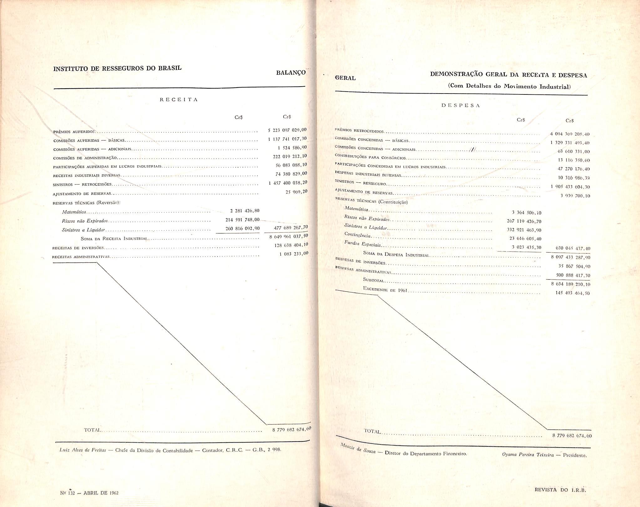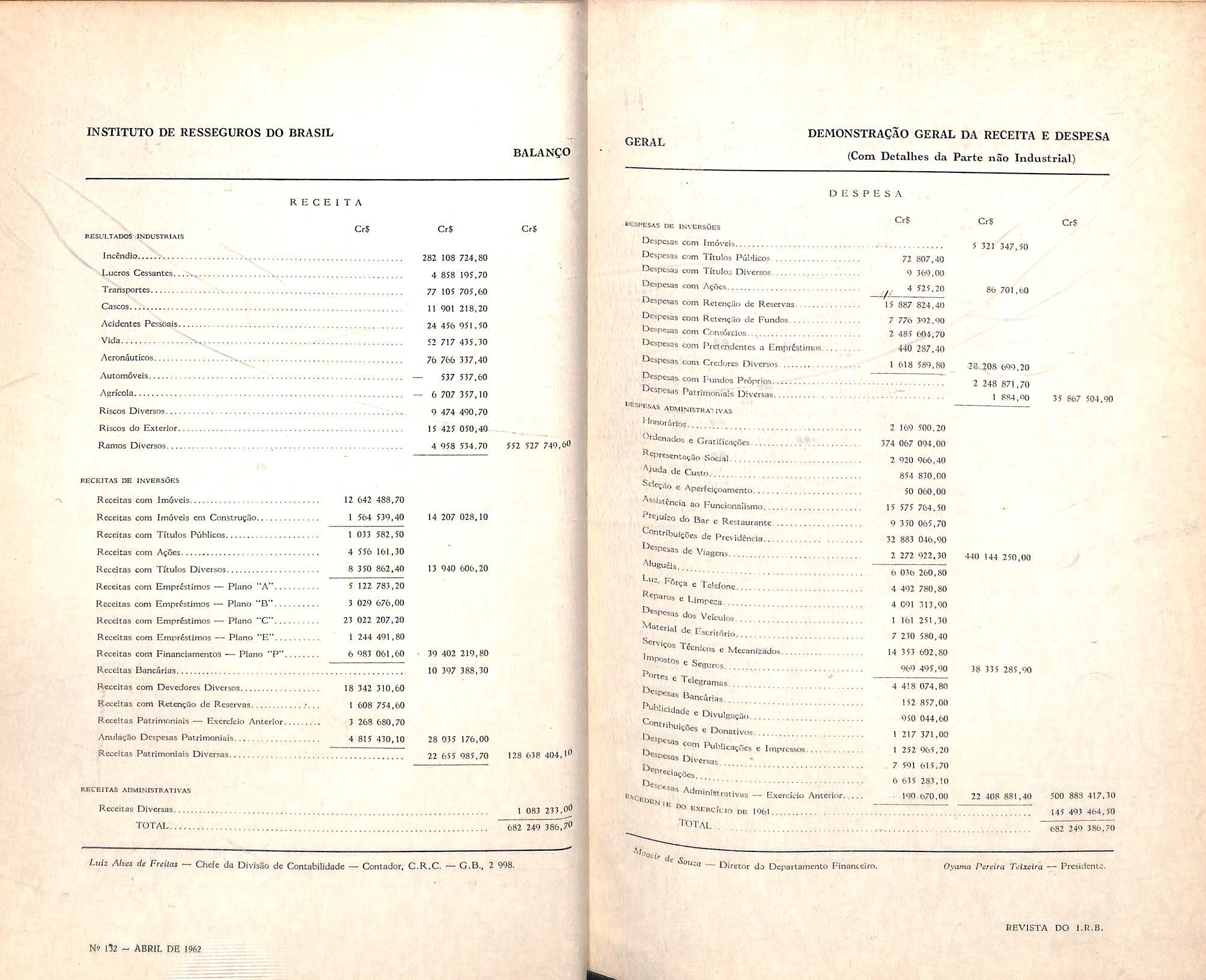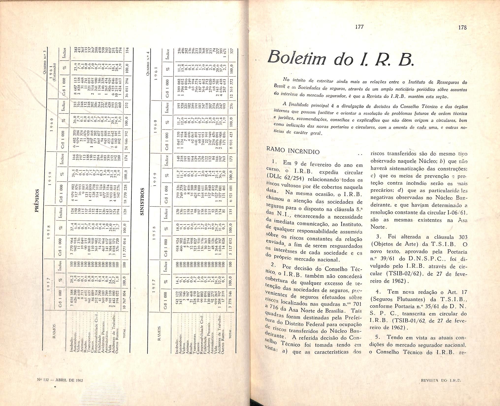 I.R.B, — Mais um aniversario; noticia, col. 3 — Administragao do I.R.B.; algumas linha,s basicas da politica em execu^ao: entrevista: Oijama Pcreira Tci.xeira, col, 7 A cobertiira de primeiro li.sco; cntrevista: Celio Olimplo Nascentea, col, 15 — Sinistro do navio Areia Branca: parecer, col. 21 — Coloca;ao de seguros do governo; Decreto n." 569, de 2 de fevereiro de 1962, col. 35 — Liquidai;ao de sini.stro.s: pedra-de-toque da cficiencia do seguro; entrevista: Geraido de Souza Freitas, col, 43 Novos dirigentes na orgnnizaqao sindical do seguro; entrevista Claudio dc Almeida Rossi, col. 49 — Introducao a teoiia matematica do seguro: J. }. de Souza Mendes, col, 55 — Criado o seguro de credito para e.xportai;Io: De creto n." 736, dc 16 de margo de 1962. col. 79 — Proporcionais e formulas derrogatorias nos seguros de incendio; tradugao, Edoardo Bonanate. col. 89 Problemas do Seguro brasileiro: relatorio: Angela Mario Cerne, col. 105 Organizagao para a Cooperagao Economica Europeia, col. 131 — Balango Geral do I.R.B. em 31 de dezembro de 1961, col, 159 — Dados Estatisticos: Estimat.'va de premios e sinistros para 1961, col. 171 — Boletim do I.R.B. col. 177 —Noticiario do Pais. col. 183 — Noticiario do Exterior, col. 189.