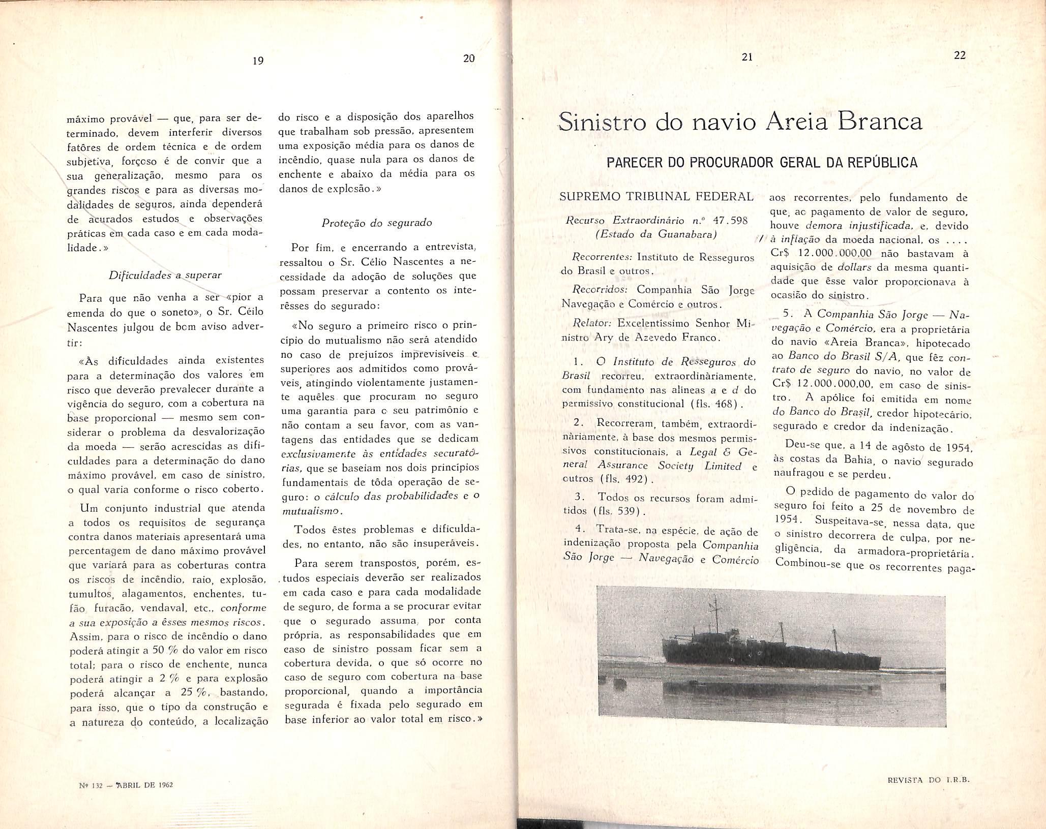 E honrando as justas expectativas do Conselho de Ministros, o I.R.B. ja se mostrou capaz de realizar dois dos maiores seguros de cascos de entidades govefnamentais {Petrobras e L6i4.e Brasileiro), dentro de condi^oes e taxas que atendem aos interesscs dos segurados.»