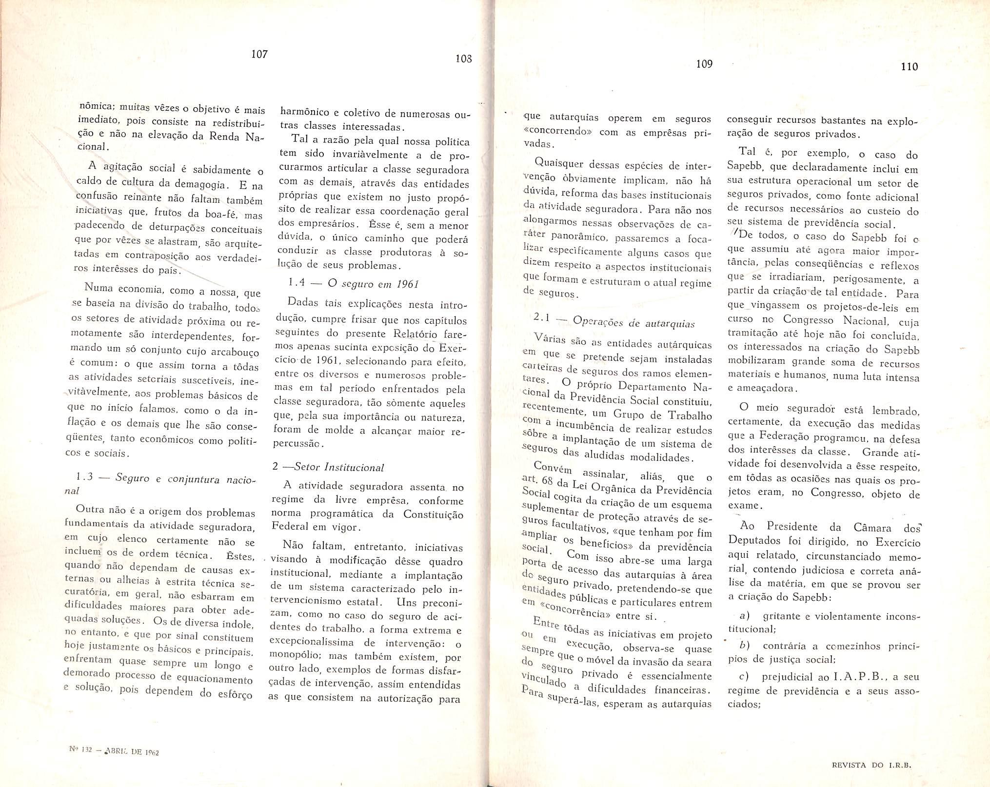 «Grandes reformas de base estao sendo encaminhadas no terreno economico do pais, as quais irao ter, por certo, enorme repercussao no mercado do seguro,, obrigando-o a preparar-se desde logo para fazer frente aos novos cometimentos, com as perspectivas de amplas muta?oes estruturais e o aparccimento de novos riscos e coberturas a atender. Serao problemas que os estudiosos e os conhecedores da ciencia do seguro haverao de enfrentar para buscar-lhes solugoes condizentes com a epoca, OS fatos e as coisas.»