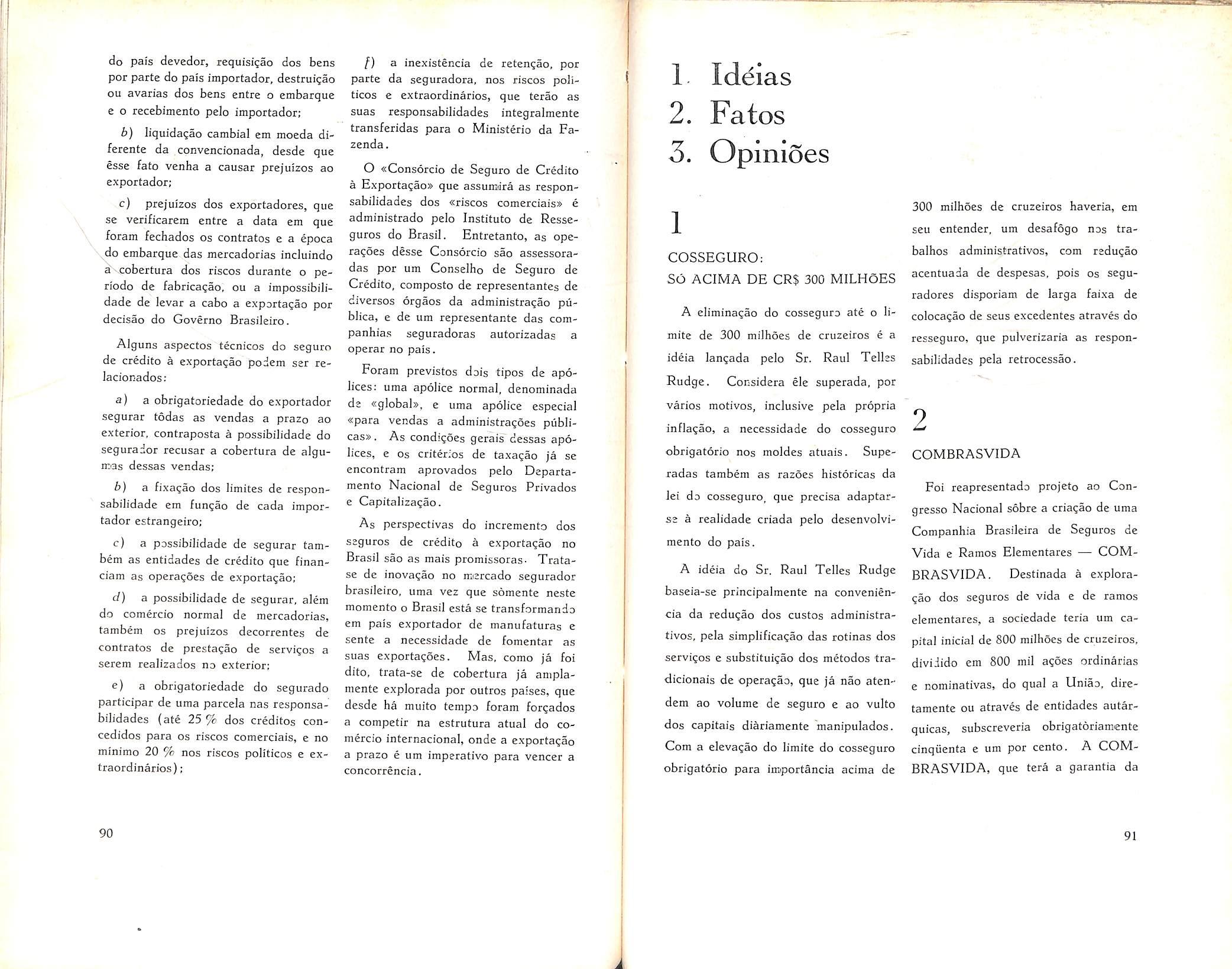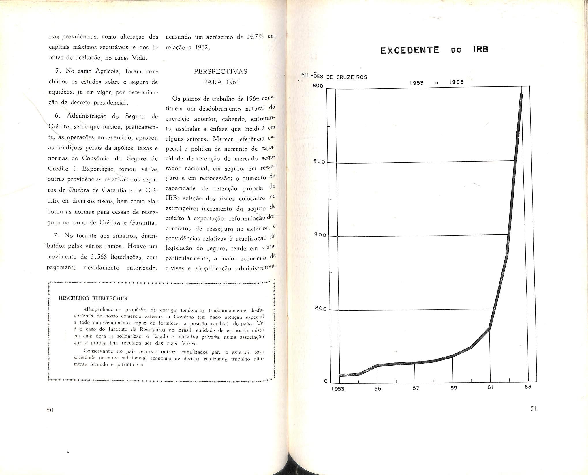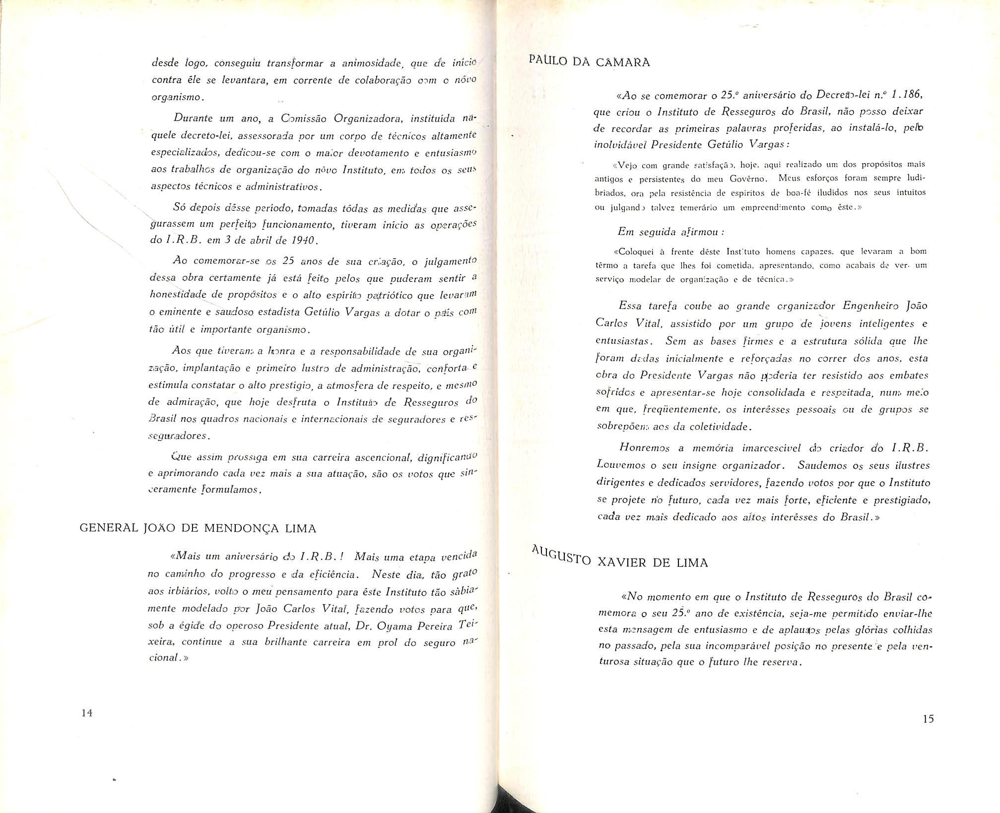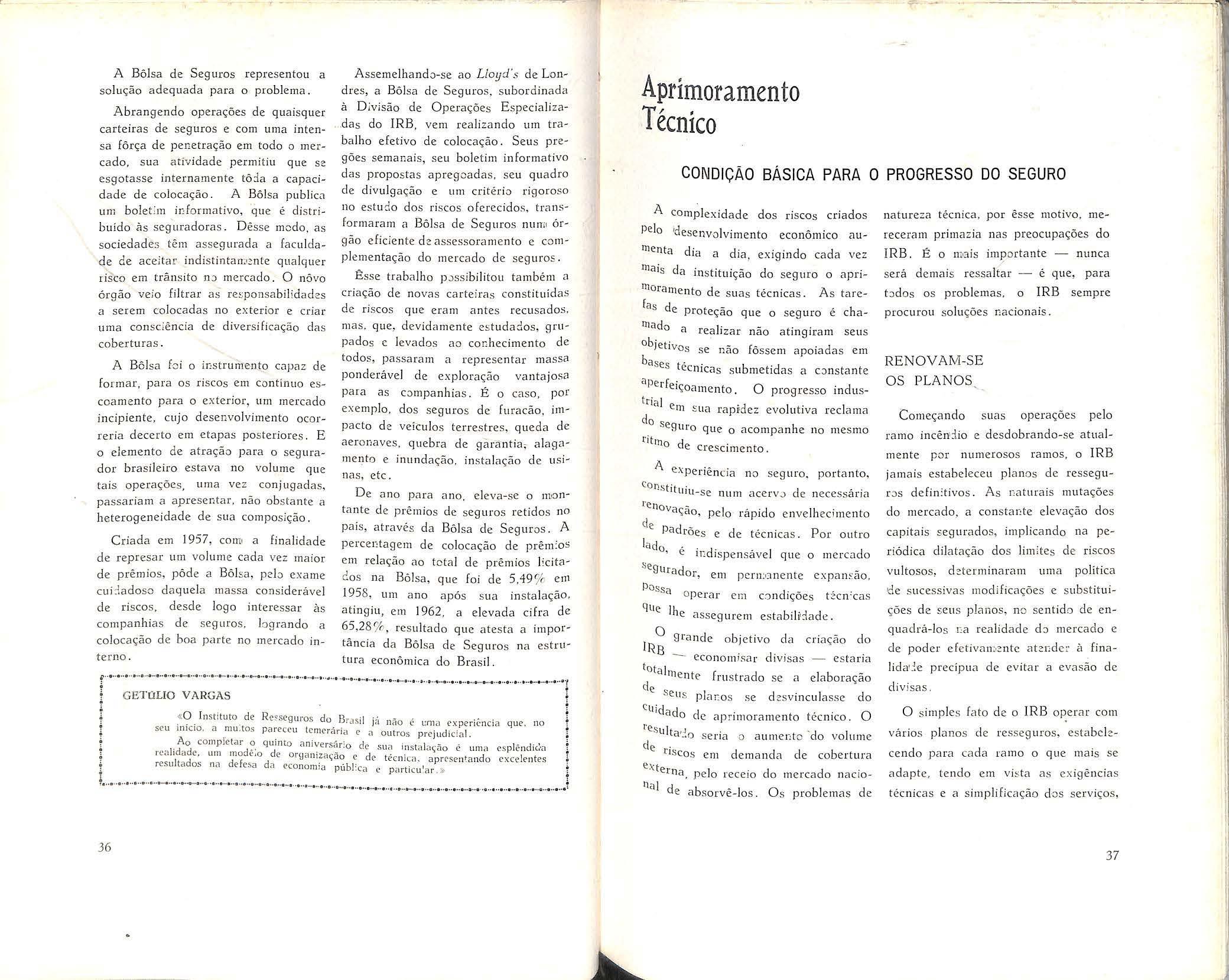 «Vitoricsa a ideia inicial dissc Instituto, cuia concepg^o expungidas quaisquet fathas primitivas, foi ate aprirnorada ^la critica dos que a estiidaram oa combateram, matca ^ Goi'etno Nacional, com essa medida. uma nova etaaa impoc' tantissima^ na esfera das realizagoes que enaltecem sua objetivacao sccio-economica, dando um renovado e vigorodo pulso ao desenvolvimento dos Seguros em nosso pSls, mecce de.uma coordenacao hatmoniosa e clarividente.»