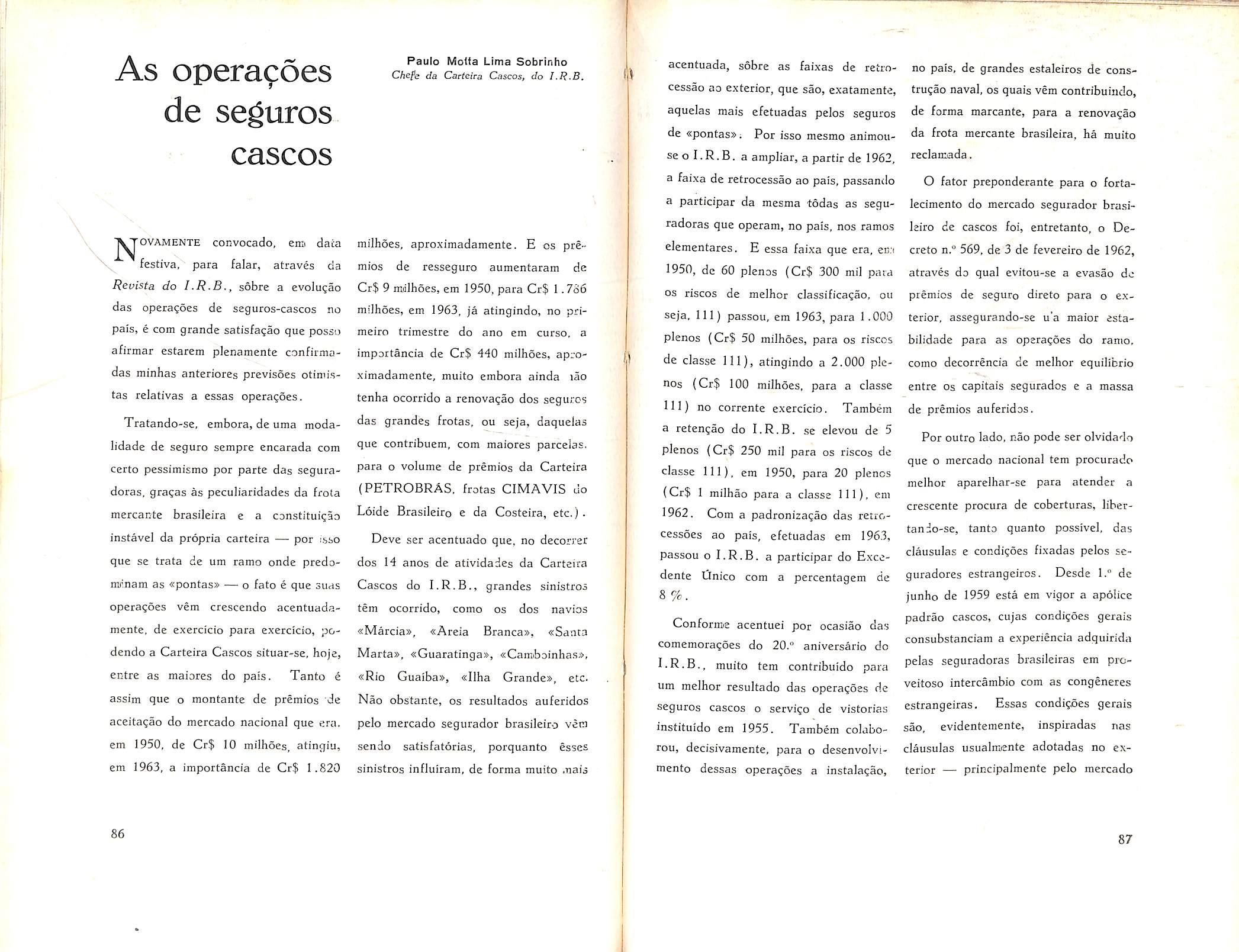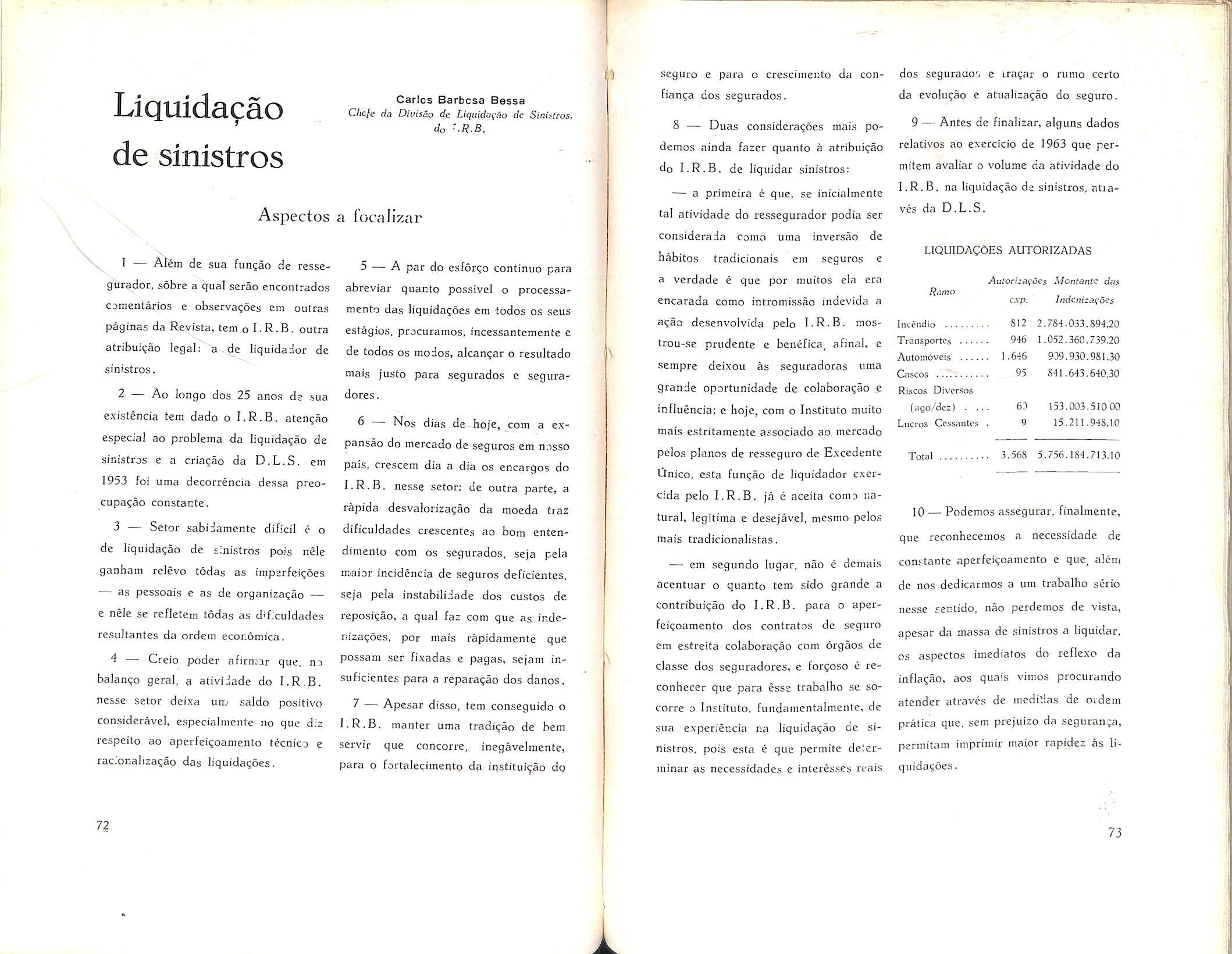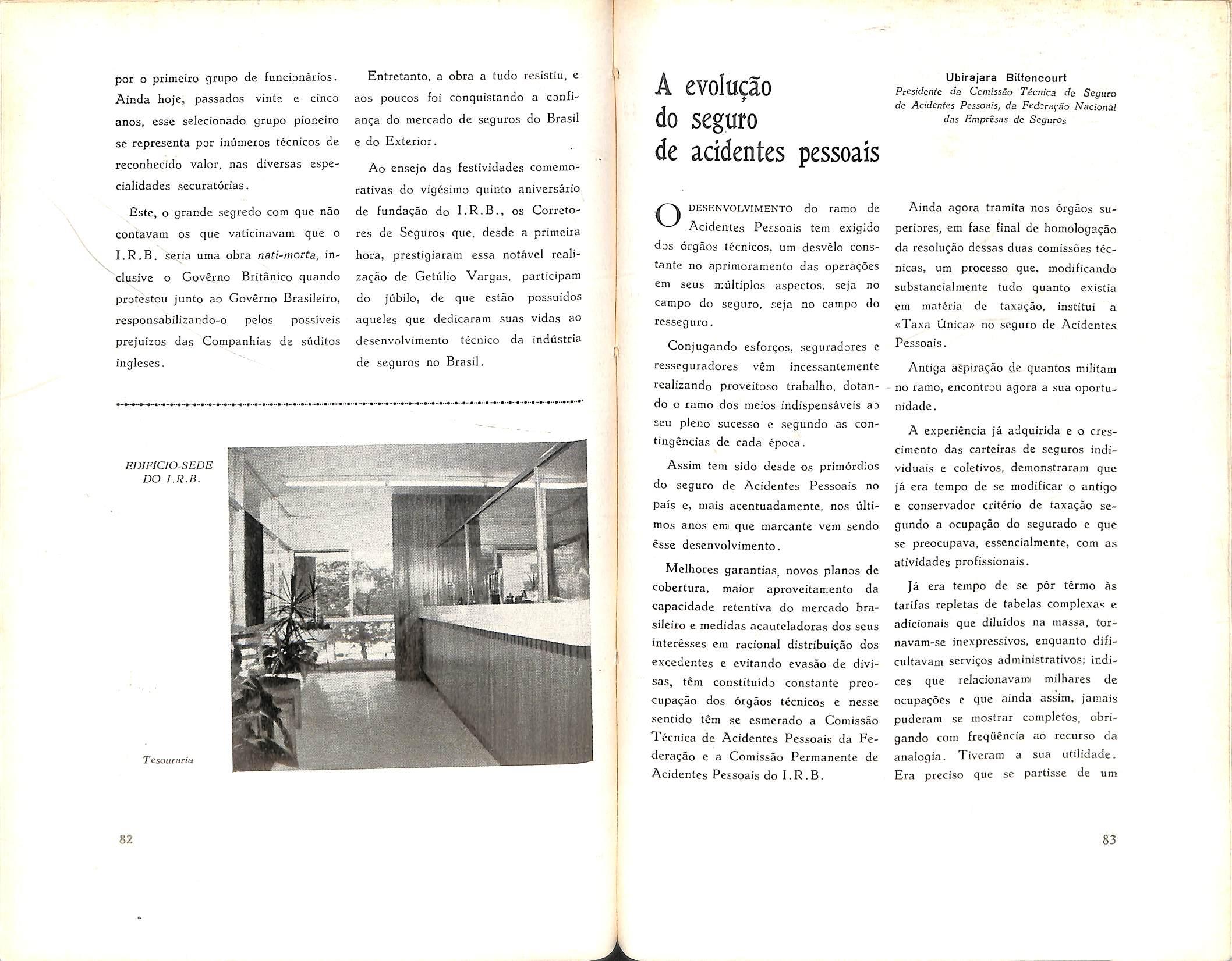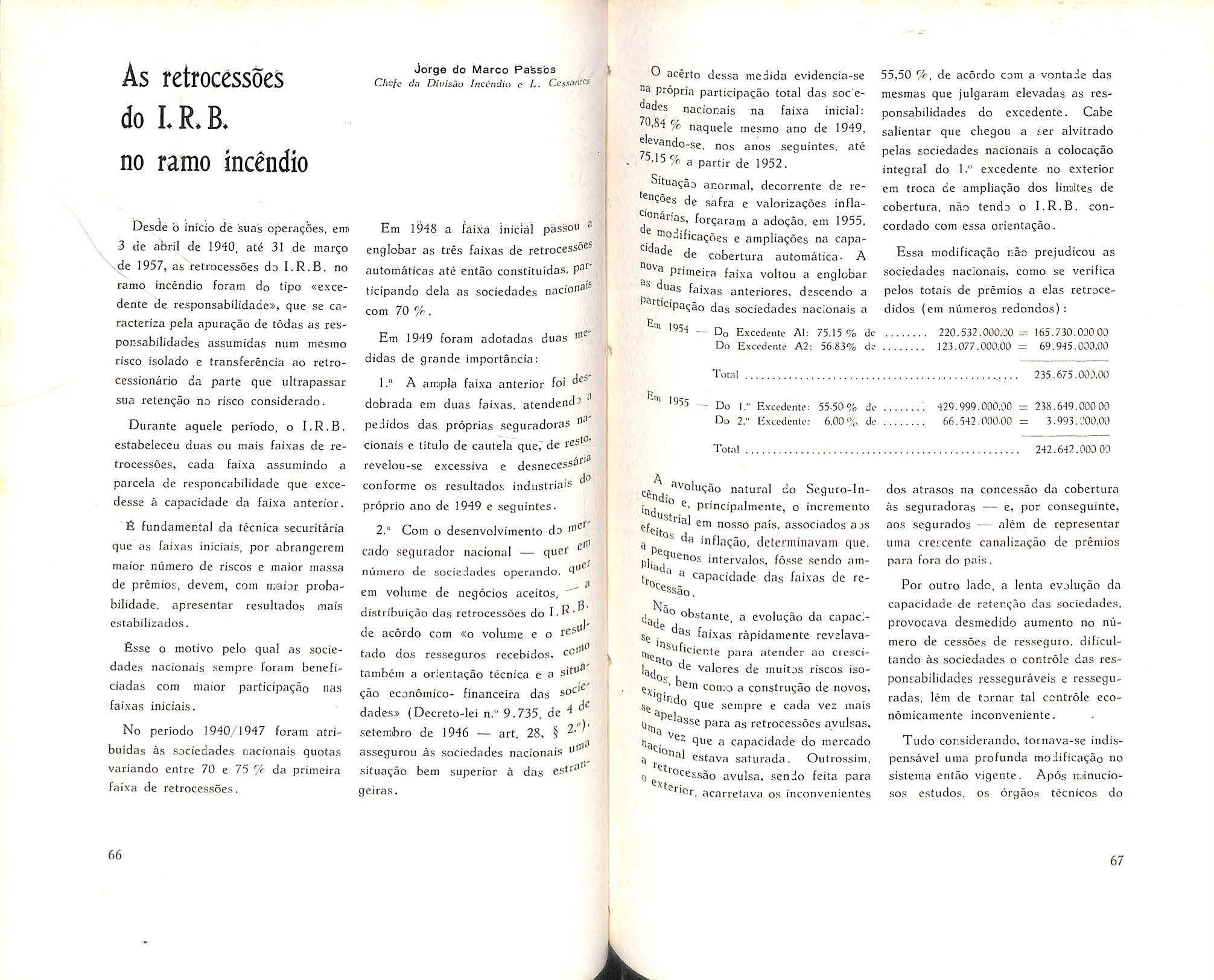 «3 de abril de 19-10 rnarcara epoca na historia do scgw To cm nosso pats, com o tnicio das atividades principais do LR.B. que. embora, no momento. alias sabia e prudentemen' te, se lance apenas as opscacdes de resseguros dontra riscos de incendio. dentro em breve alargara o sen canipo de .agao. de modo a concorrer, acentuadamente, para o engcandedmento do comercio nacional de scgur.os, aquem< e alem das nossas honteiras, em aproximagao proveitosa e confiante com o mercado de nagoes amigas, e, acertamente, tamberti' para o apuramento tecnico dos metodos de trabalho das nossas seguradoras.)^