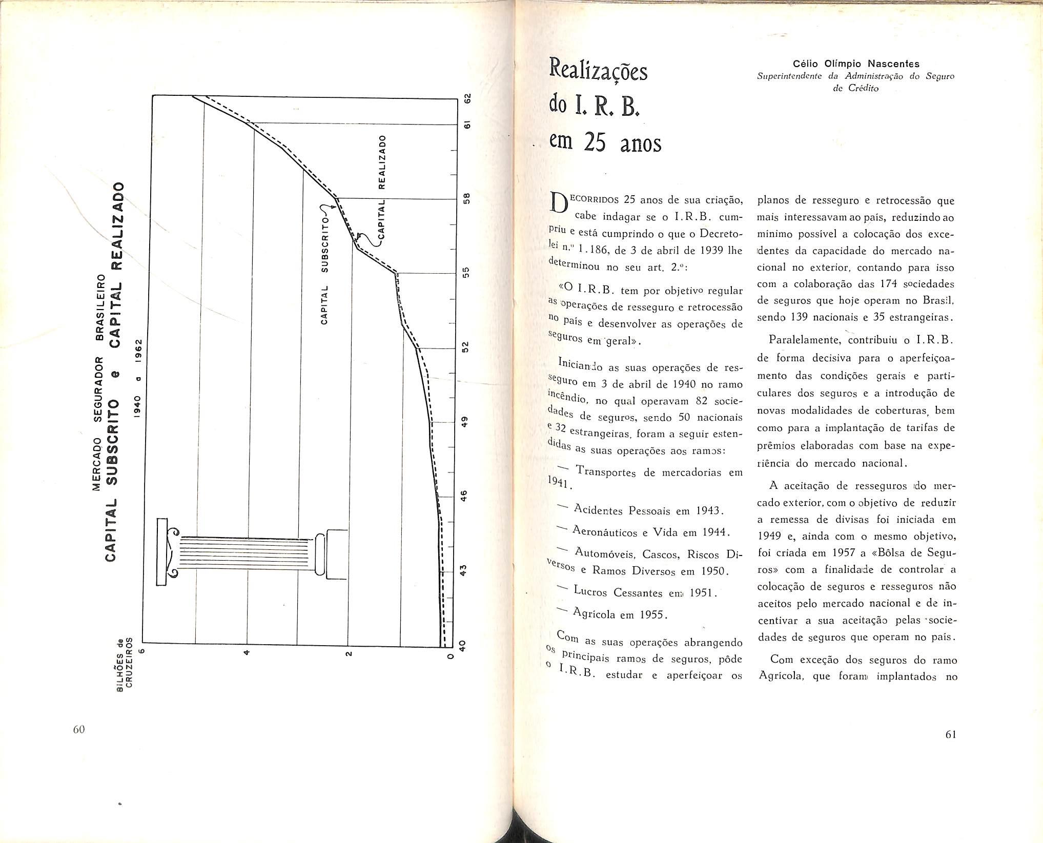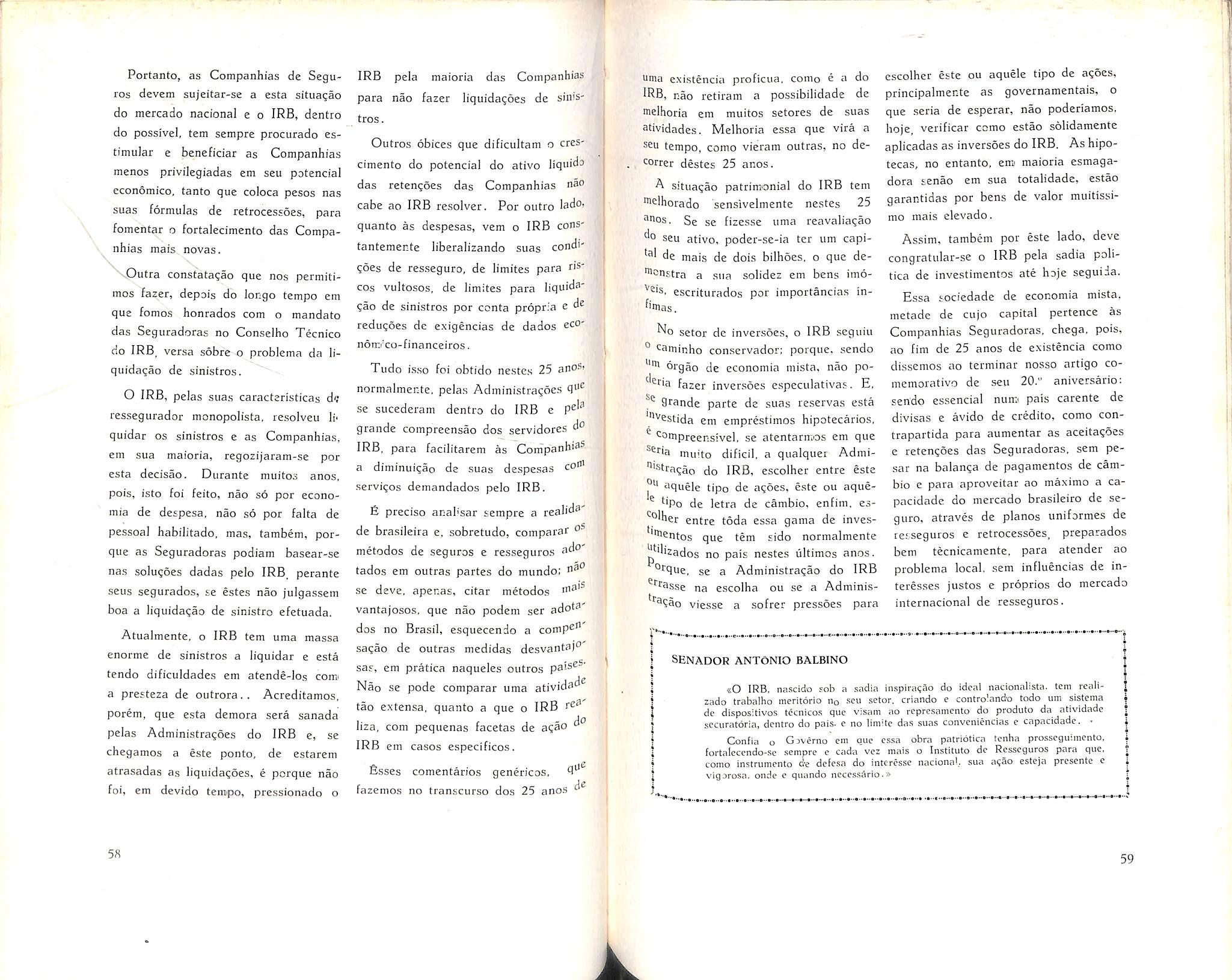 «0 Instituto de Resseguros do Brasil esta destinado atingir a sua [inalidaae em espago de tempo muito menot do que poderiam calcular os mais otimistas e do modo mais arriplo que se poderia desejac, verificando-se, conseqiientemen' te ter o gnverno coriseguido dotar o pais de um orgao regii' lador do mercado de resseguros, com capacidade legal e /'' nanceira e absoluta idoneidade para manter em crescendono 5efor dessa atividade economica, a confianga, cada oc2 maior que ninguim pods regatear ao Bra.sil, quanta ao portante papel que Ihe esta rcservado no conccrtti mundi^^ das grandcs polencias.»