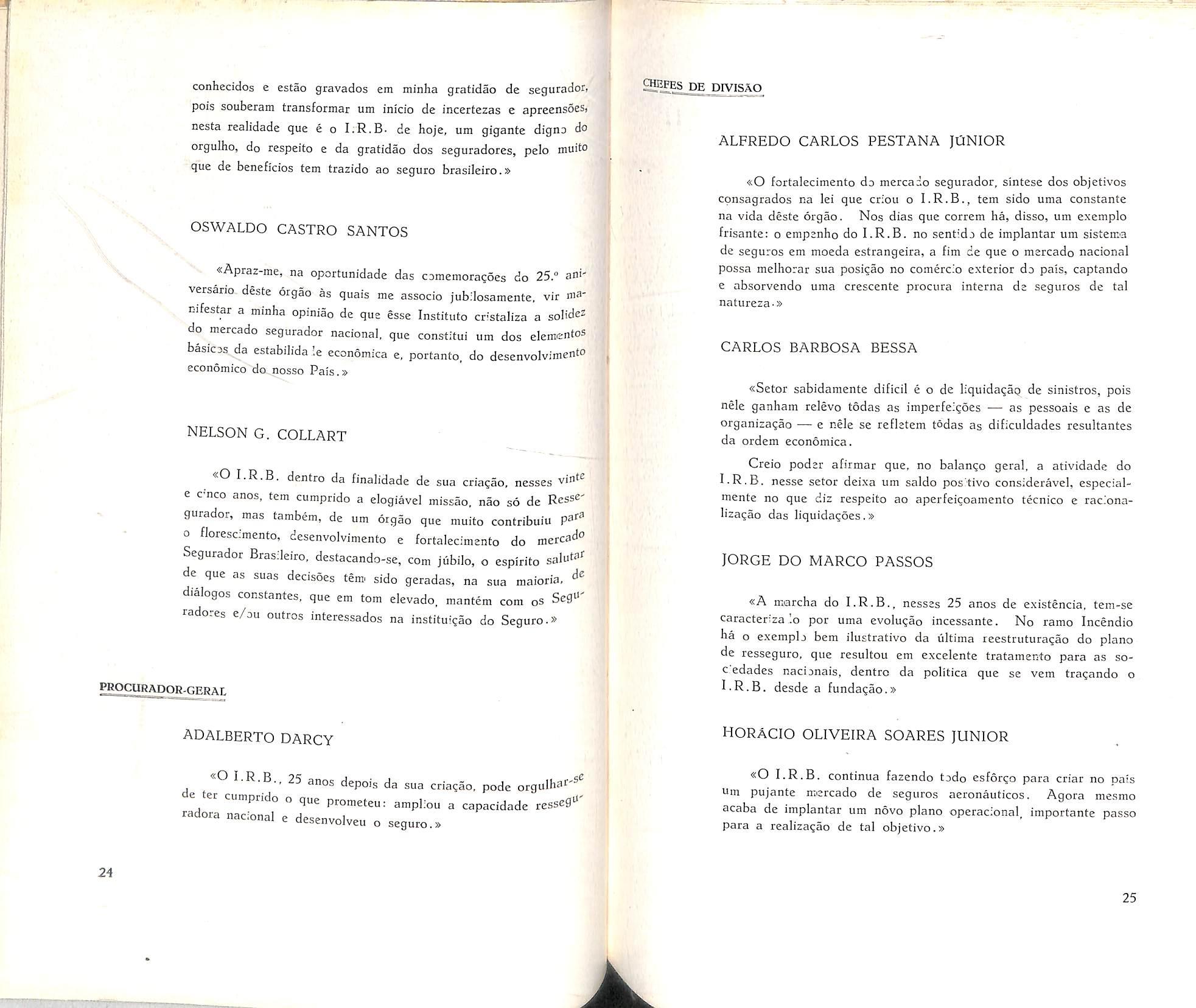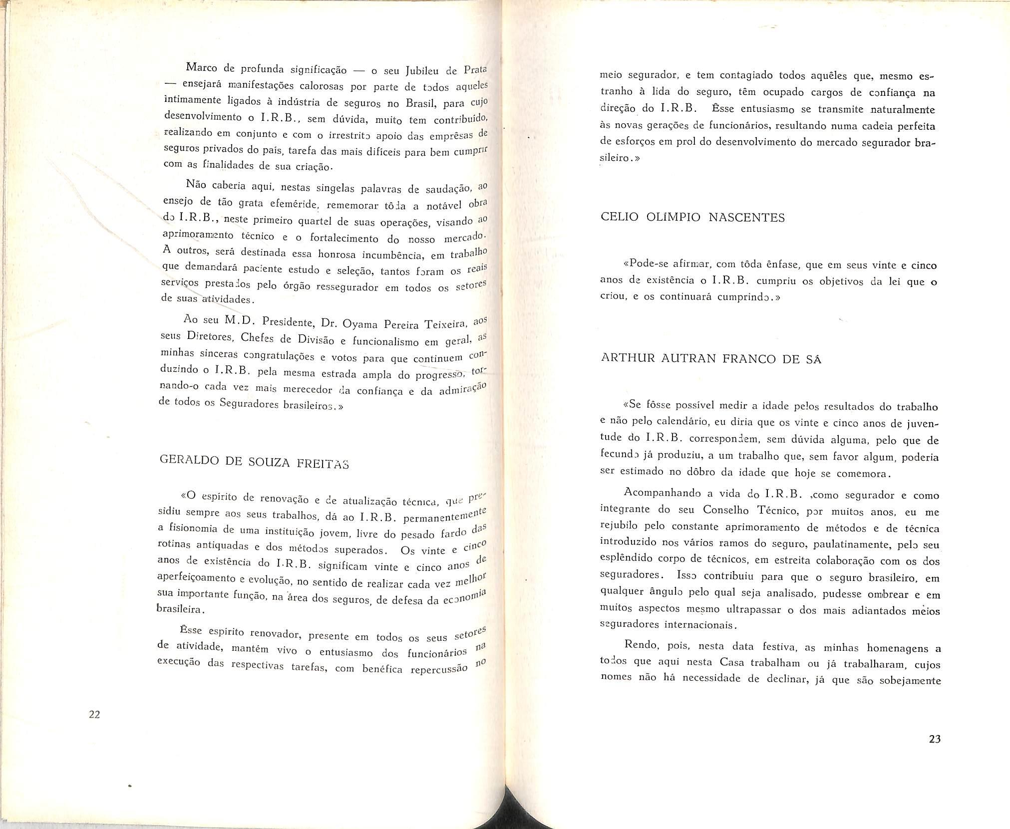 <iAo se comemorar o 25." anwersario do DecreSo-lei n." 1.186, que criou o Instituto de Resseguros do Brasil, nao posso deixar de recordar as vrimeiras palavras proferidas. ao instala-lo, pelt inohidaoel Presidente GetuUo Vargas: