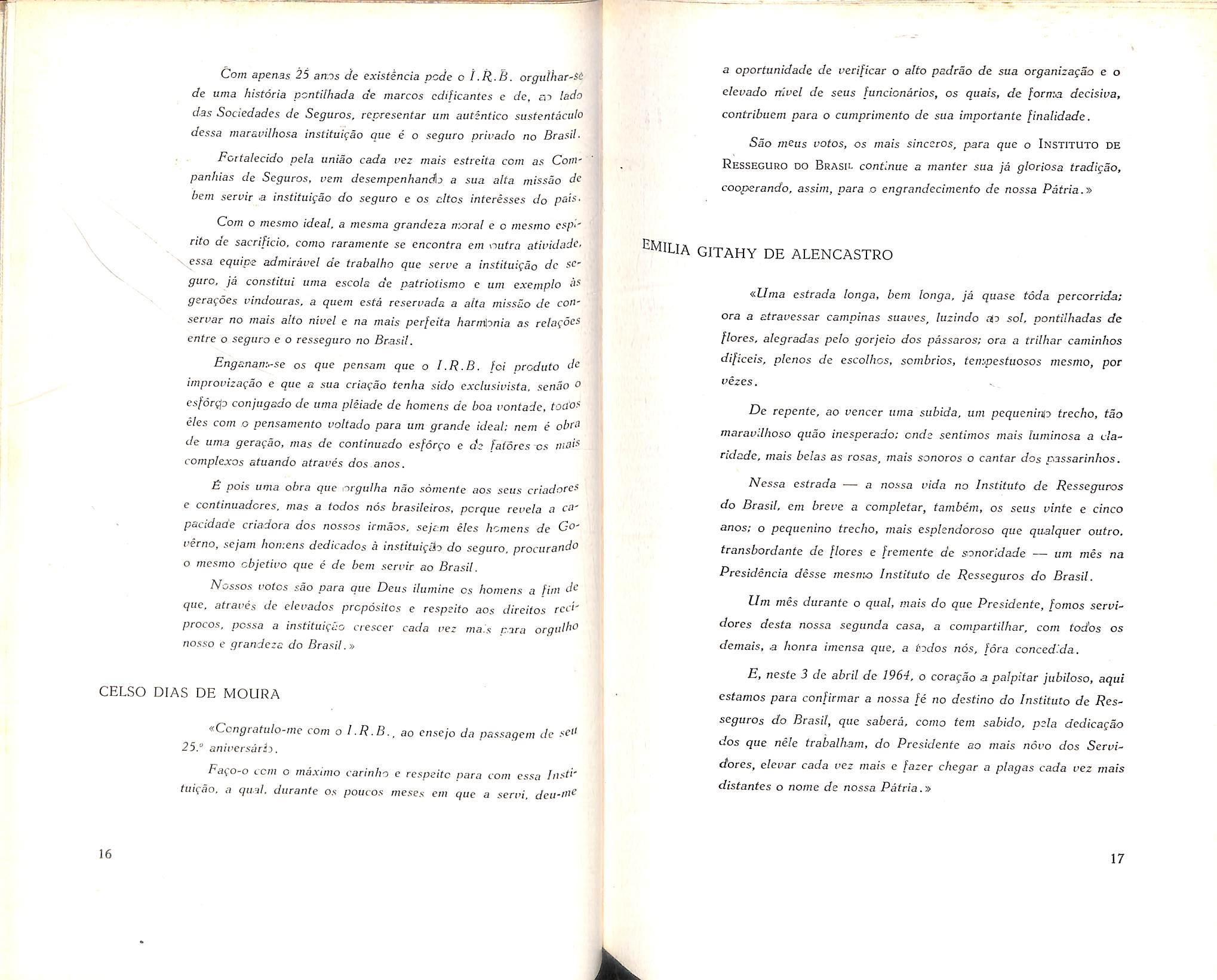 «.No momento em que o Instituto de Resseguros do Brasit comemora o seu 25.° ano de existencia, seia-me permiddo enviar-lhe esta mcnsagem de entusiasmo e de aplau.iiOs pelas glorias colhidas no passado, pela sua incomparavel posigao no presente e pela venturosa sffuafao que o futuro Ihe reserva.