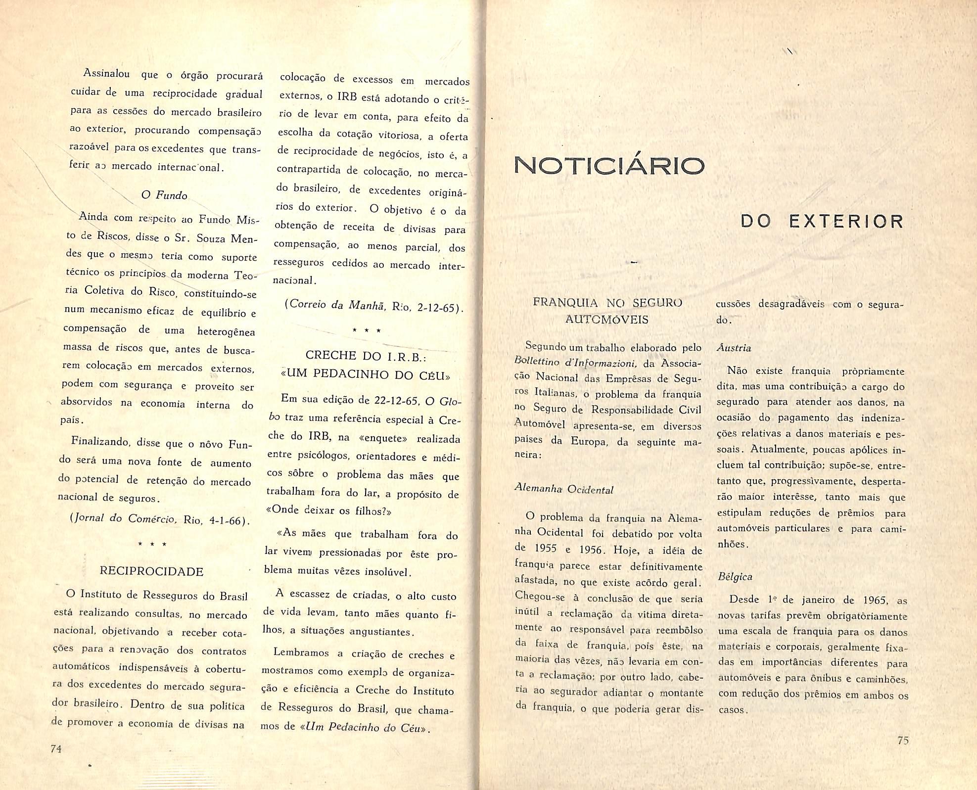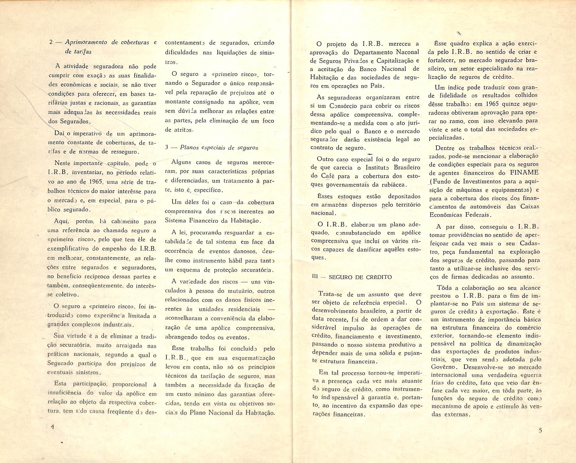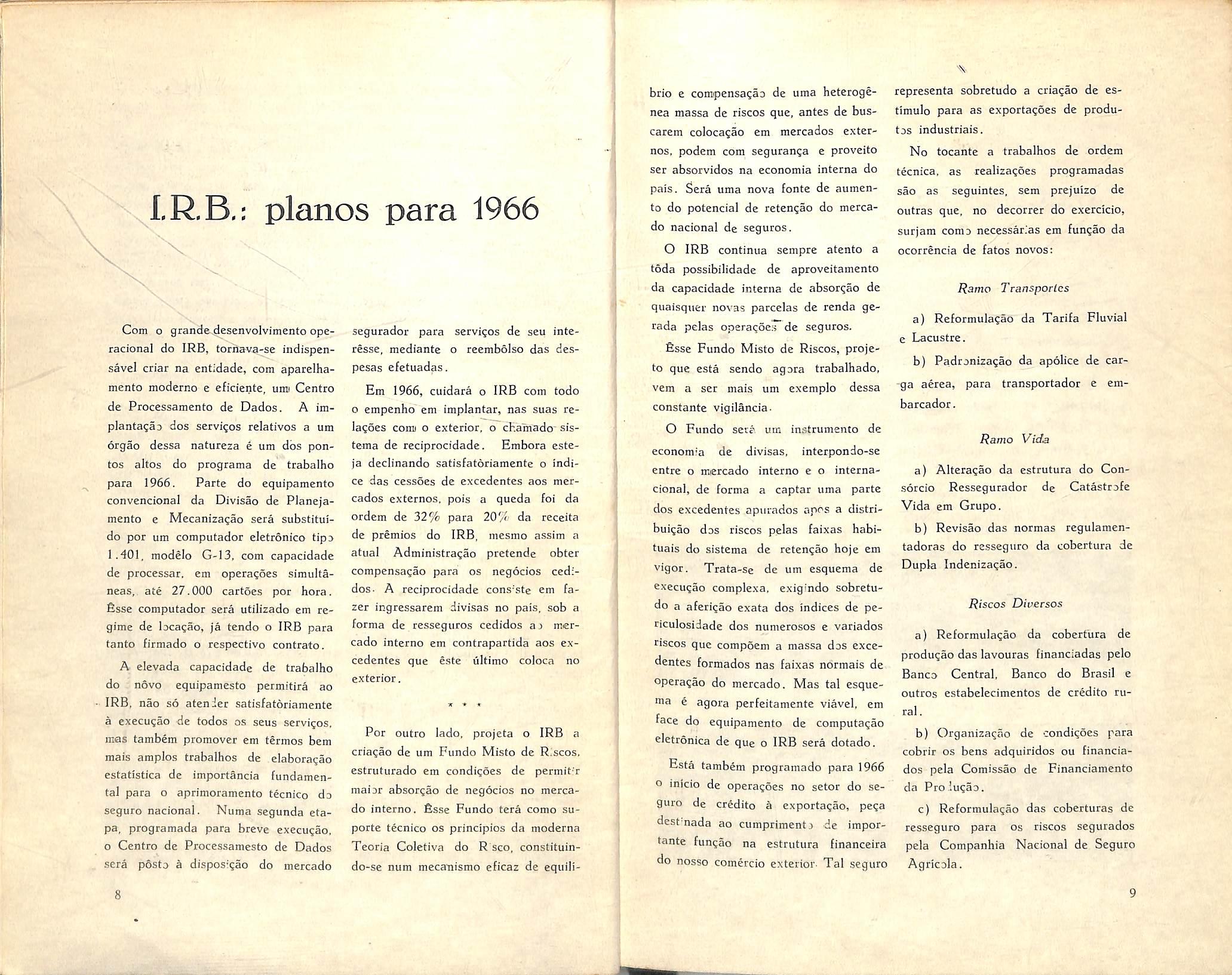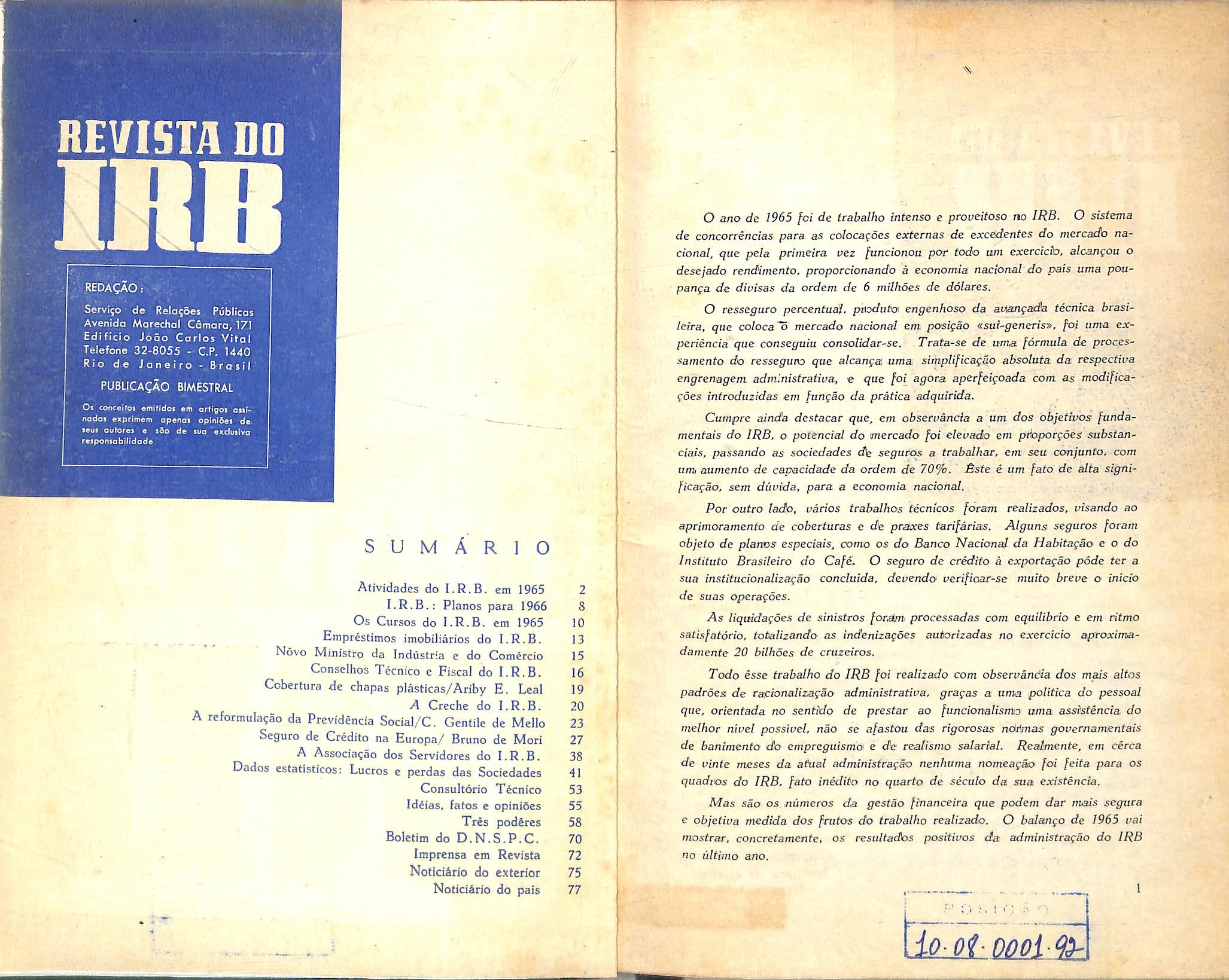 I O Atividades do I.R.B. em 1965 2 Pianos para 1966 8 Os Cursos do I.R.B. em 1965 10 Emprestimos imobiliarios do I.R.B. 13 Novo Ministro da Indiistria e do Comercio 15 Conselhos Tecnico e Fiscal do I.R.B. 16 Cobertura de chapas plasticas/Adby E. Leal 19 A Creche do I.R.B. 20 A reformula^ao da Previdencia Social/C. Gentile de Mello 23 Scguro de Credito na Europa/ Bruno de Mori 27 A Associa^ao dos Servidores do I.R.B. 38 Dados estatisticos: Lucros e perdas das Sociedades 41 Consultorio Tecnico 53 Id^ias, fatos e opinifies 55 Ties podgres