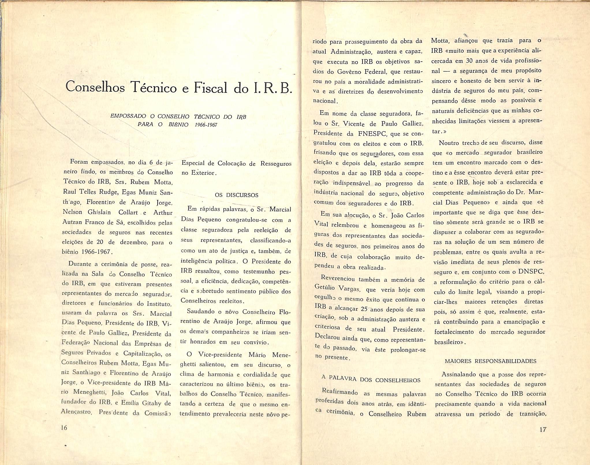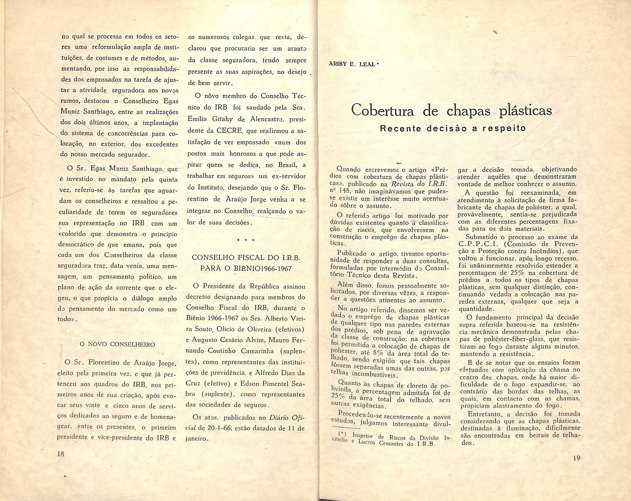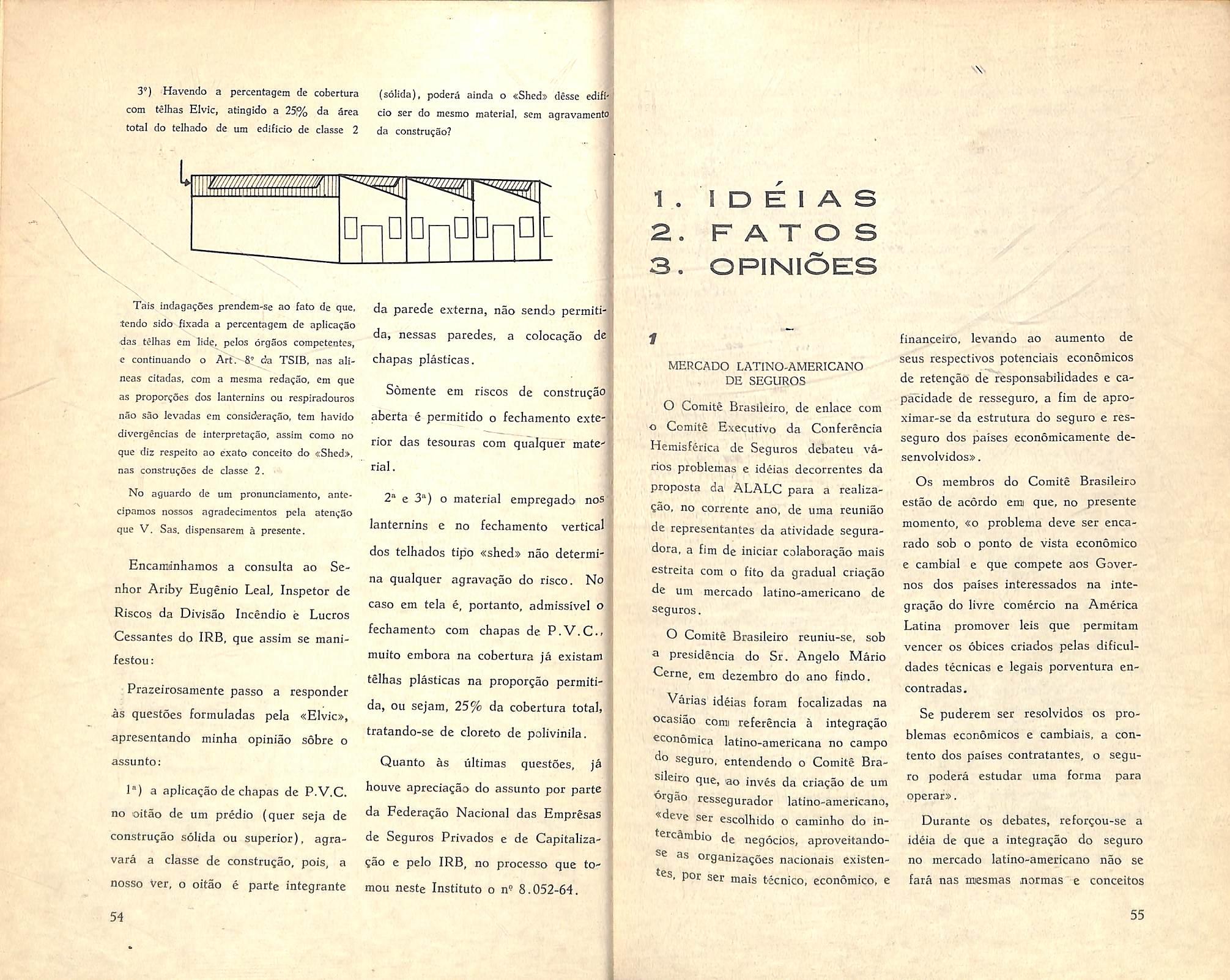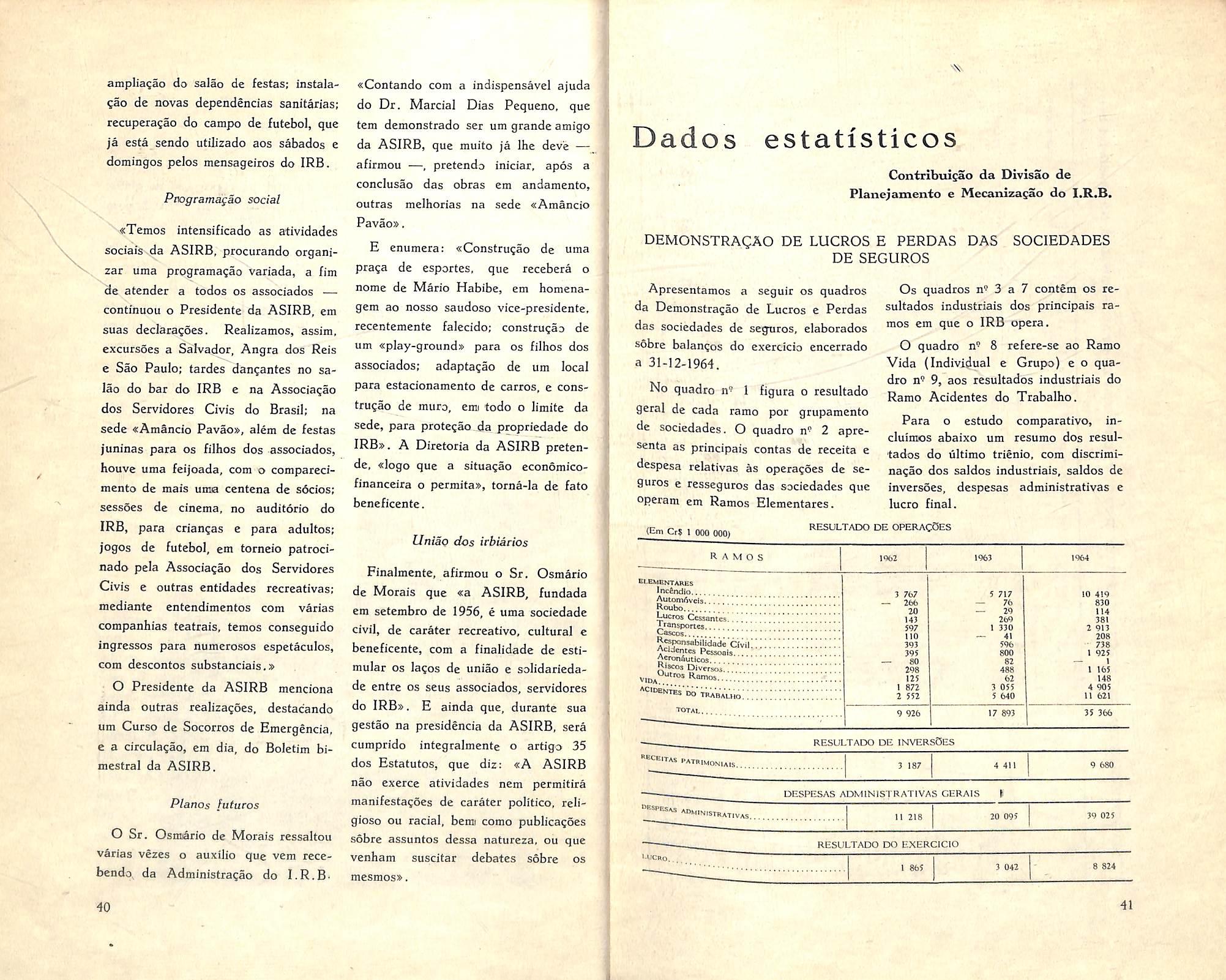 I O Atividades do I.R.B. em 1965 2 Pianos para 1966 8 Os Cursos do I.R.B. em 1965 10 Emprestimos imobiliarios do I.R.B. 13 Novo Ministro da Indiistria e do Comercio 15 Conselhos Tecnico e Fiscal do I.R.B. 16 Cobertura de chapas plasticas/Adby E. Leal 19 A Creche do I.R.B. 20 A reformula^ao da Previdencia Social/C. Gentile de Mello 23 Scguro de Credito na Europa/ Bruno de Mori 27 A Associa^ao dos Servidores do I.R.B. 38 Dados estatisticos: Lucros e perdas das Sociedades 41 Consultorio Tecnico 53 Id^ias, fatos e opinifies 55 Ties podgres