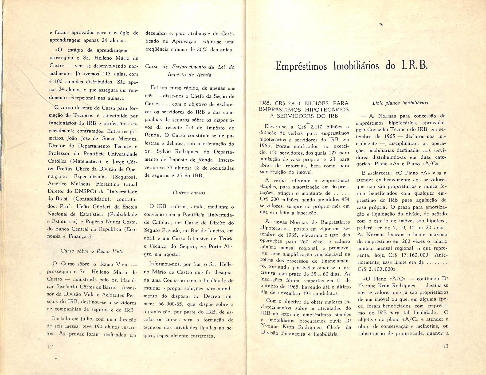 Alem disso, cabe mencionar, no pia no cultural, a manutengao de uma Biblioteca bem aparelhada e a reaiizagao de Cursos. Estes. cm 1965, foram OS de formagao de tecnicos do alto nivel, de esclarecimento da Lei do Imposto de Renda e o de nogoes basicas de seguros, os dois liltimos de acesso pcrmitido a funcionarios de companhias de seguros.